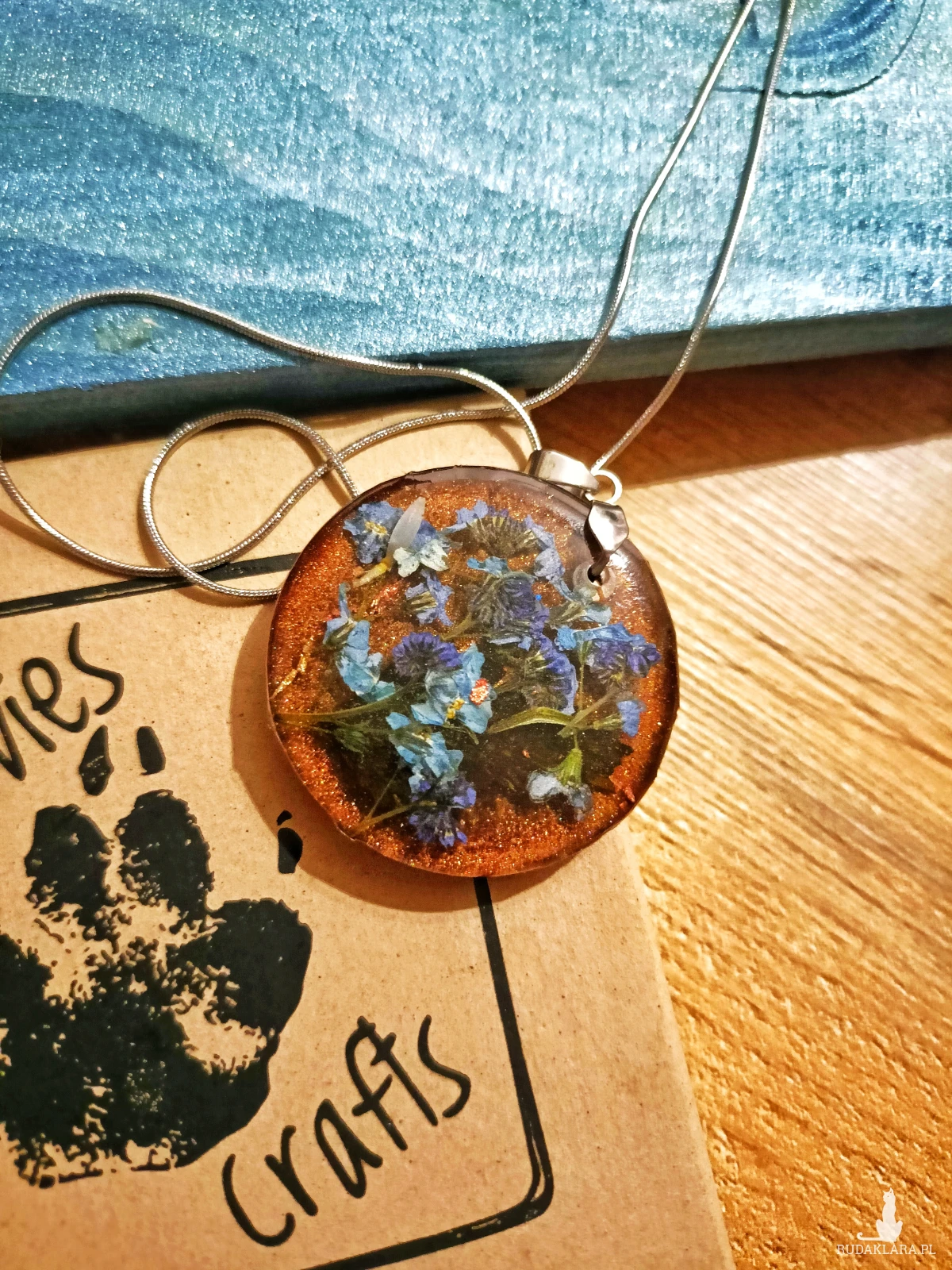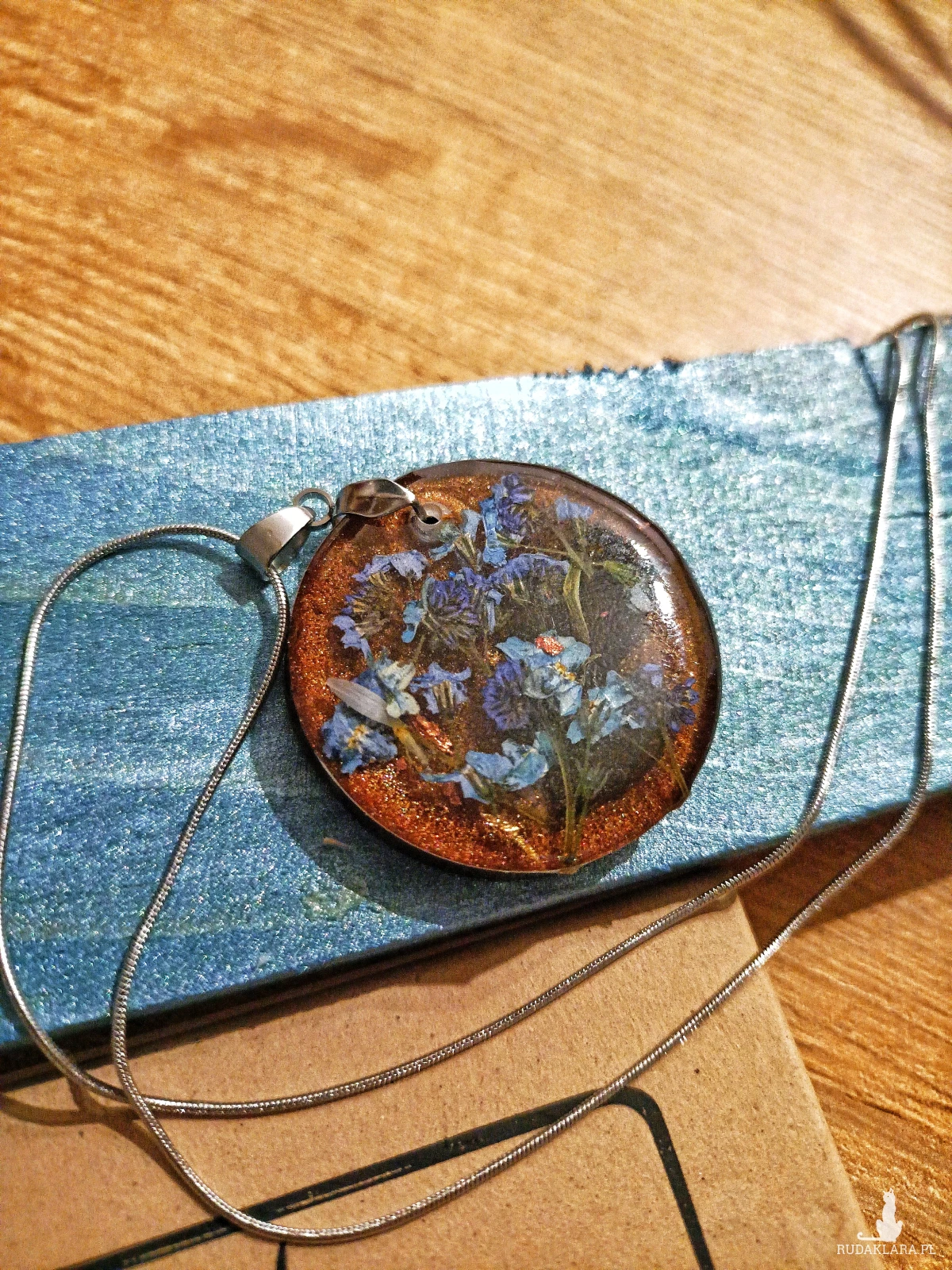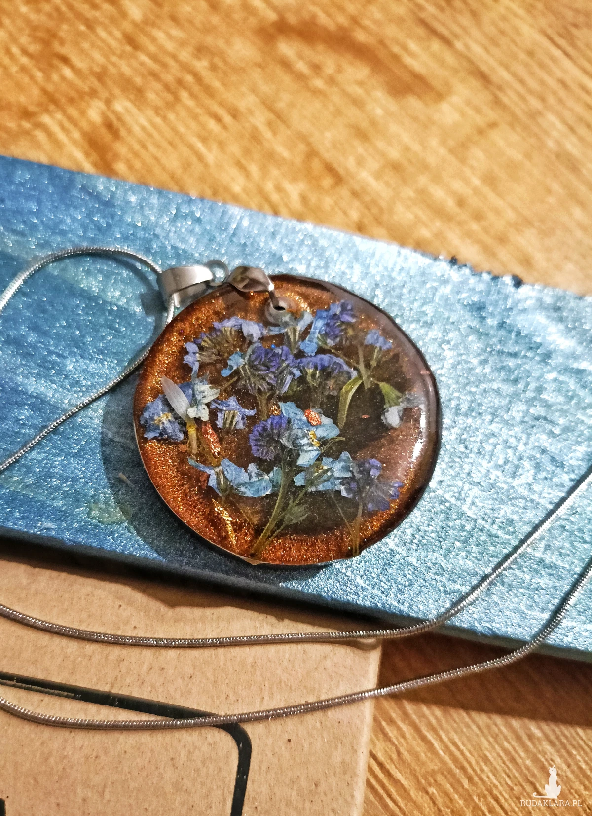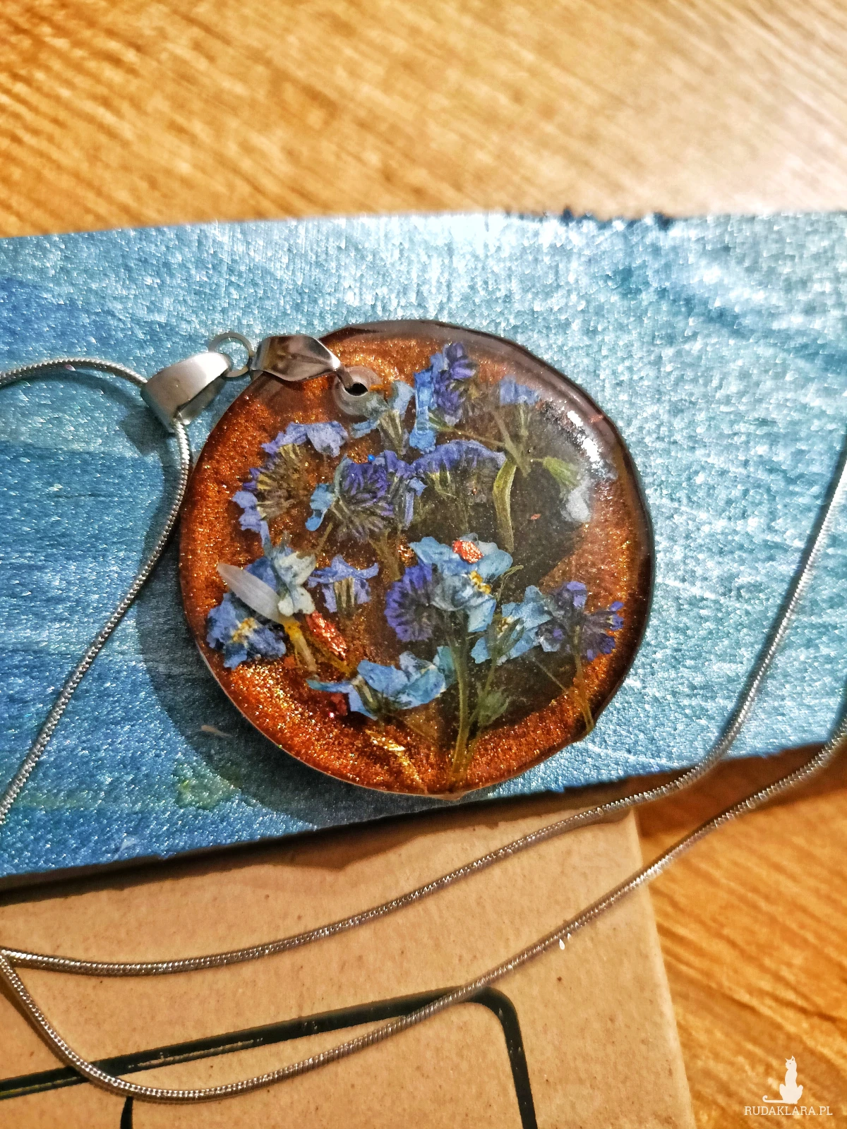 naszyjnik z żywicy handmade, naszyjnik z kwiatami, niezapominajki w żywicy, duży wisiorek z żywicy, biżuteria z suszonymi kwiatami, prezent dla kobiety, biżuteria Resin Pro, naszyjnik stal nierdzewna, naturalna biżuteria, naszyjnik boho, unikalna biżuteria ręcznie robiona