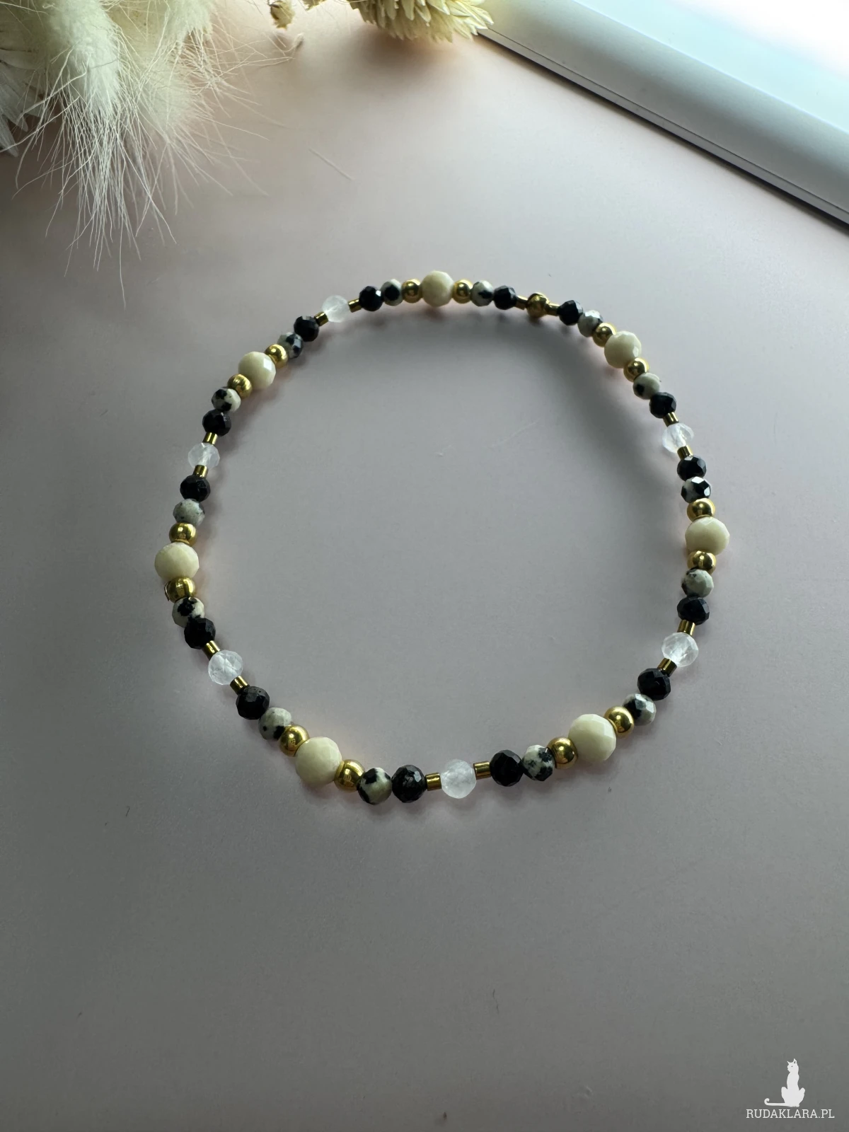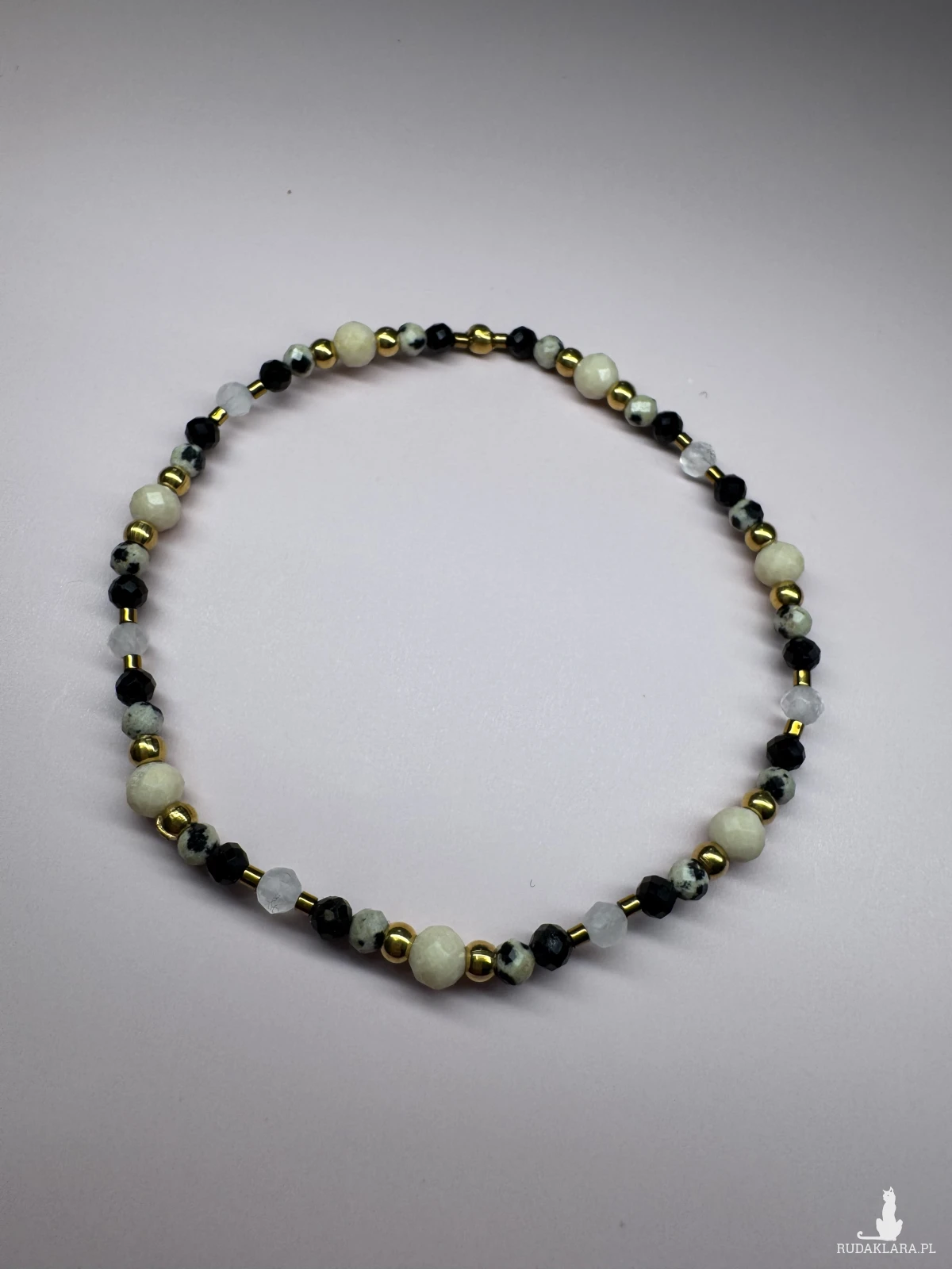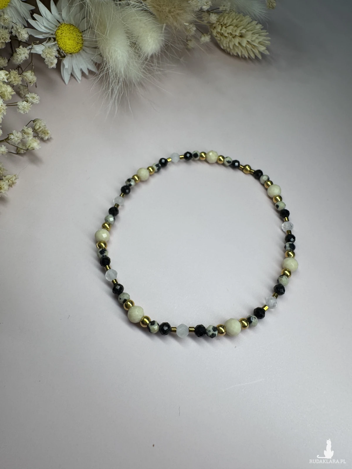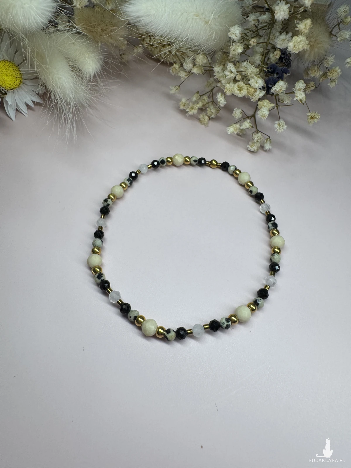 Połączenie ochronnego czarnego turmalinu, jaspisu dalmatyńskiego, kamienia księżycowego i kamienia rzecznego odpowiadających za kreatywność, energię i radość z życia.