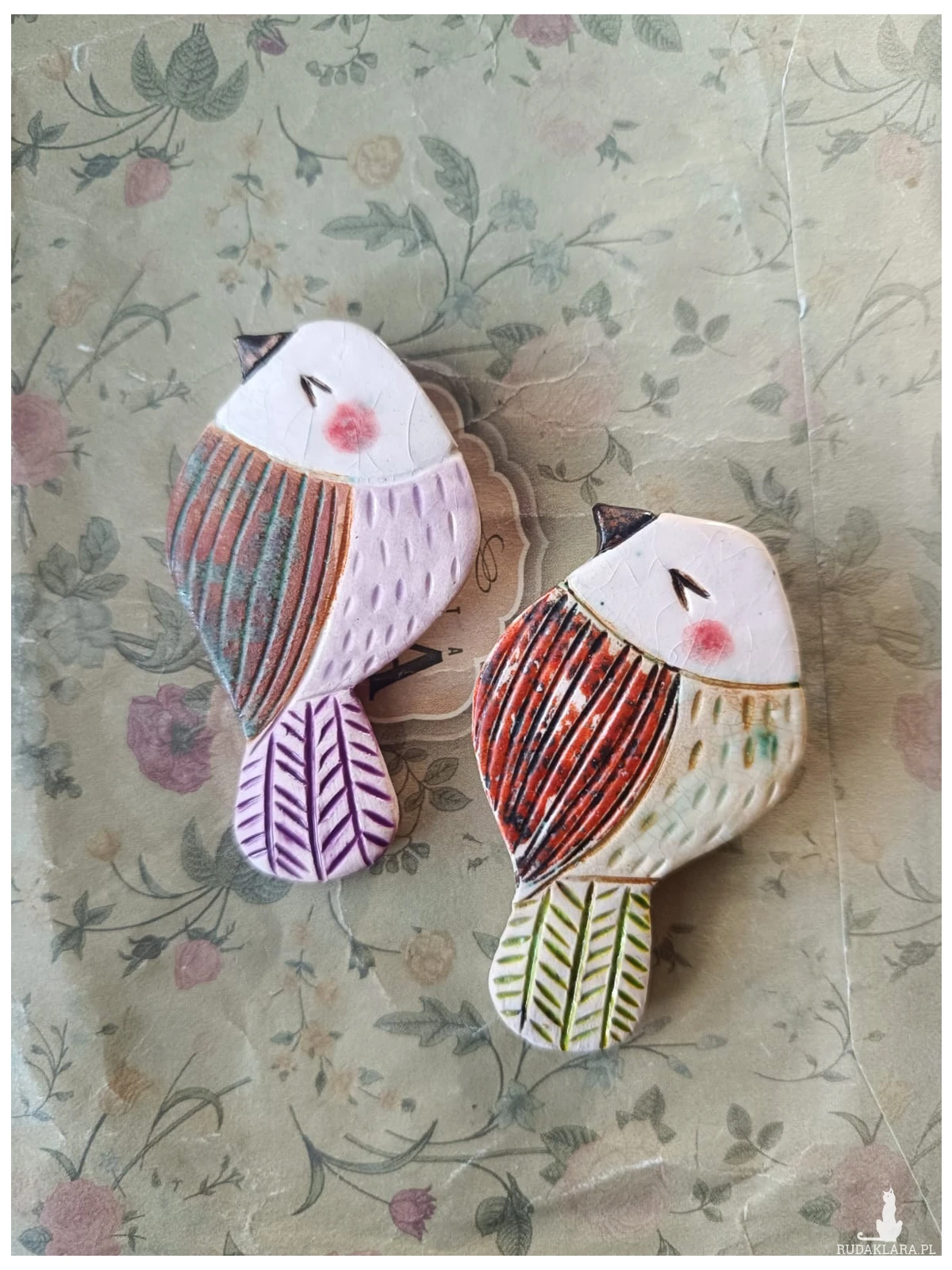 Broszki ptaszki wykonane z gliny szamotowej, wypalone na biskwit, a następnie szkliwione w temperaturze ok 1260 stopni C. O wymiarach ok; 6,5 cm x 3,5 cm. Serdecznie polecam wszystkim Paniom poszukującym nietuzinkowej biżuterii.
