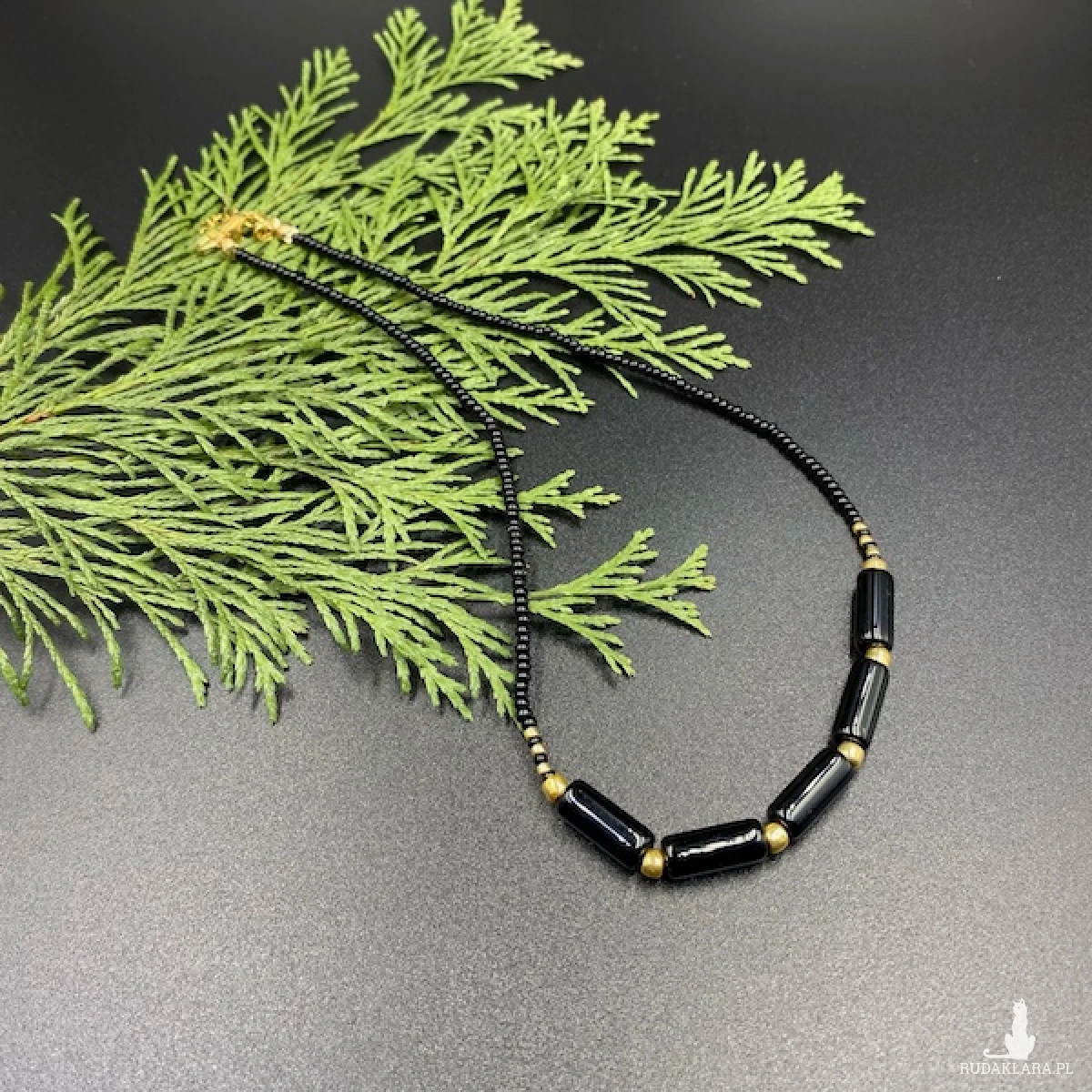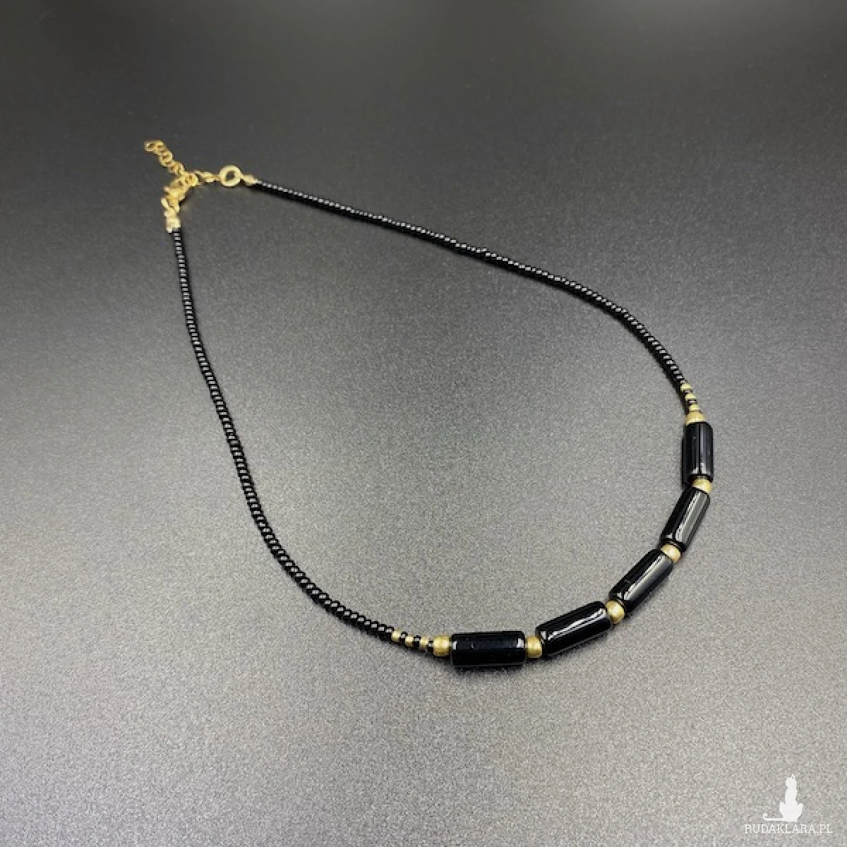 Krótki naszyjnik został wykonany ręcznie ze szklanych koralików w kolorze czarnym i złotym.