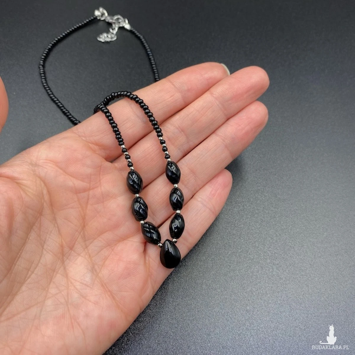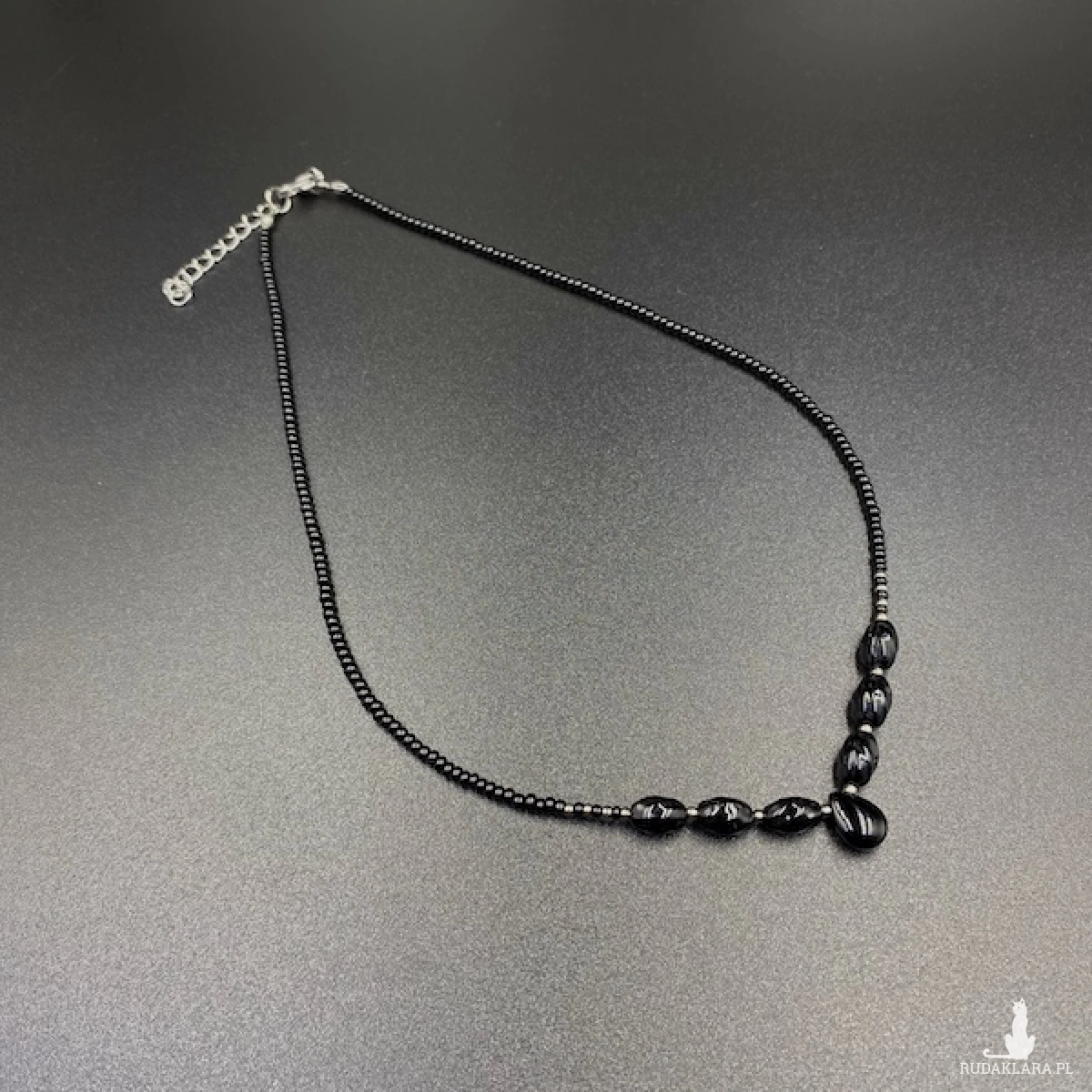 Krótki naszyjnik został wykonany ręcznie ze szklanych koralików w kolorze czarnym i srebrnym.