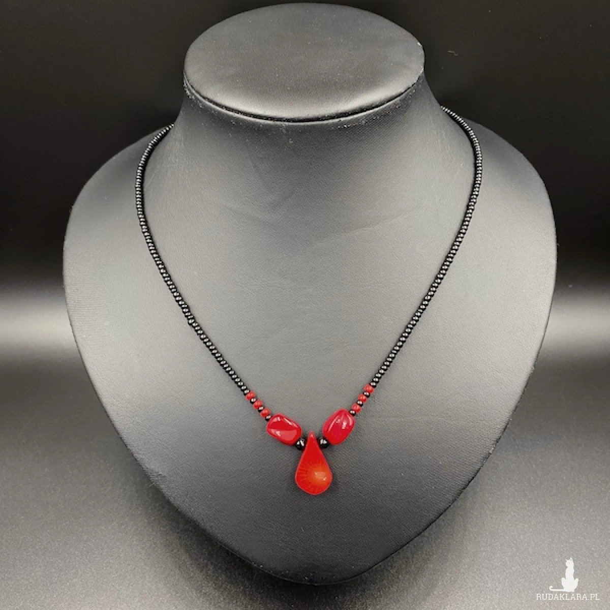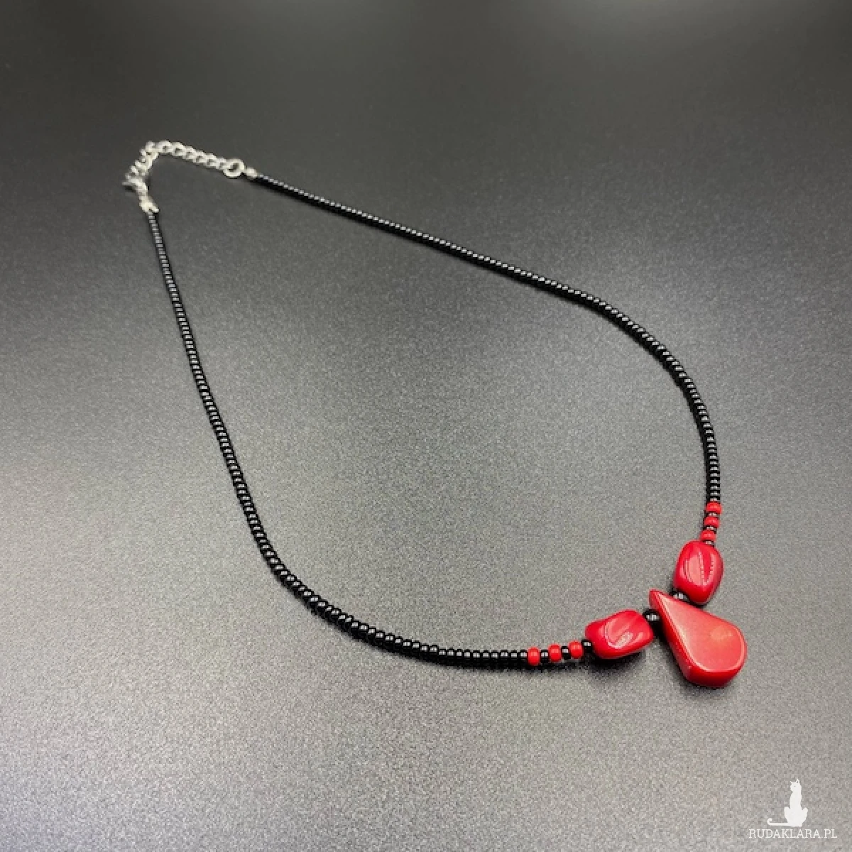 Krótki naszyjnik został wykonany ręcznie ze szklanych koralików i koralem czerwonym, w kolorze czarnym i czerwonym.