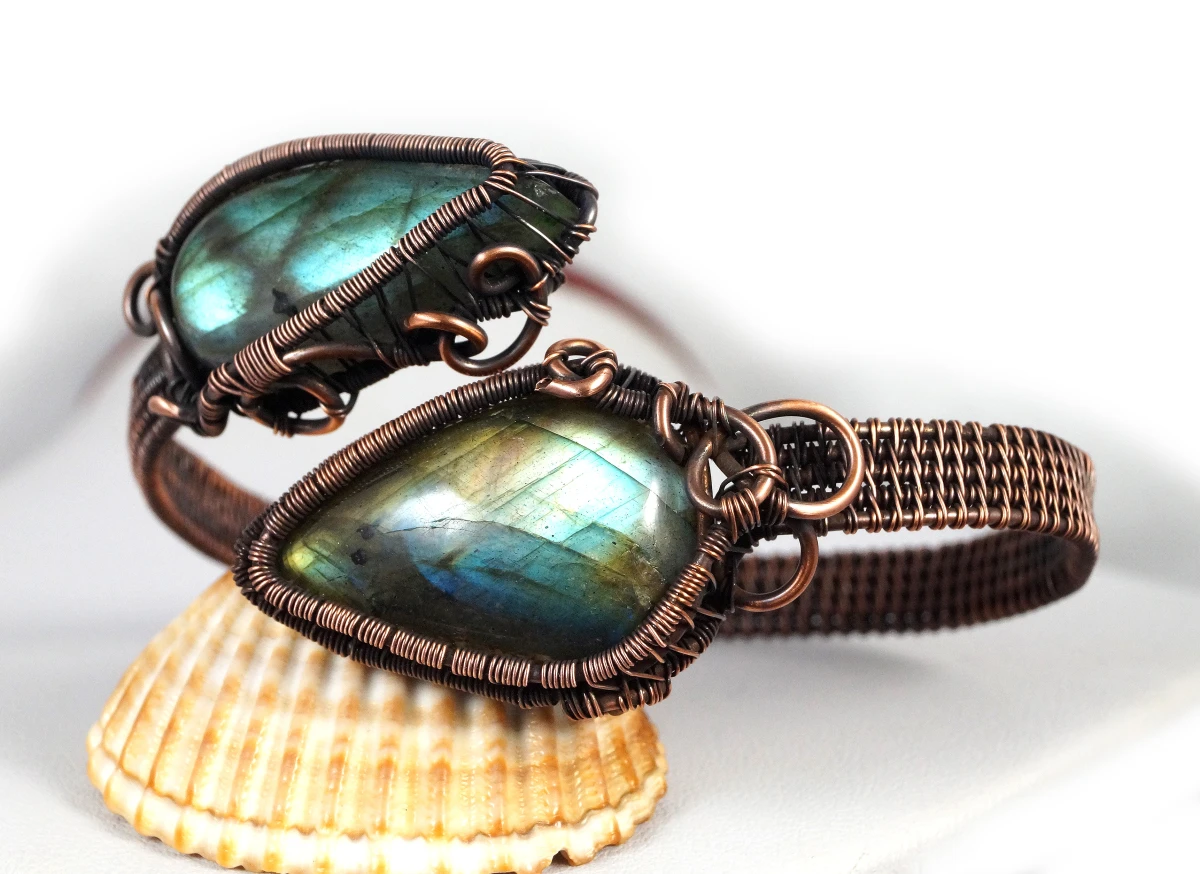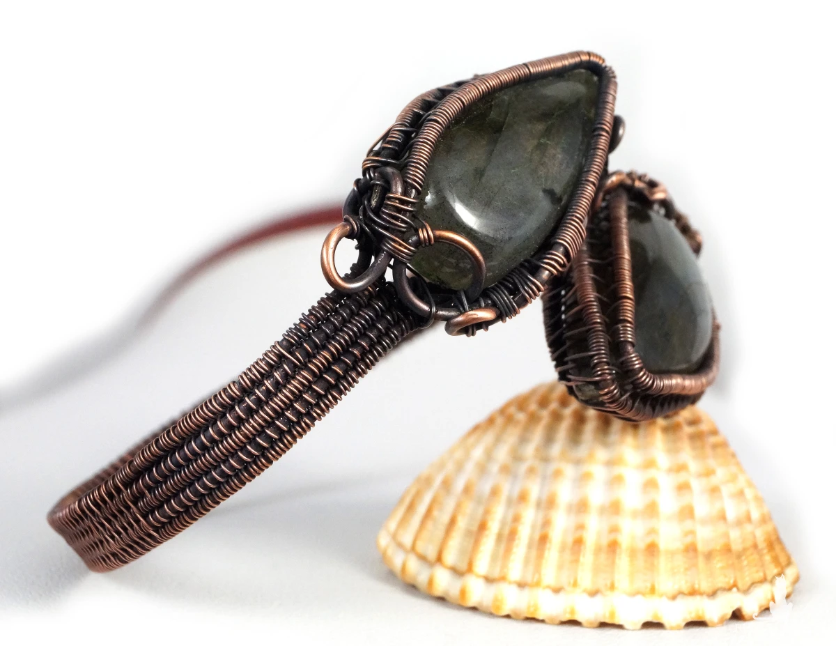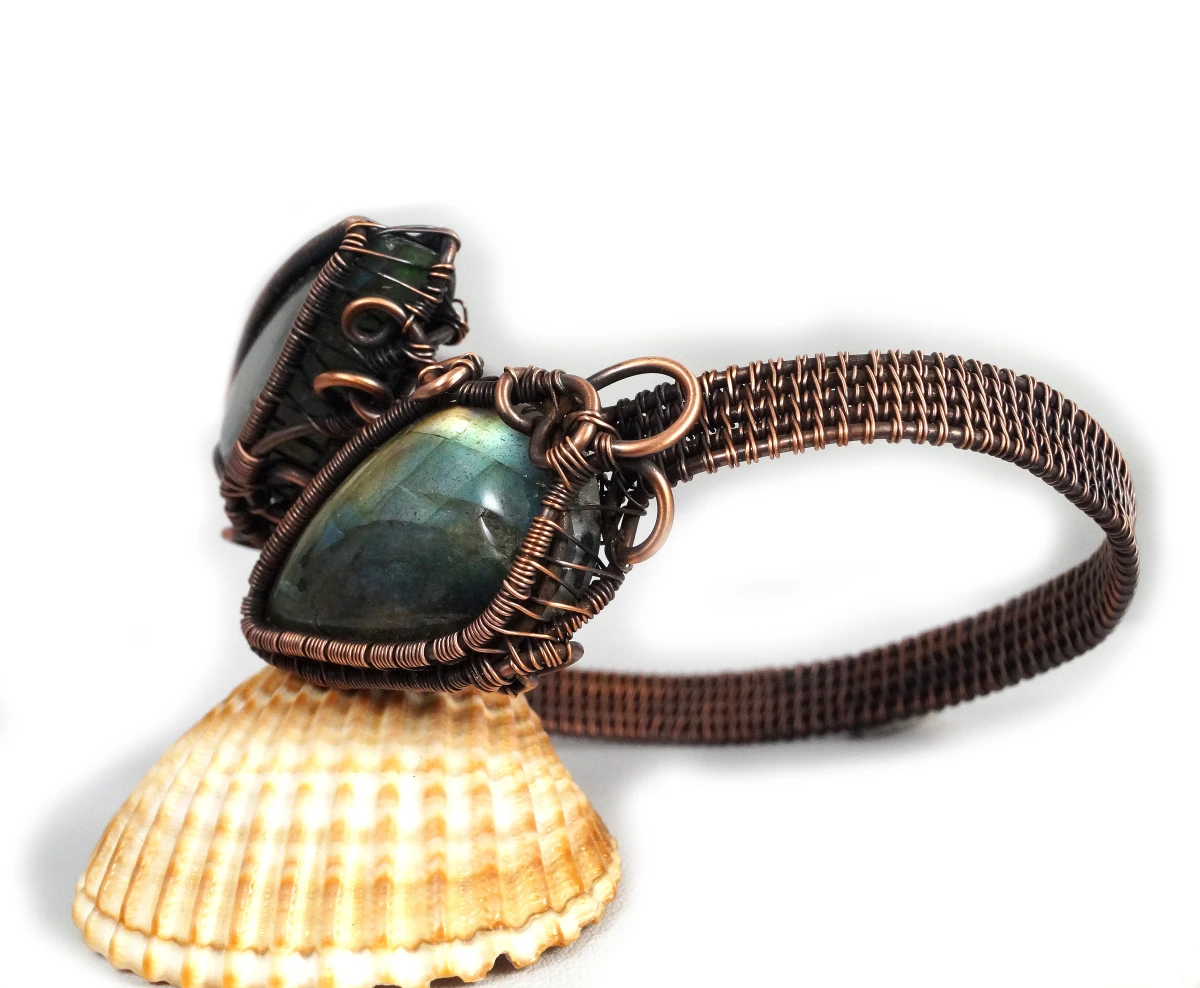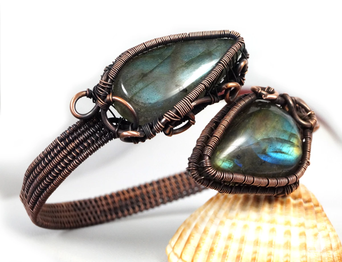 Bajeczna, misternie wykonana bransoletka z patynowanej miedzi z dwoma kaboszonami labradorytu w niebiesko żółtym kolorze. Bransoletka wykonana w bardzo pracochłonnej technice wire wrapped. Bransoletka regulowana.