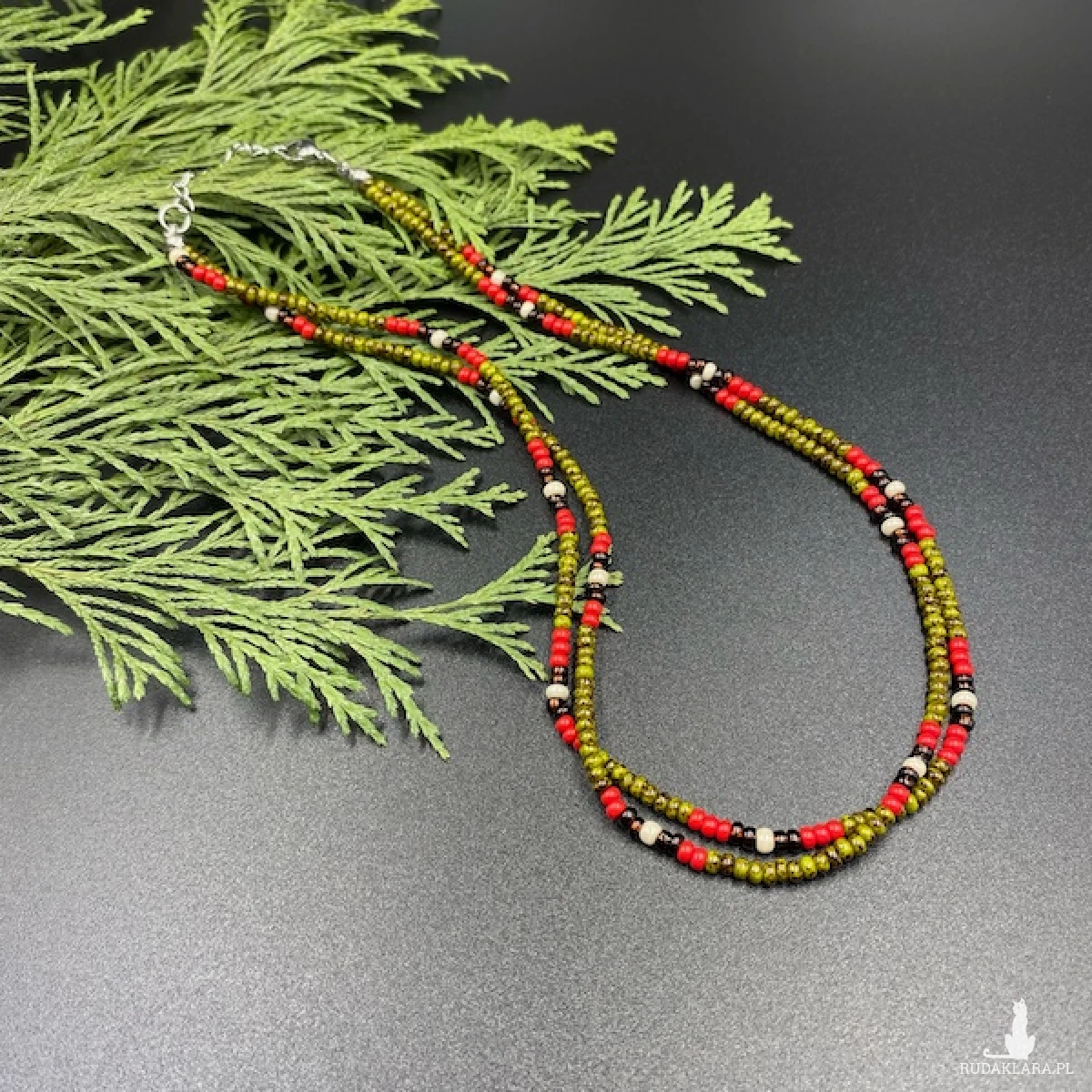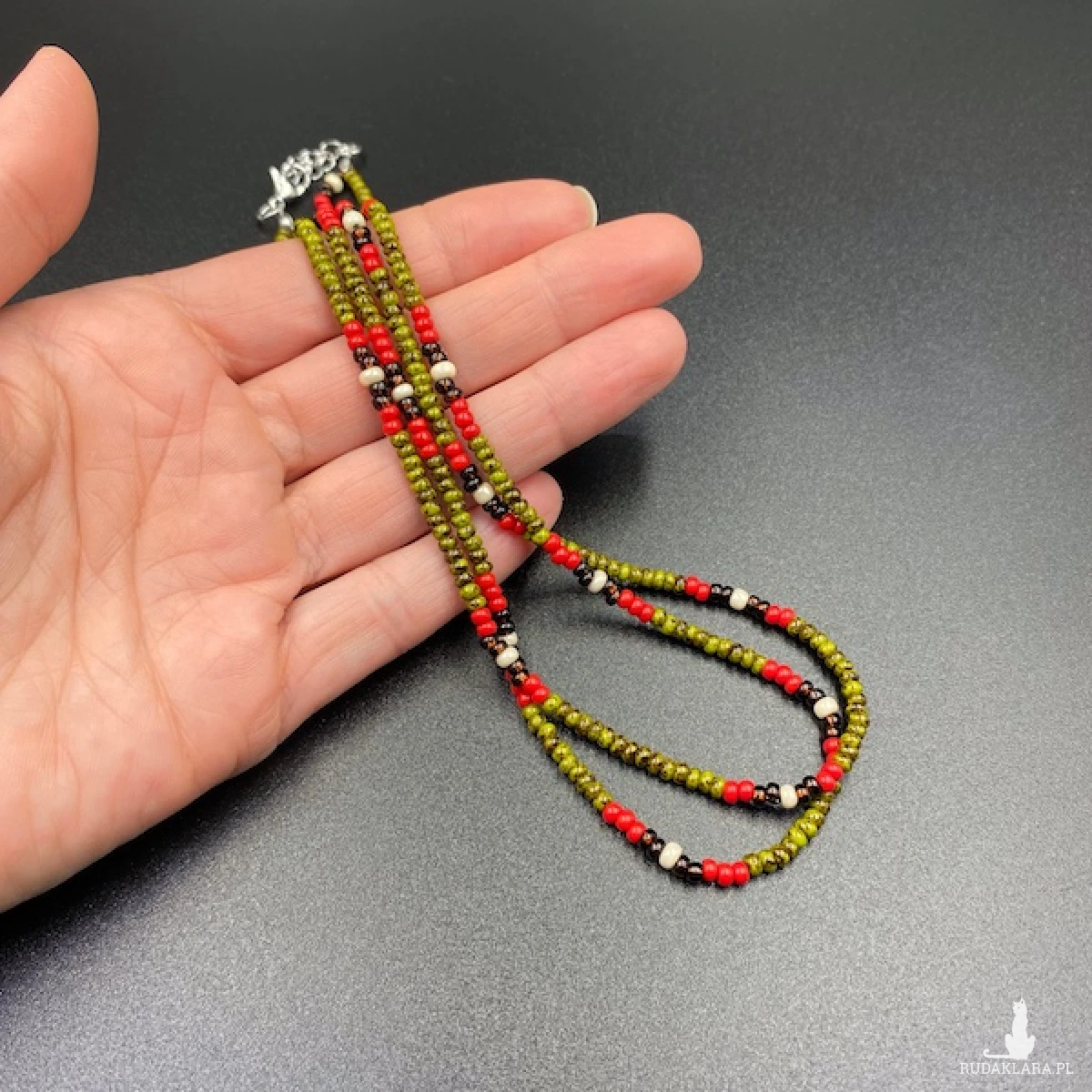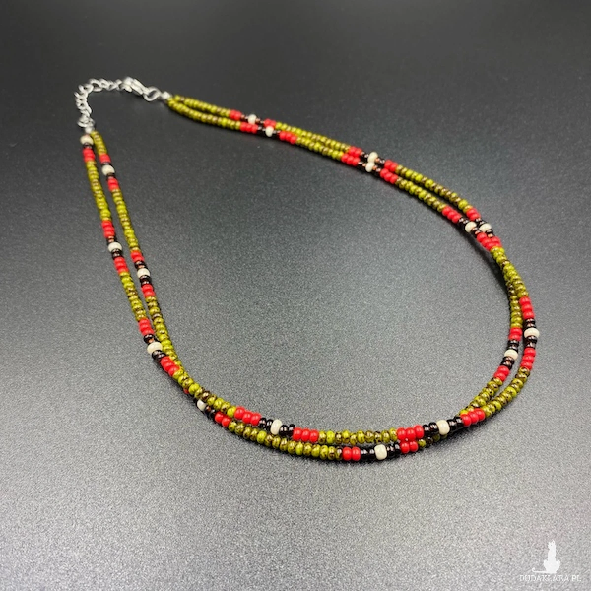 Krótki naszyjnik ( złożony z dwóch sznurów ) został wykonany ręcznie ze szklanych koralików w kolorze oliwkowej nakrapianej zieleni, czerwonym, bursztynowego brązu, kremowym.
