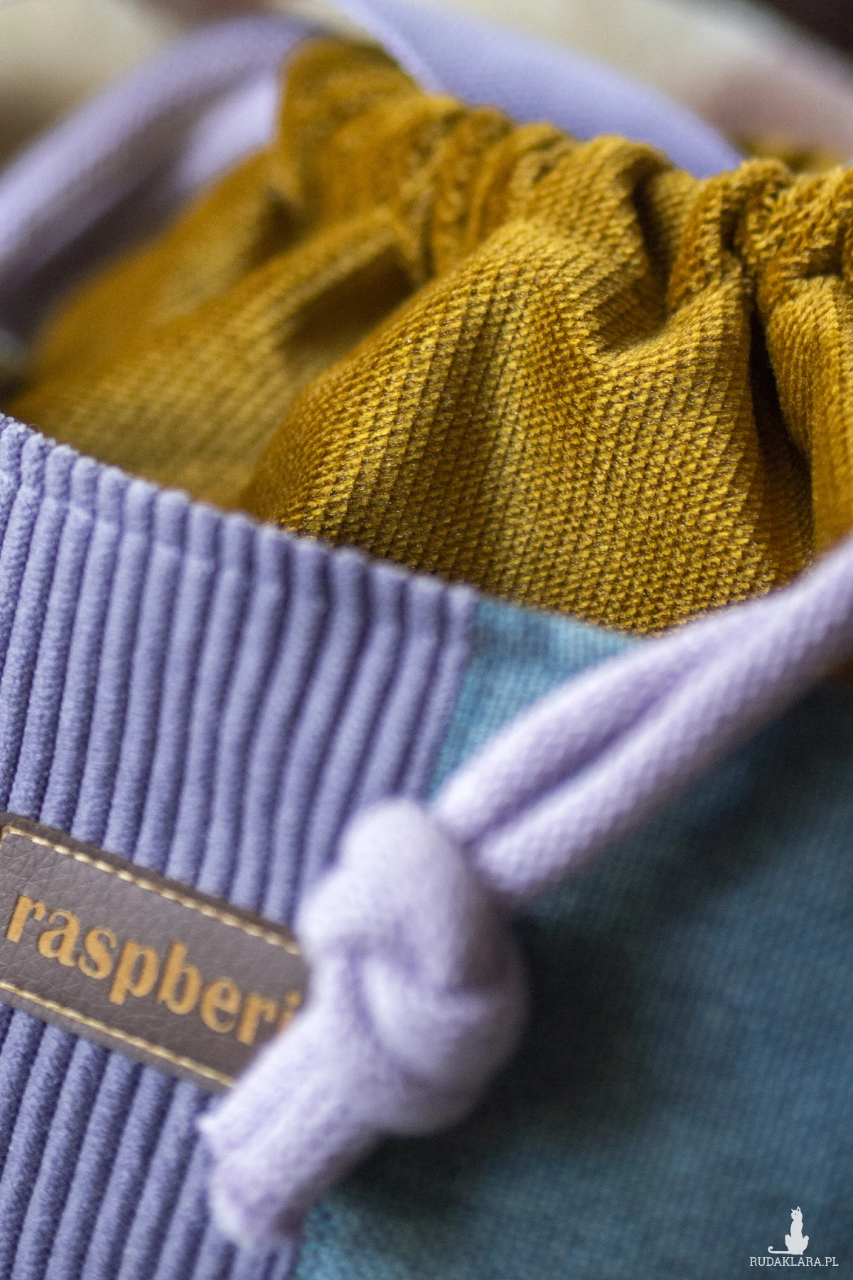 Całość ściągana grubym, bawełnianym sznurkiem w kolorze fioletowym.