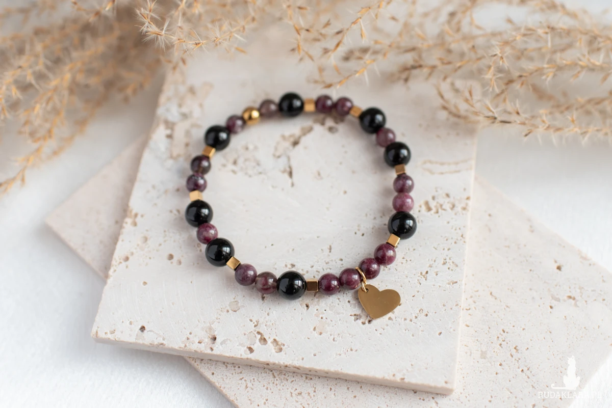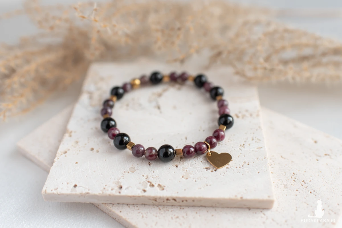 Amulet ochronny - bransoletka z turmalinu śliwkowego, onyksu oraz hematytu.