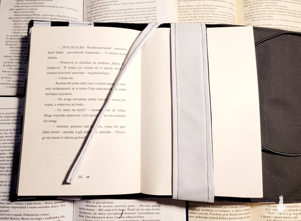 - zapięcie na gumkę, dzięki czemu książka się nie otwiera, a okładka dostosowuje się do grubości tomu;