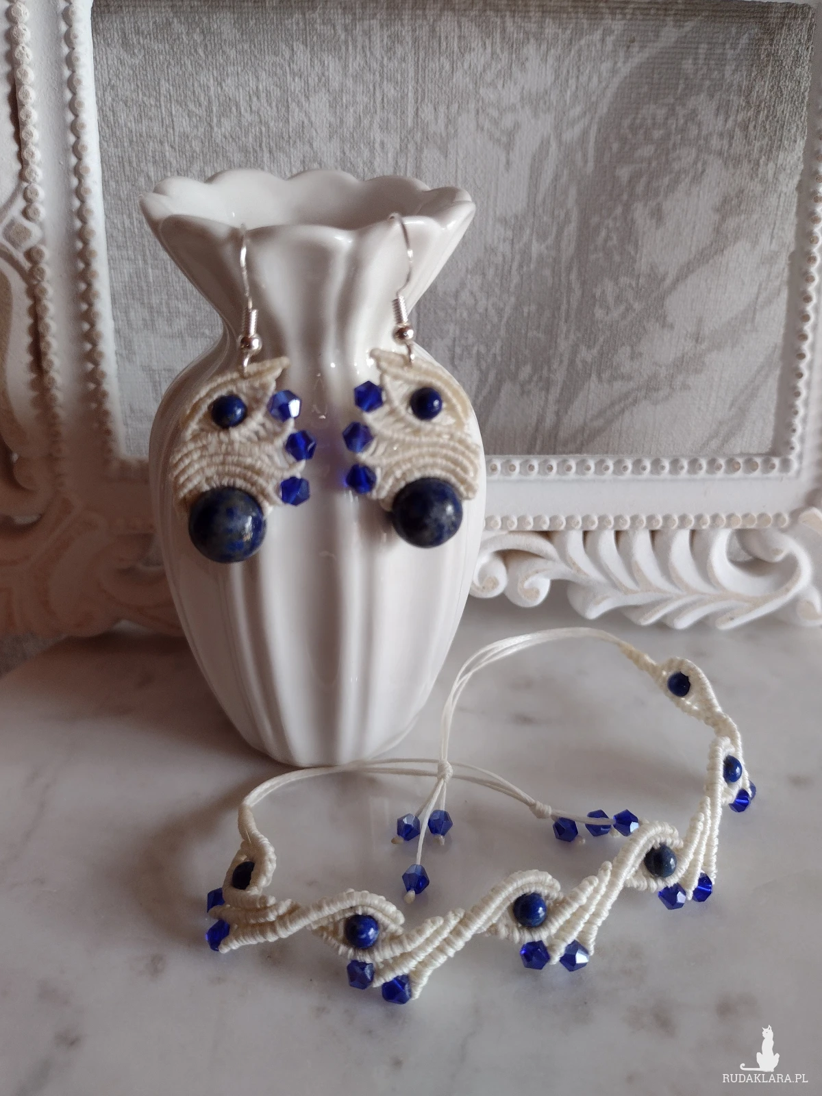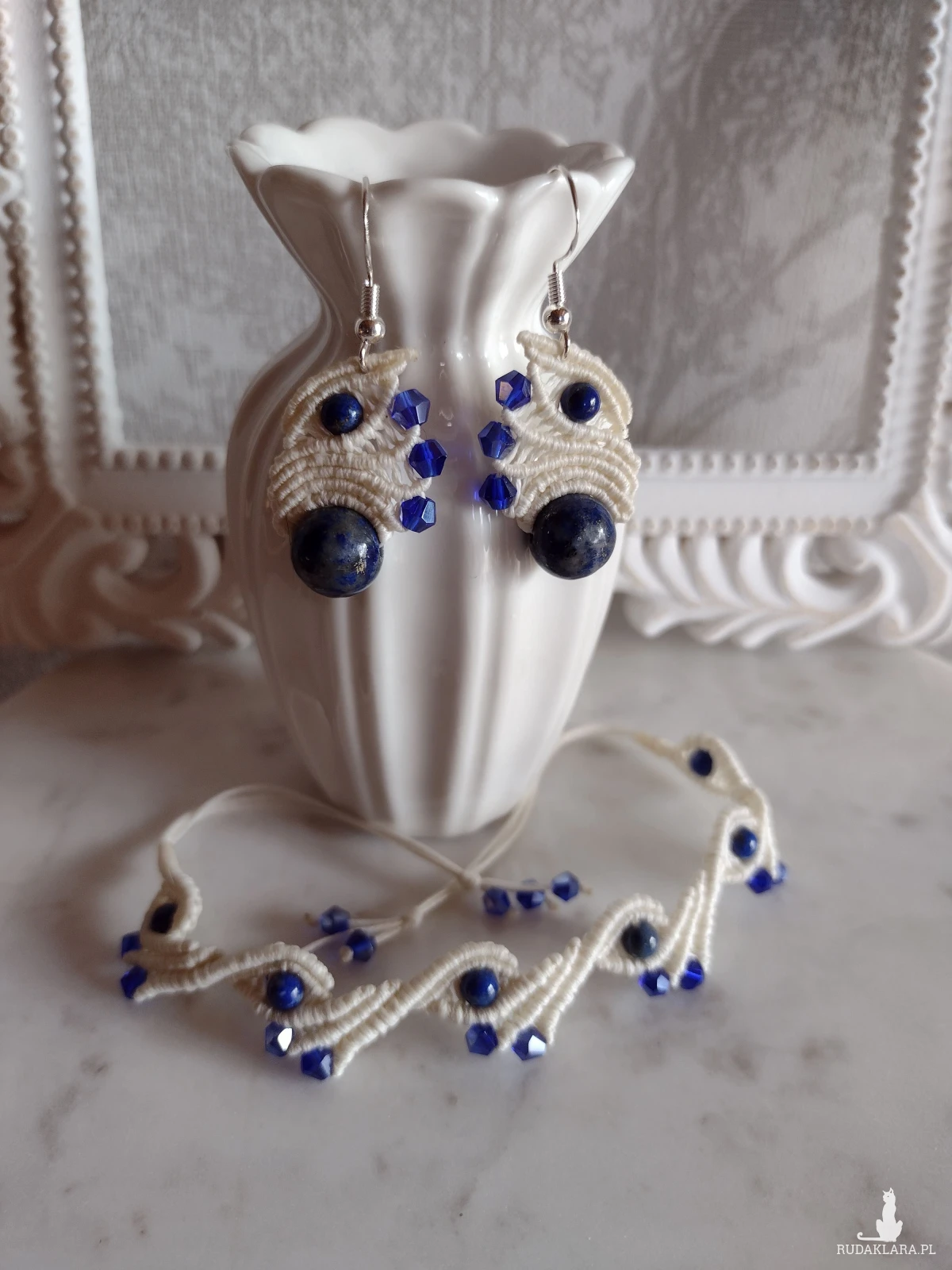 Ręcznie wykonany komplet biżuterii w technice mikromakramy, łączący naturalne kamienie lapis lazuli z delikatnymi, błyszczącymi kryształkami. Nitka ma ciepły, ecru odcień, który subtelnie podkreśla głęboki, intensywny niebieski kolor kamieni.
