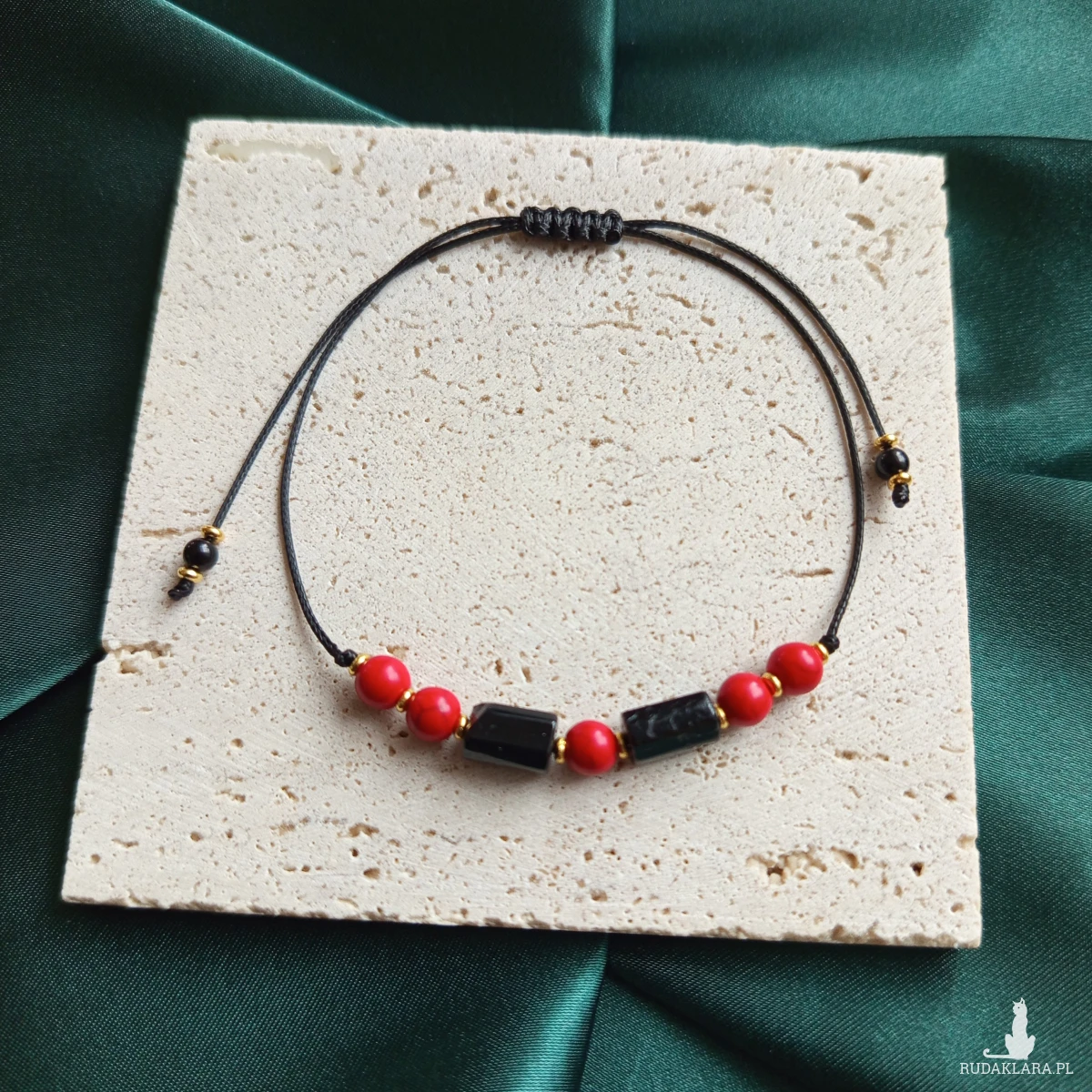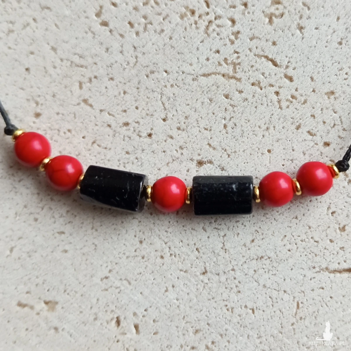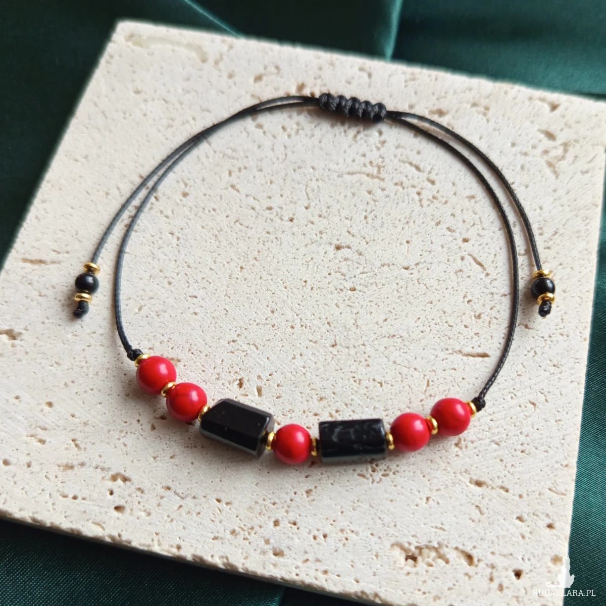 "Roma" - bransoletka wykonana z kamieni naturalnych i mocnego sznurka jubilerskiego. Regulacja za pomocą plecionki makramowej. Wyrazista dzięki połączeniu głębokiej czerni i radosnej czerwieni - klasyk, który nigdy nie wychodzi z mody.