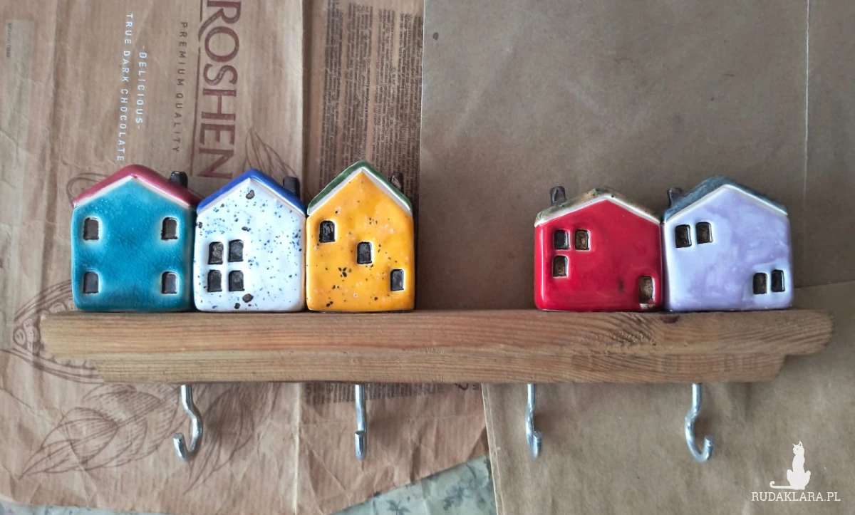 Wieszak z kolorowymi domkami, wykonanymi z ceramiki i wypalonymi w temp ok 1260 stopni C. O długości ok 20 cm. Polecam serdecznie.