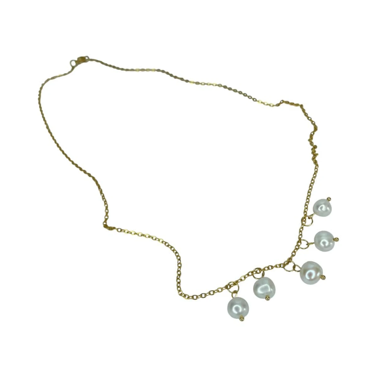 Naszyjnik z kolekcji „Morskie szepty pereł” to delikatny, pozłacany łańcuszek ozdobiony pięcioma naturalnymi perłami w formie charmsów. Każda z nich subtelnie porusza się przy ruchu, miękko odbijając światło i nadając całości lekkości oraz dynamicznego charakteru. Ciepły odcień złoconej bazy pięknie wydobywa naturalny blask pereł, tworząc spójną kompozycję łączącą nowoczesny minimalizm z ponadczasową elegancją. To biżuteria, która przyciąga spojrzenia w nienachalny sposób i harmonijnie uzupełnia zarówno proste, codzienne zestawy, jak i bardziej eleganckie stylizacje.