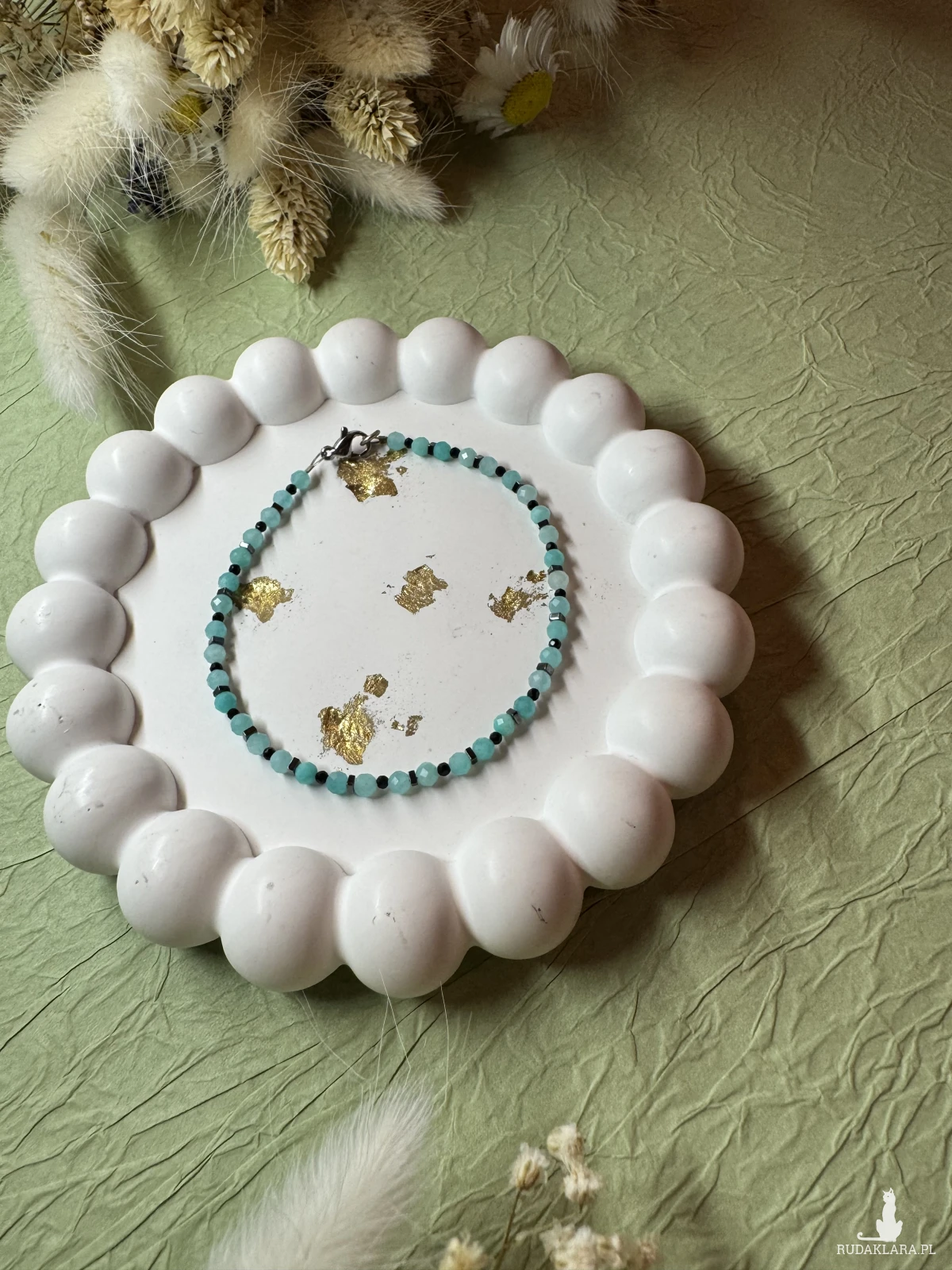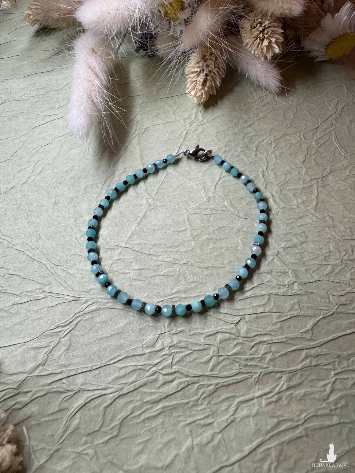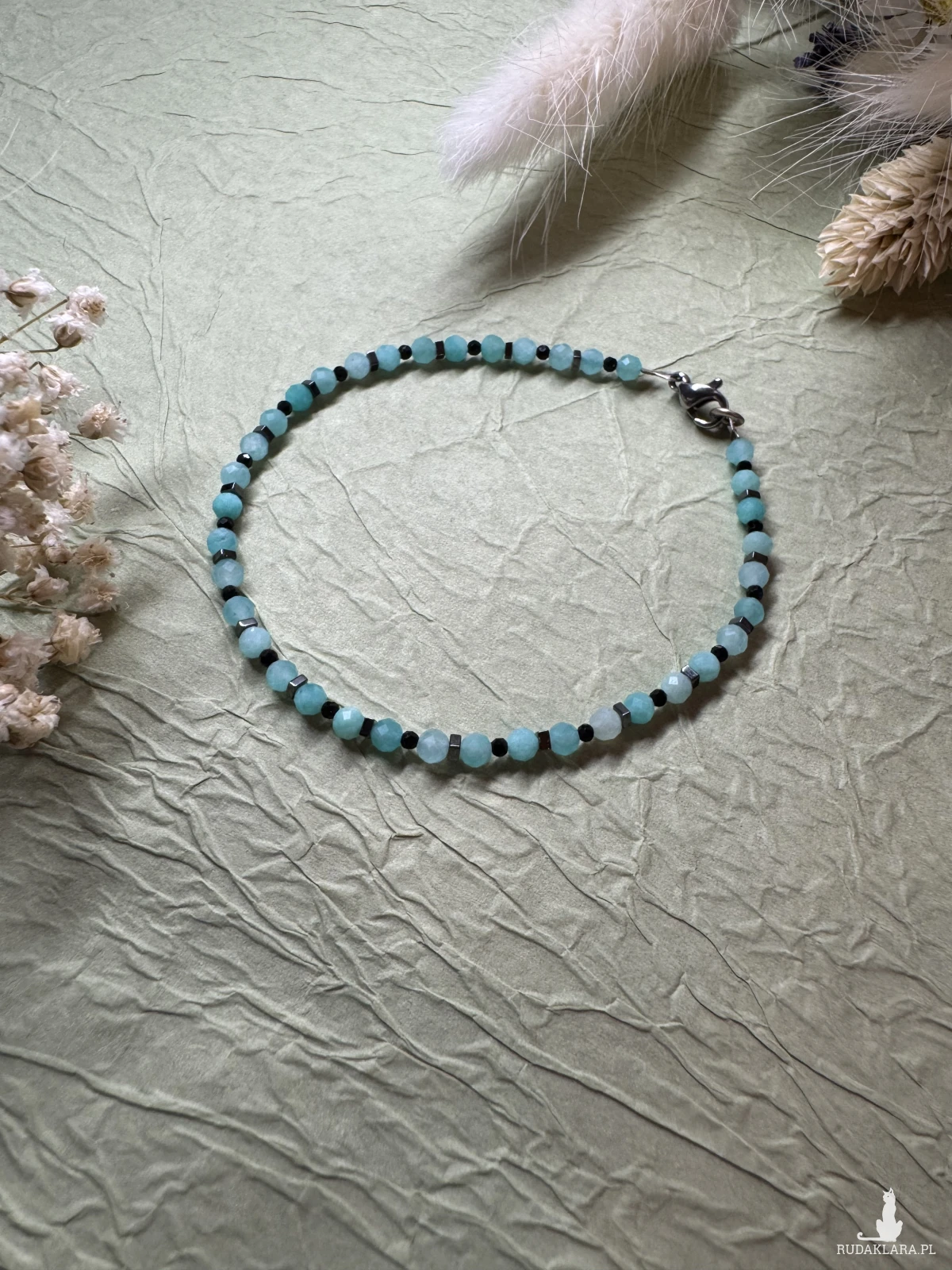 Bransoletka, na której przeplata się piękny zielono-niebieski amazonit z czarnym turmalinem. Wykończona ciemnym hematytem i zapięciem ze stali chirurgicznej. Bransoletka z kamieni ochronnych. Dodatkowo amazonit uważany jest za kamień harmonii, prawdy i odwagi.