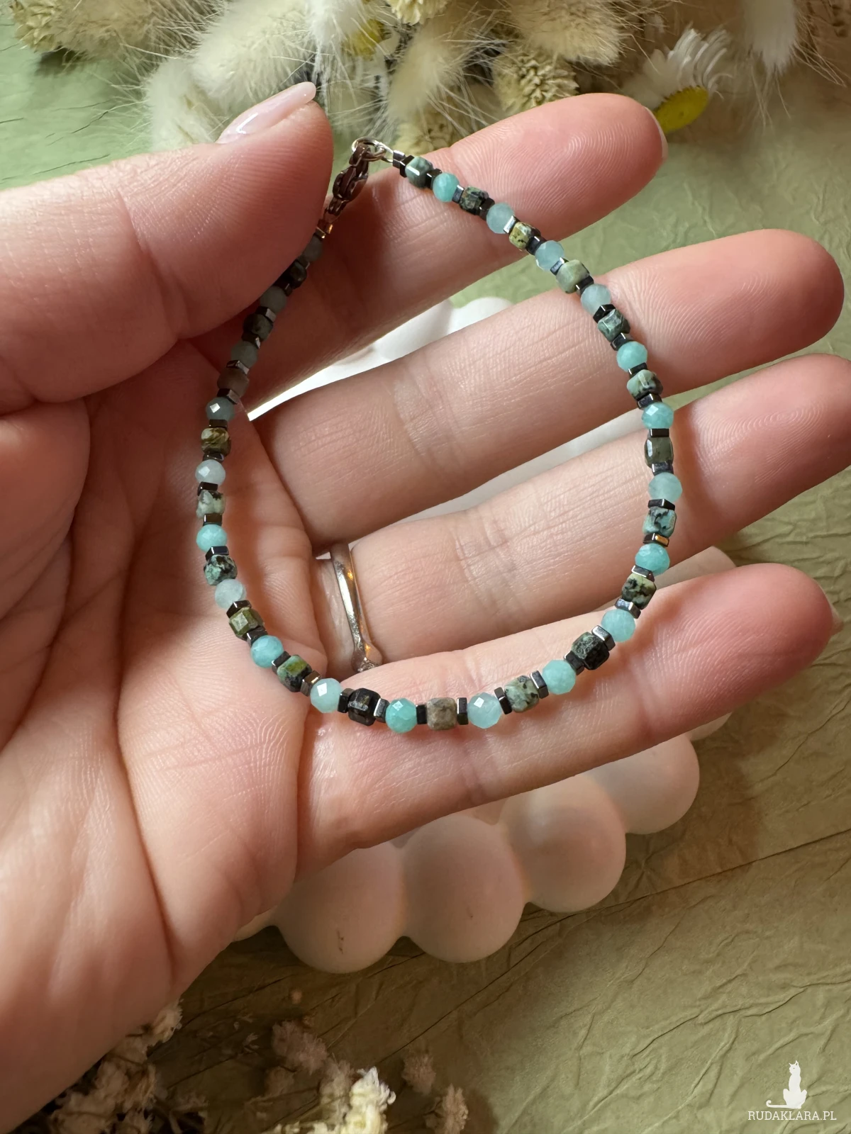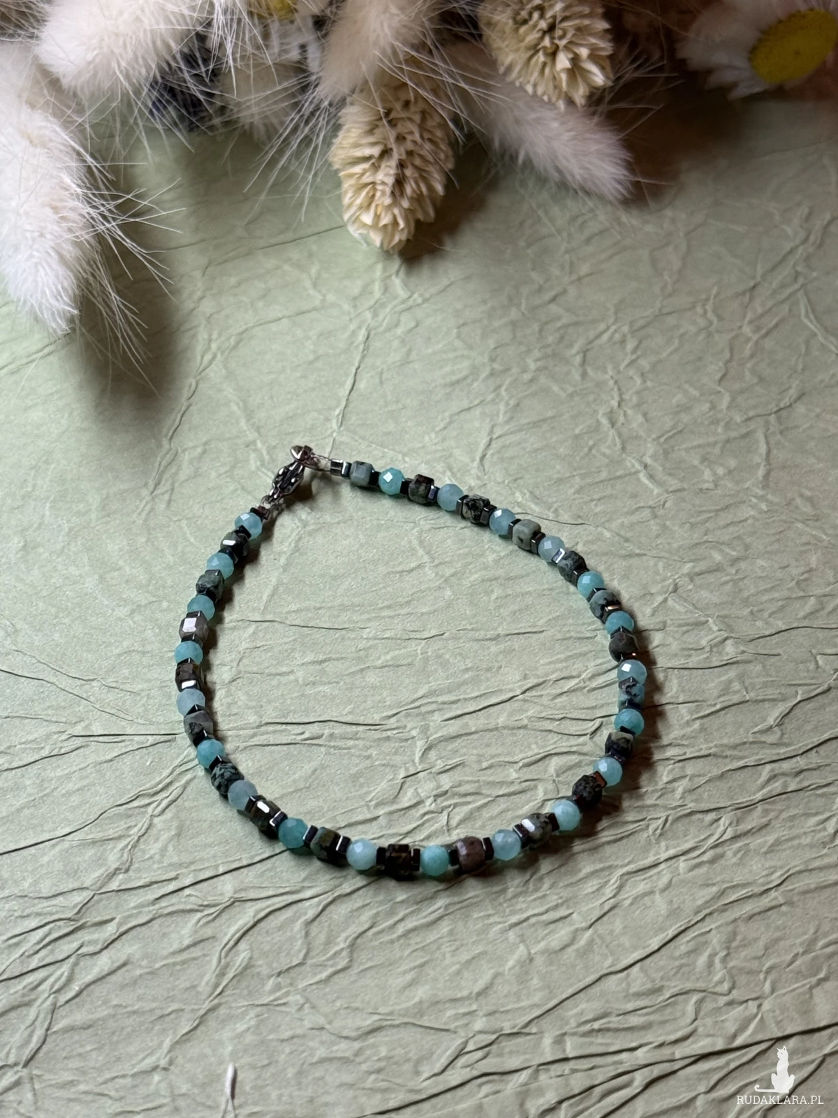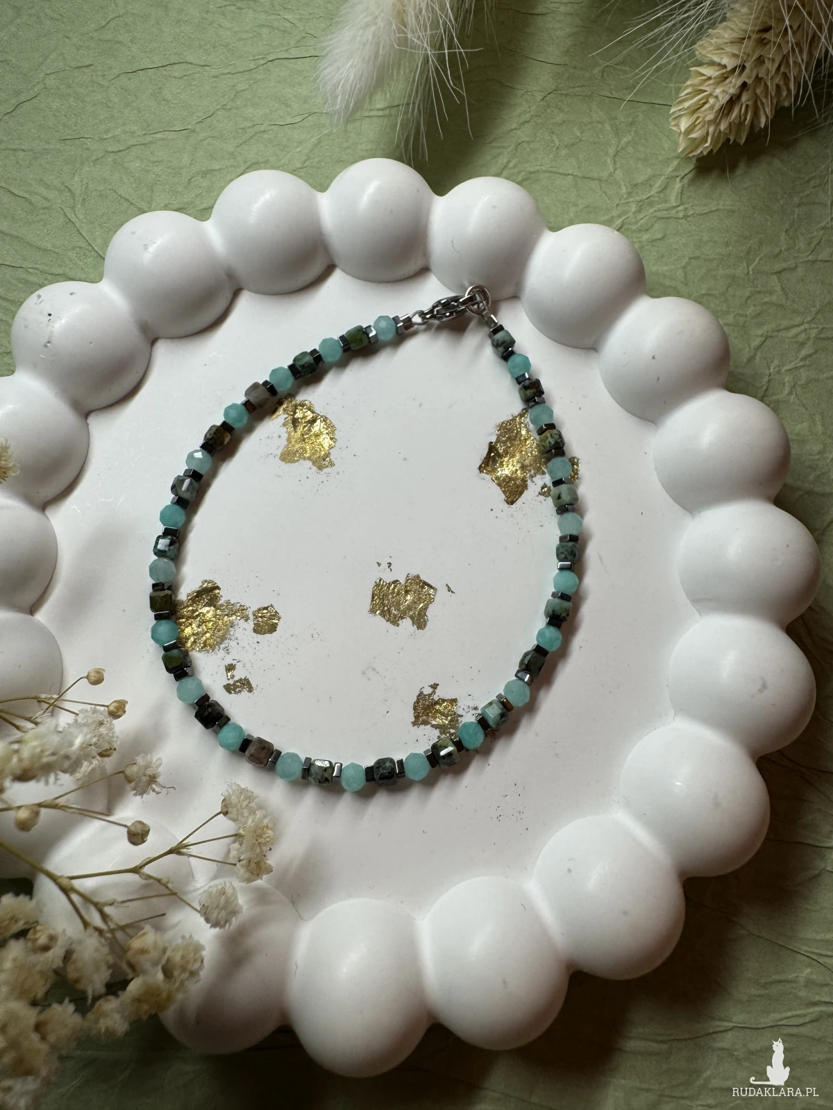 Piękna bransoletka w turkusowych odcieniach zrobiona z amazonitu i turkusu afrykańskiego. Całość wykończona jest ciemnym hematytem i zapięciem ze stali chirurgicznej w srebrnym kolorze