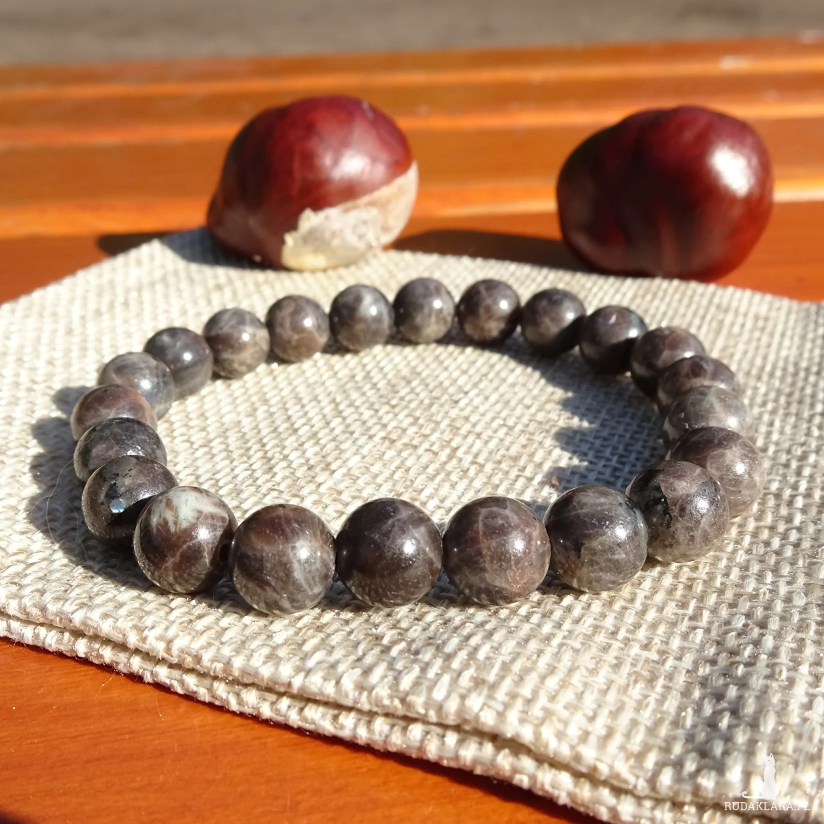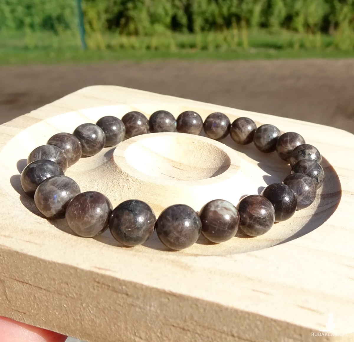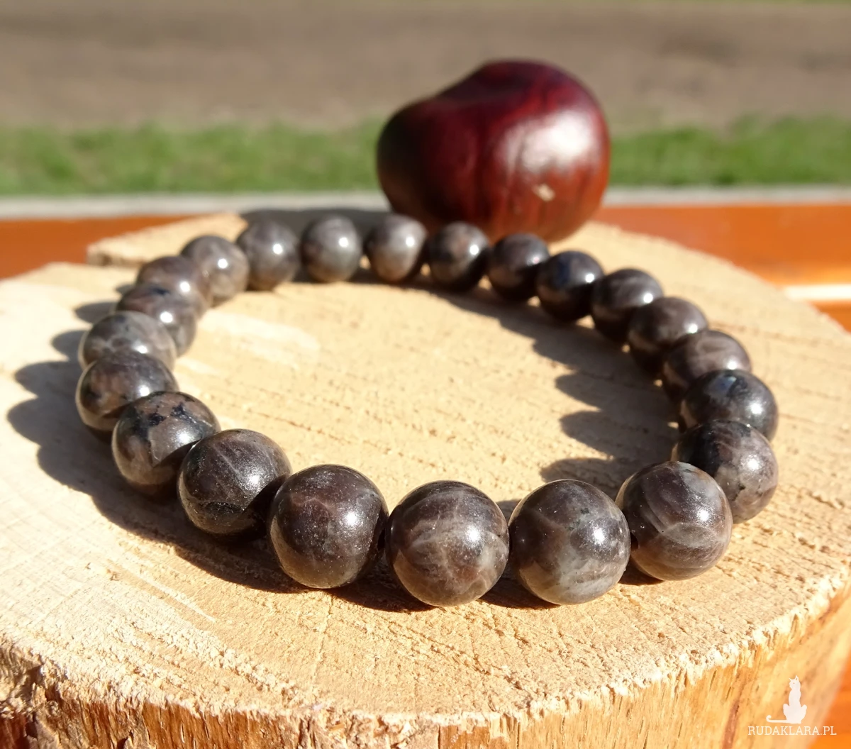 Bransoletka na gumce z gładkich kulek spektrolitu kawowego
