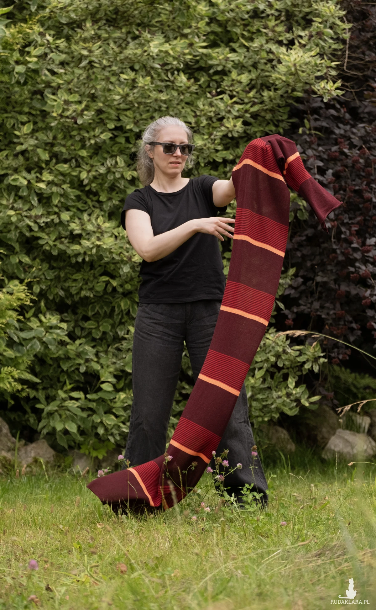 Wykonany na ręcznej maszynie dziewiarskiej.