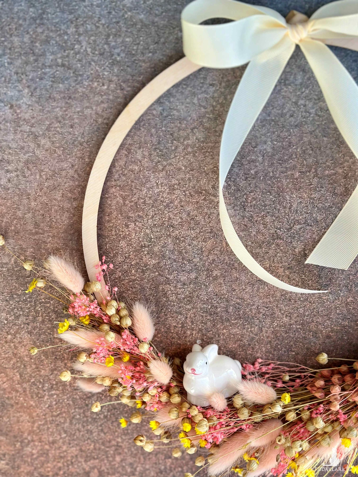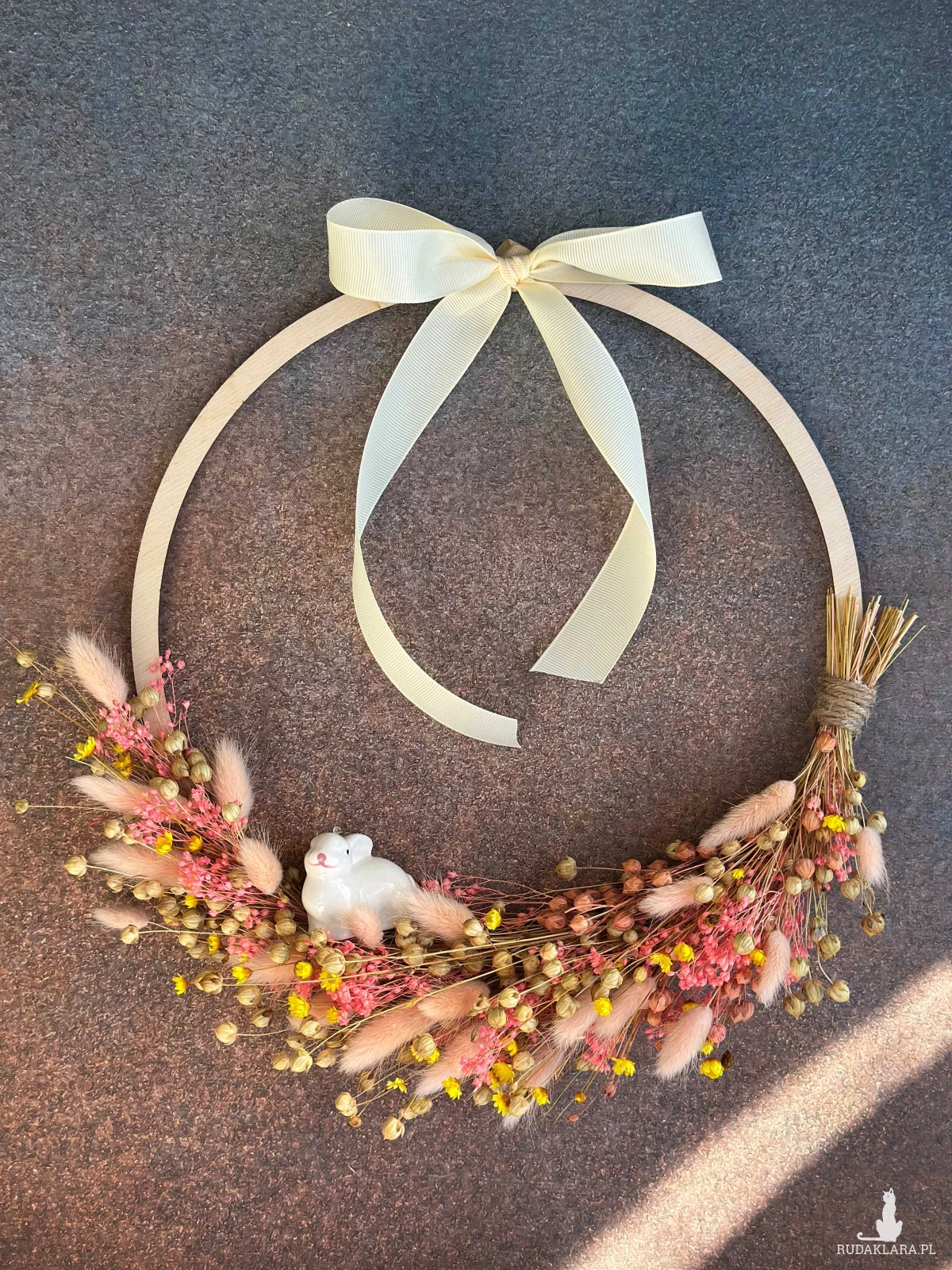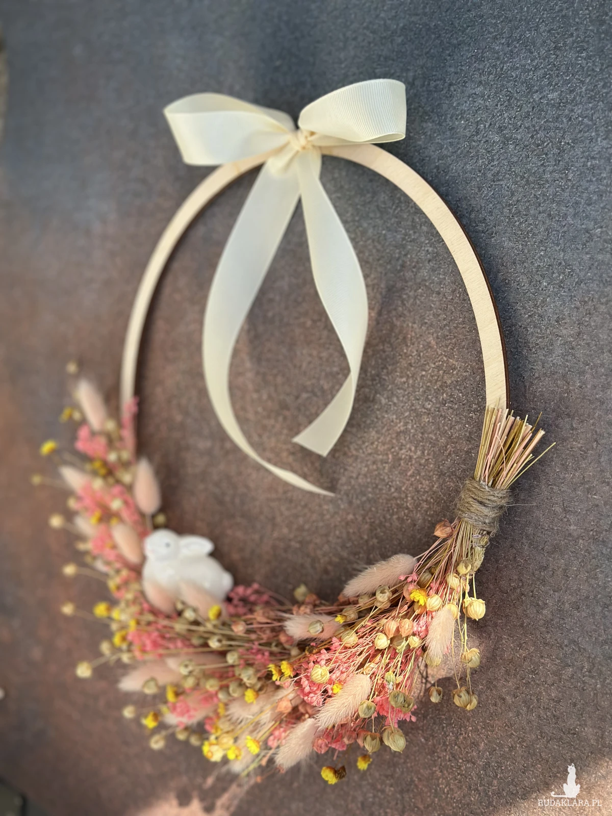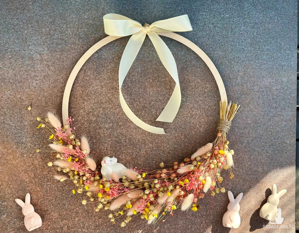 Naturalny wianek z stworzony z suszonych roślin z dekoracyjną, ceramiczną figurką króliczka.