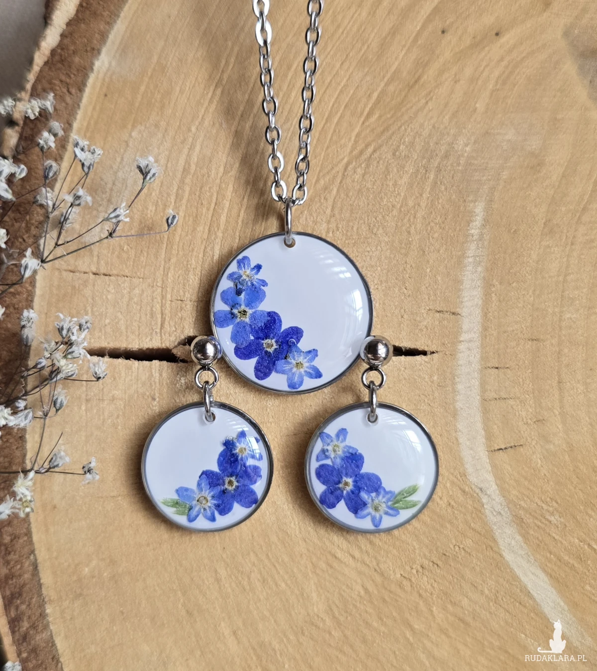 Oferuję Państwu unikalną biżuterię. Komplet jest wykonany z suszonych kwiatów i żywicy epoksydowej. Biżuteria jest wspaniałym i oryginalnym prezentem na lata.