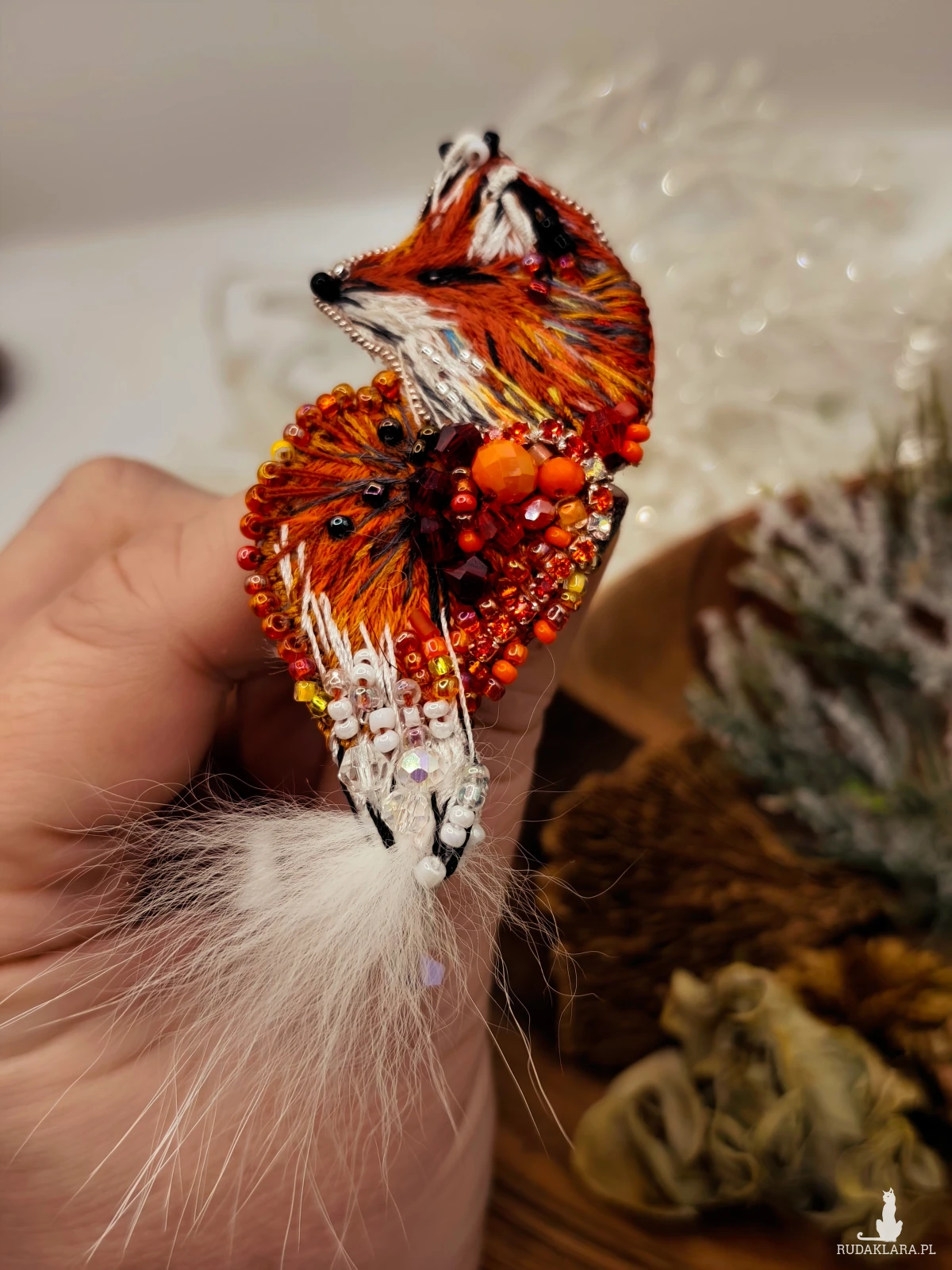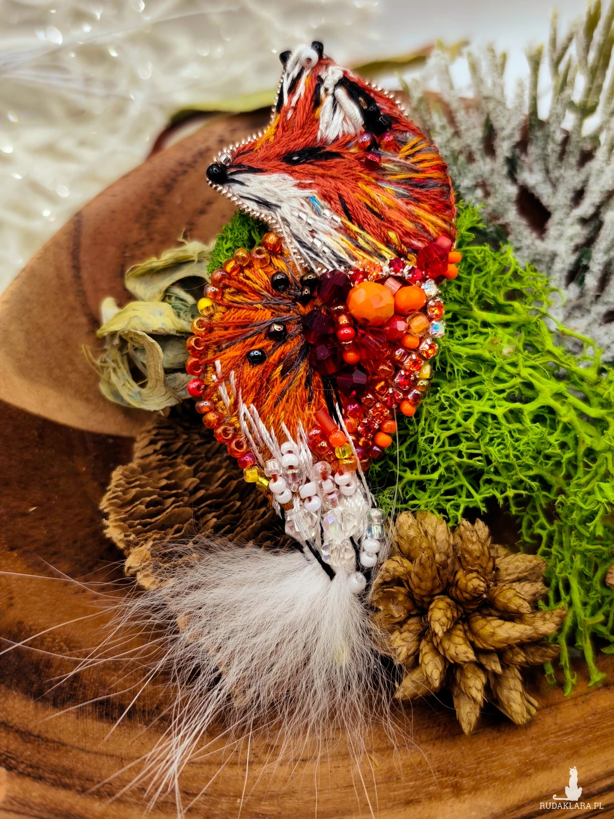 Ręcznie haftowana broszka w kształcie lisa – symbol sprytu, intuicji i dzikiej elegancji. Każdy detal został wykonany z dbałością o kolor, światło i strukturę, dzięki czemu broszka pięknie mieni się i przyciąga spojrzenia.