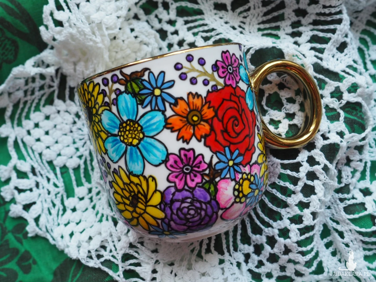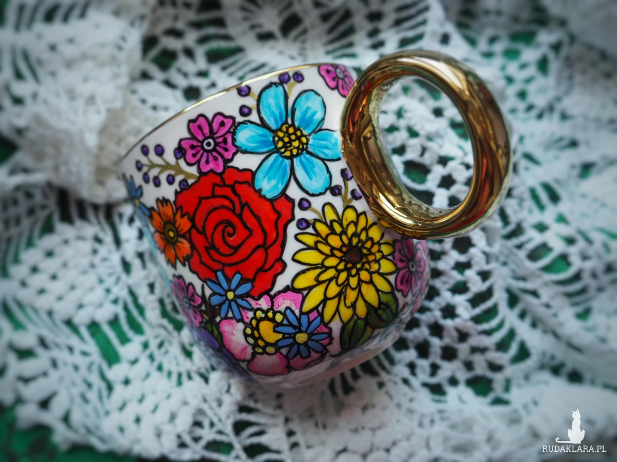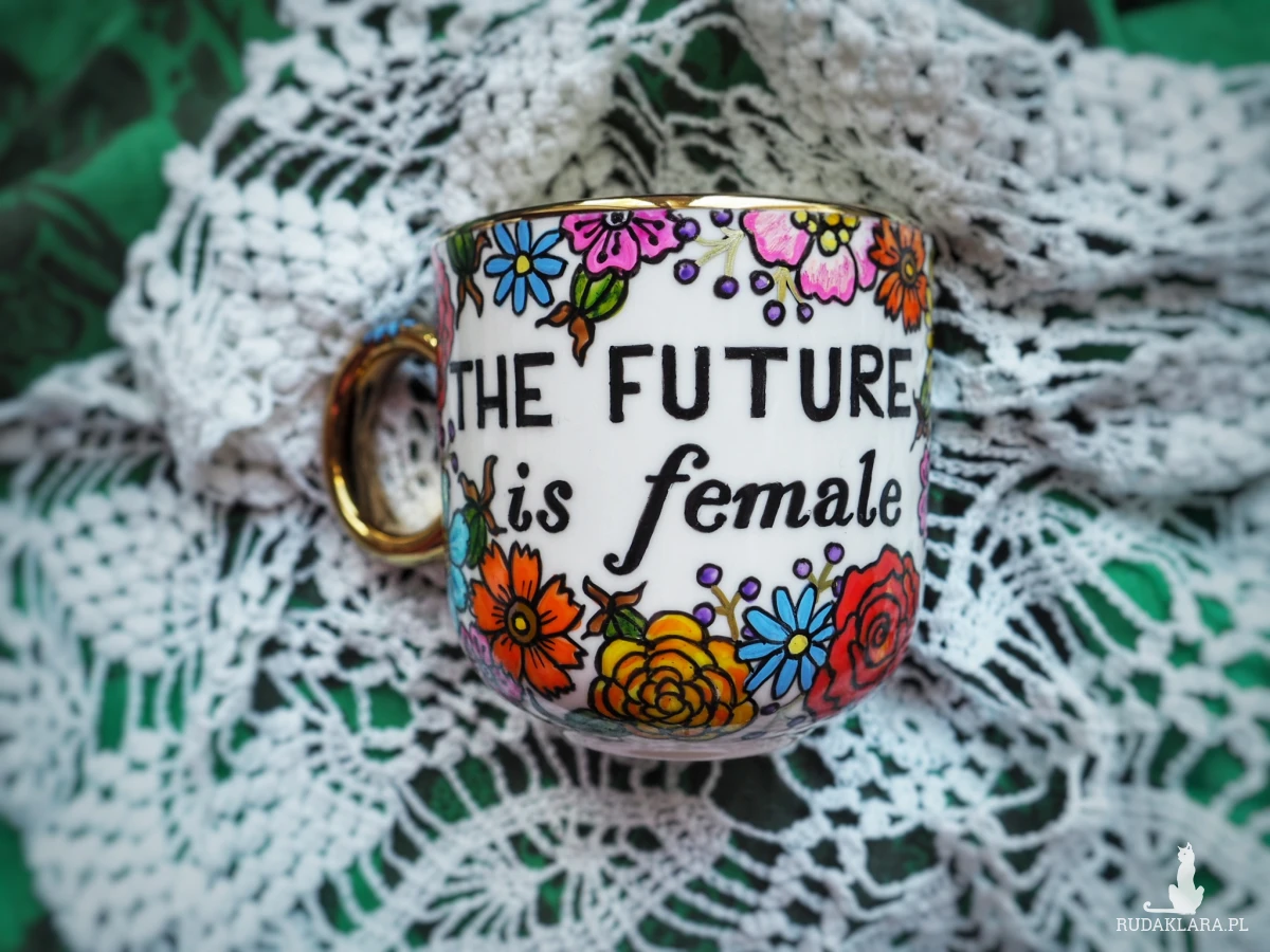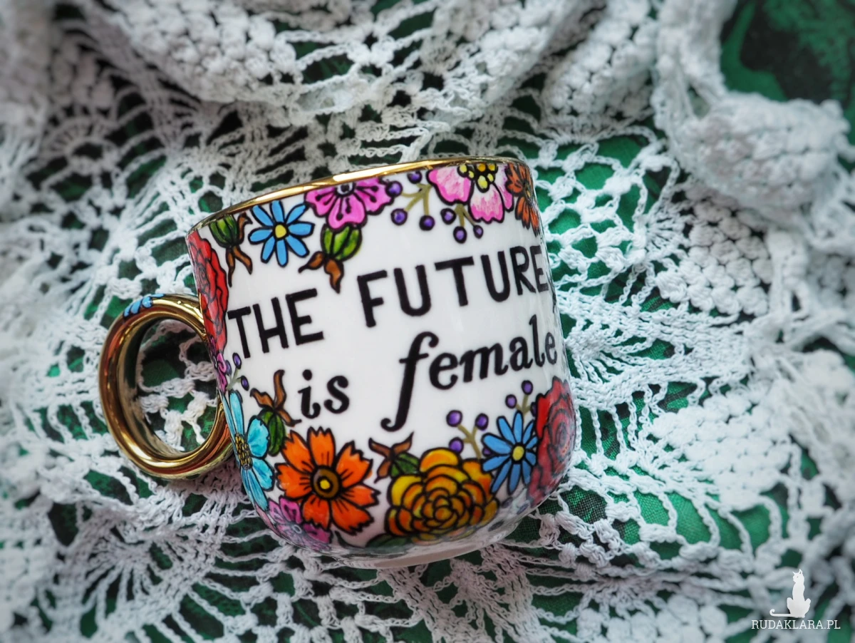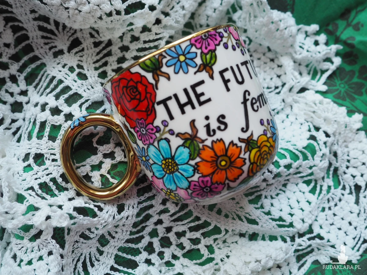 Ręcznie malowany kubek w kwiaty z napisem "The future is female", idealny dla każdego, kto wierzy w siłę i moc kobiet.