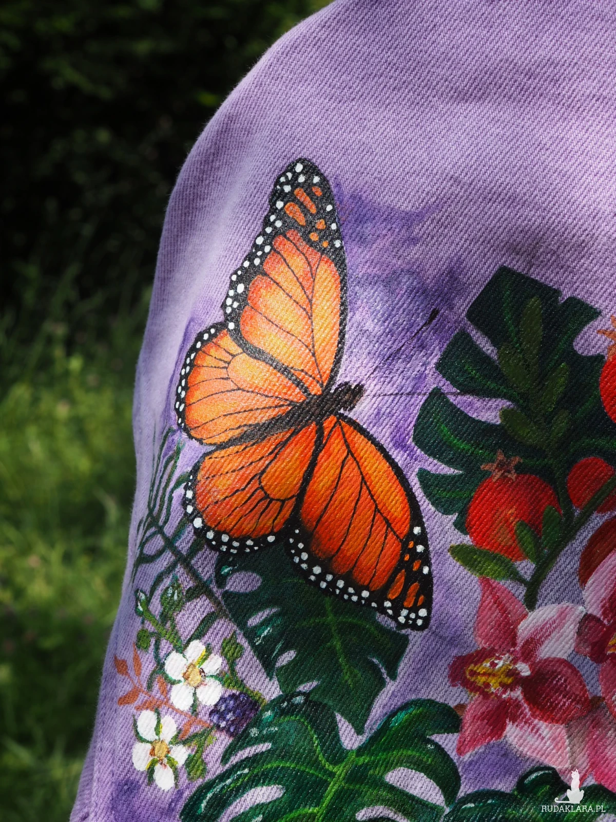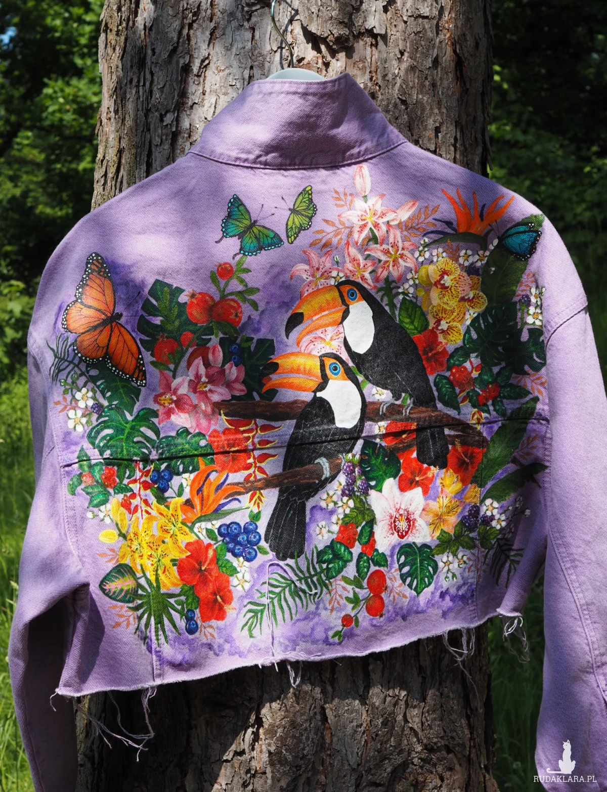 Ta oszałamiająco kolorowa, ręcznie malowana (nie drukowana) kurtka w tukany, motyle i tropikalne kwiaty to idealny prezent dla każdej bliskiej osoby. Jeżeli kochasz naturę i wibrujące kolory, ubierz się w ten egzotyczny, jedyny w swoim rodzaju wzór.