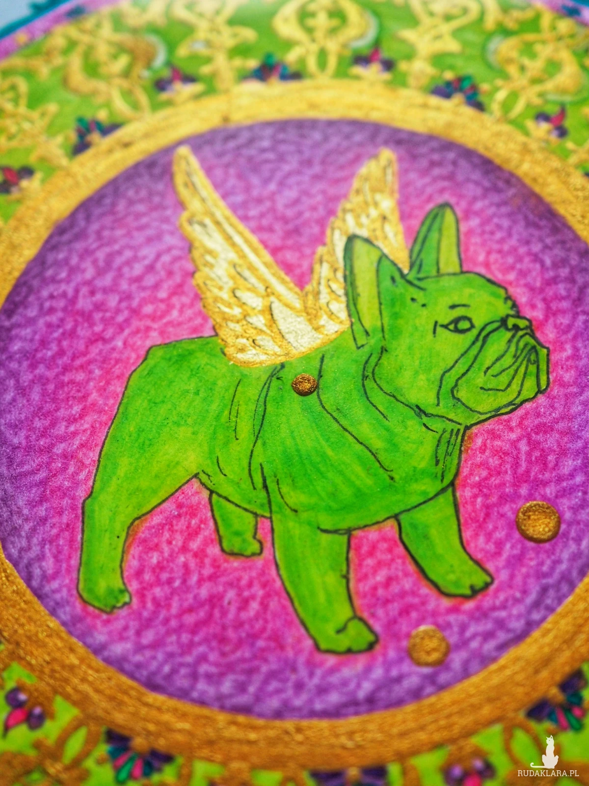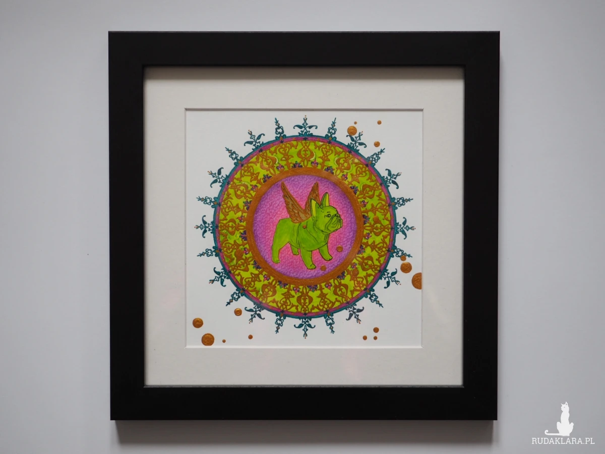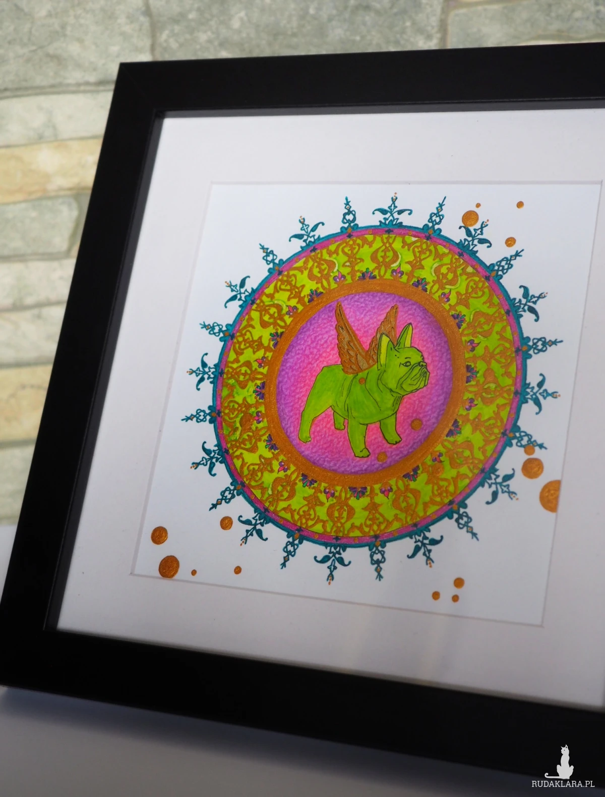 Zabawna mandala, inspirowana sztuką wschodnią, ze skrzydlatym zielonym mopsem otoczonym misterną kompozycją orientalnych ornamentów. Wibrujące fluorescencyjne barwy podkreślają absurdalność zestawienia tematu z formą. Taki obraz sprawdzi się jako upominek na niemal każdą mniej formalną okazję. Może stać się dekoracją salonu, sypialni, biura, a nawet kuchni czy przedpokoju.