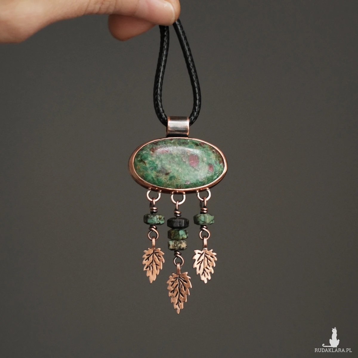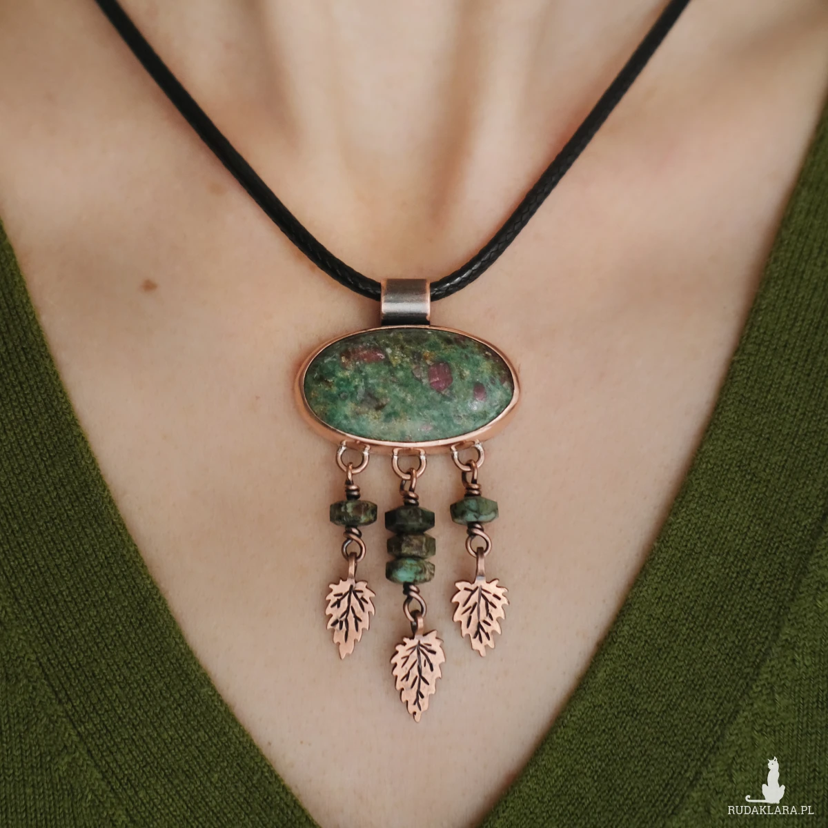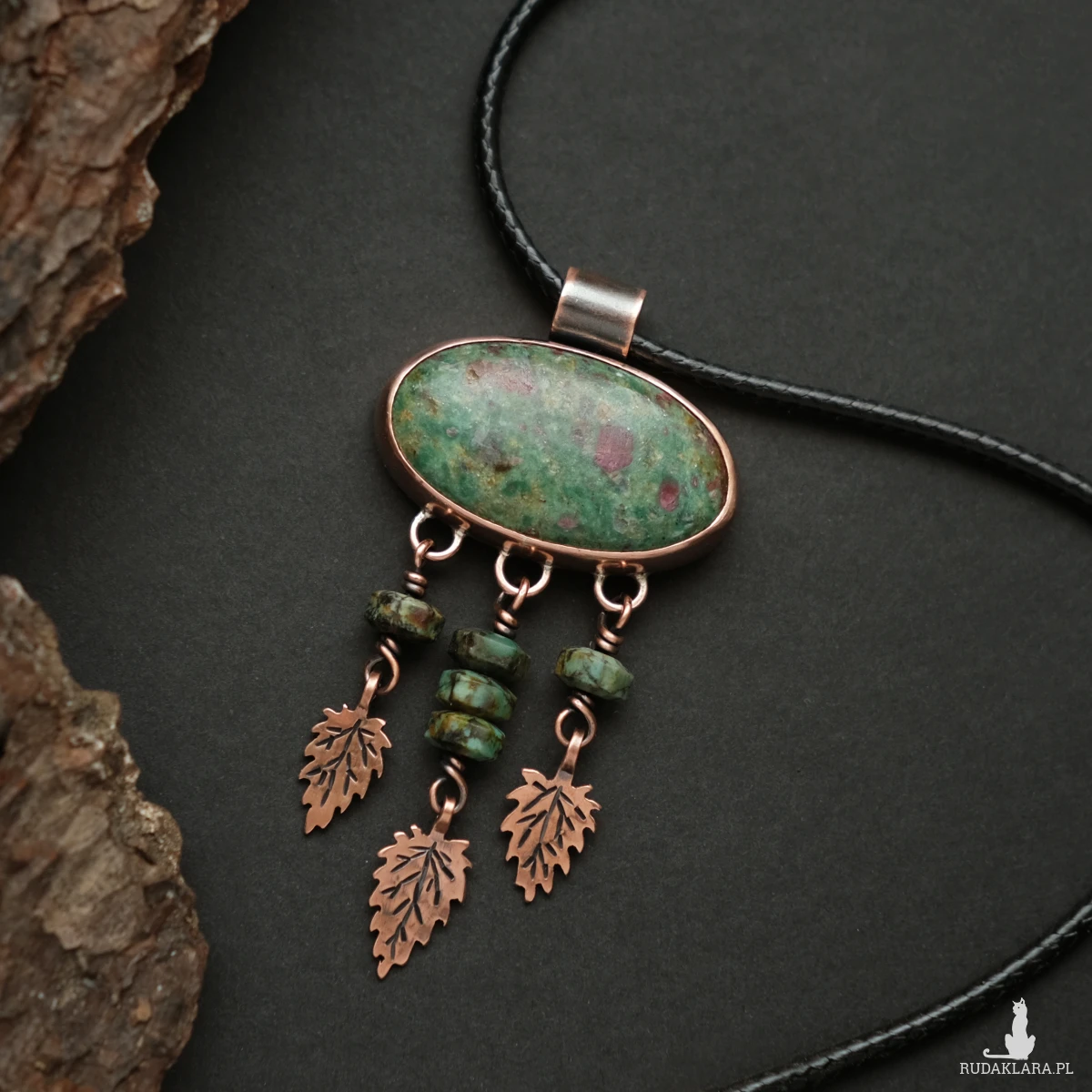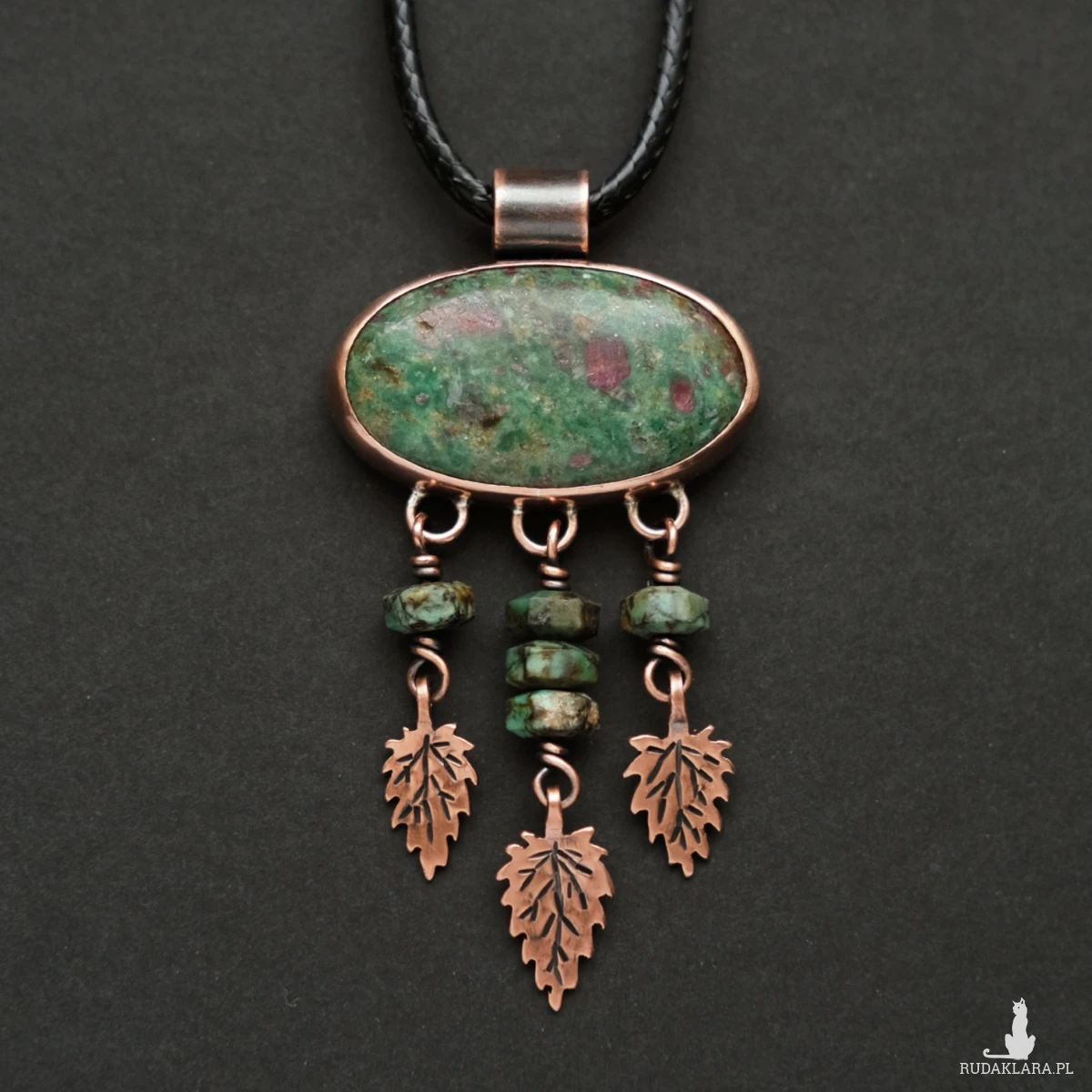 Unikatowy miedziany wisior z rubinem w fuchsycie. Ozdobiony maleńkimi liśćmi pokrzywy wyciętymi z miedzianej blachy (te pokrzywy nie kłują!) oraz kamieniami turkusu afrykańskiego. Wszystkie elementy zostały stworzone ręcznie na podstawie rysunku, co nadaje mu oryginalnego charakteru. Wisior ma naniesioną miejscowo patynę, aby uwydatnić żyłki liści. Idealnie sprawdzi się na dekolcie miłośniczki natury oraz ziół, ceniącej wyroby rękodzielnicze.