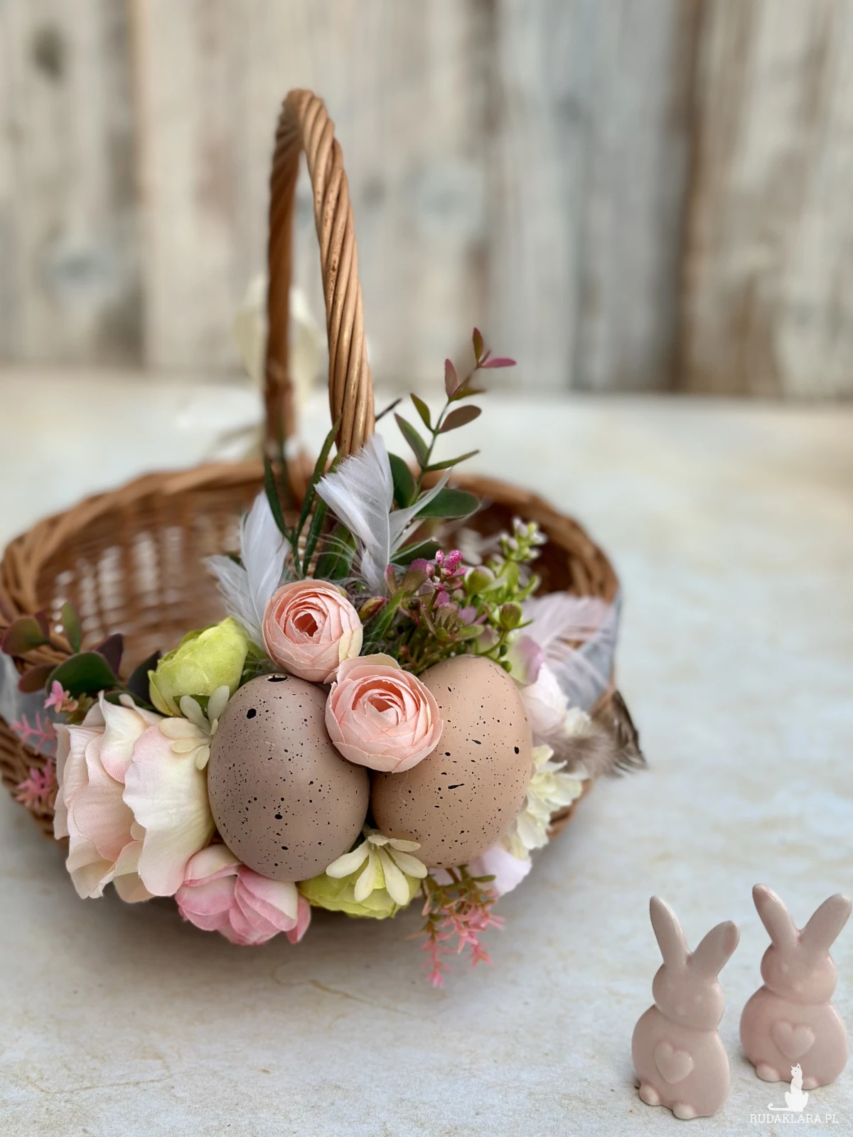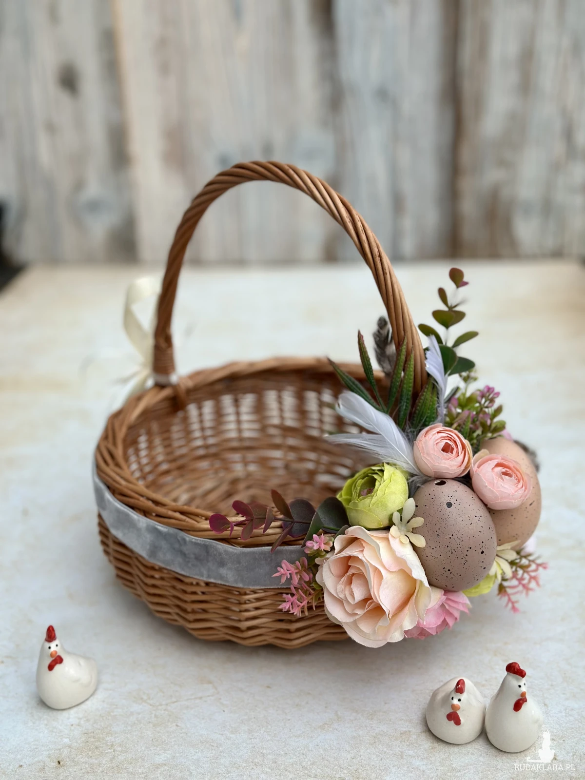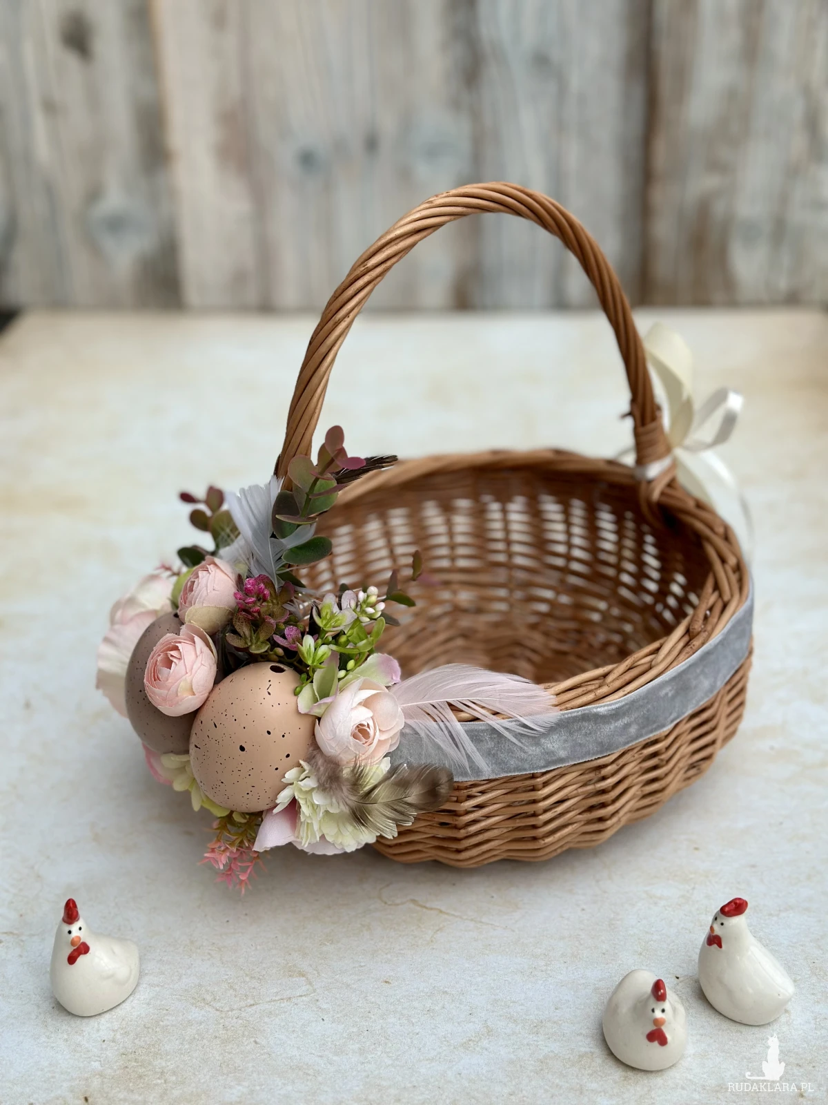 Koszyk na Wielkanoc, wiklinowy koszyczek z dekoracją