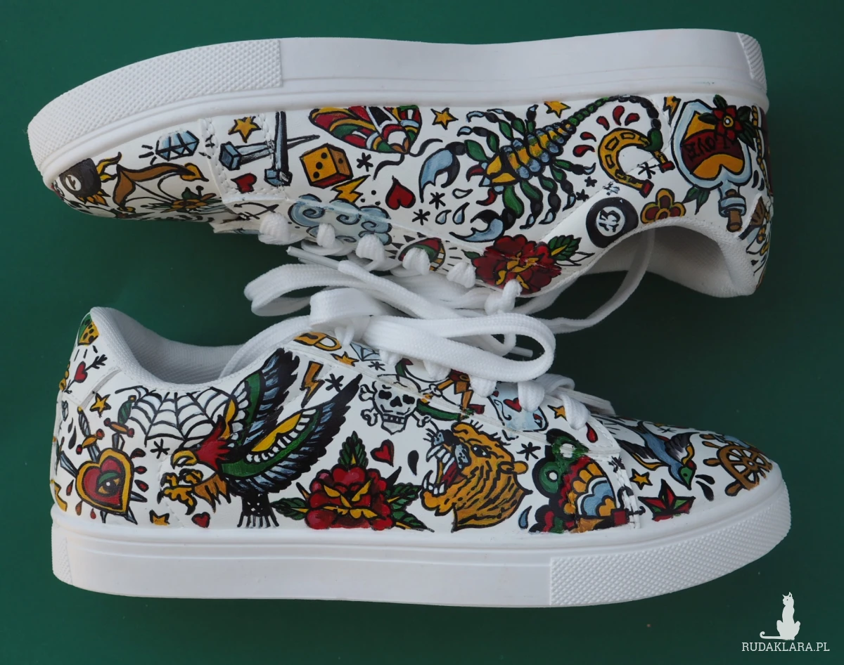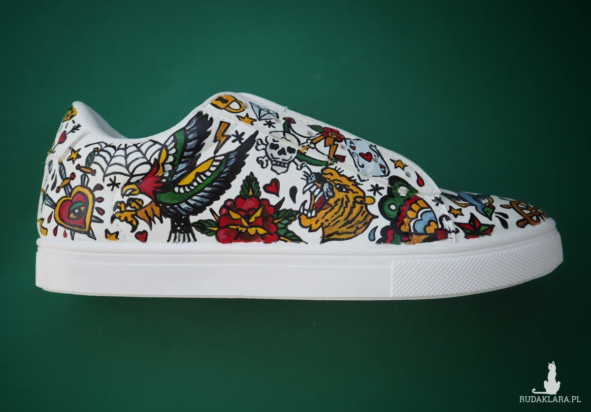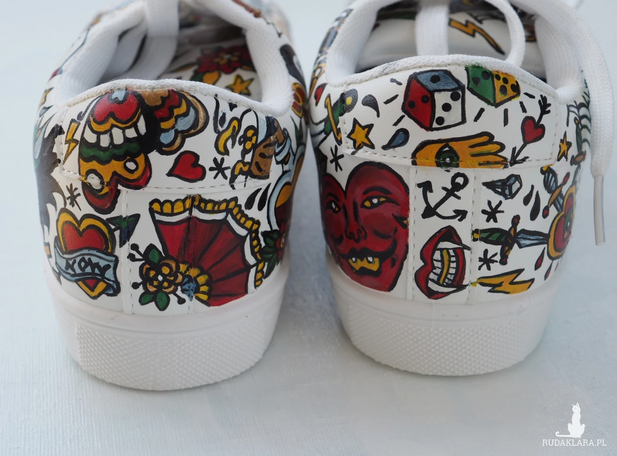 Ręcznie malowane trampki ze sztucznej skóry z wzorami tatuaży w styli american old school.