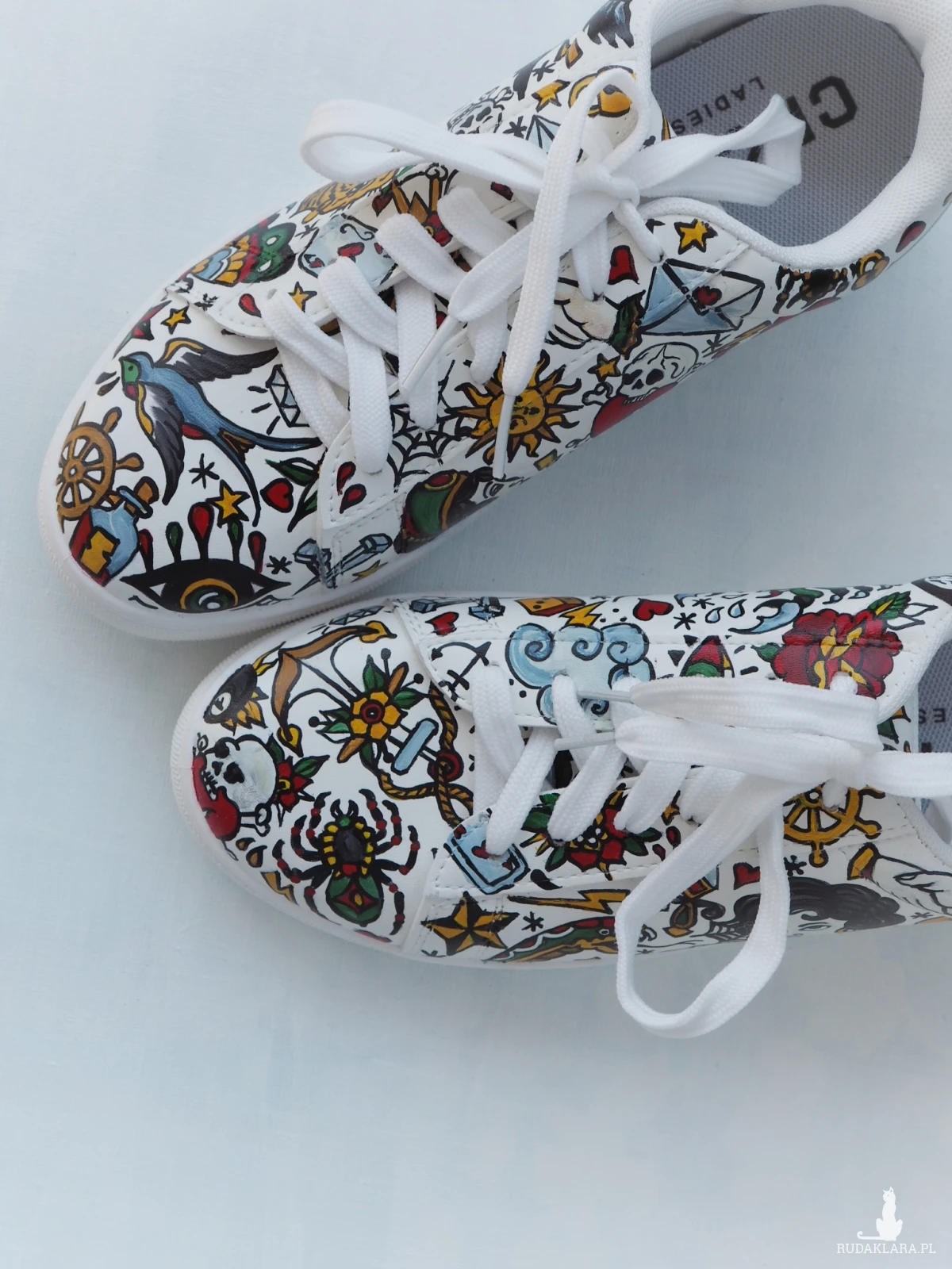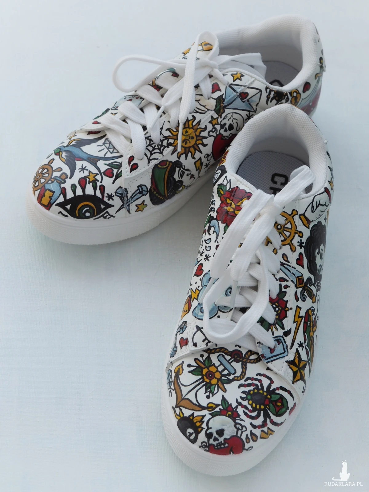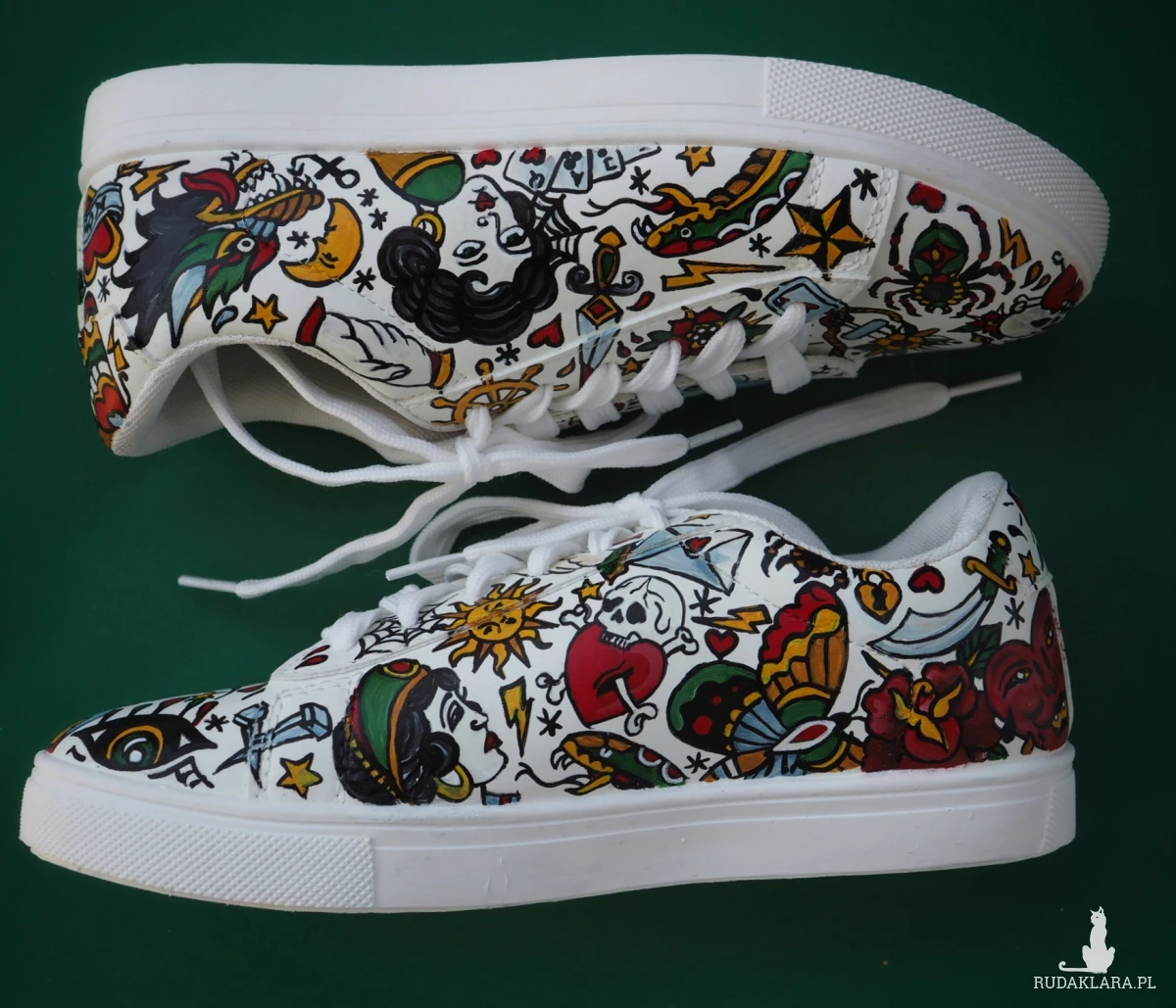 Ręcznie malowane trampki ze sztucznej skóry z wzorami tatuaży w styli american old school.