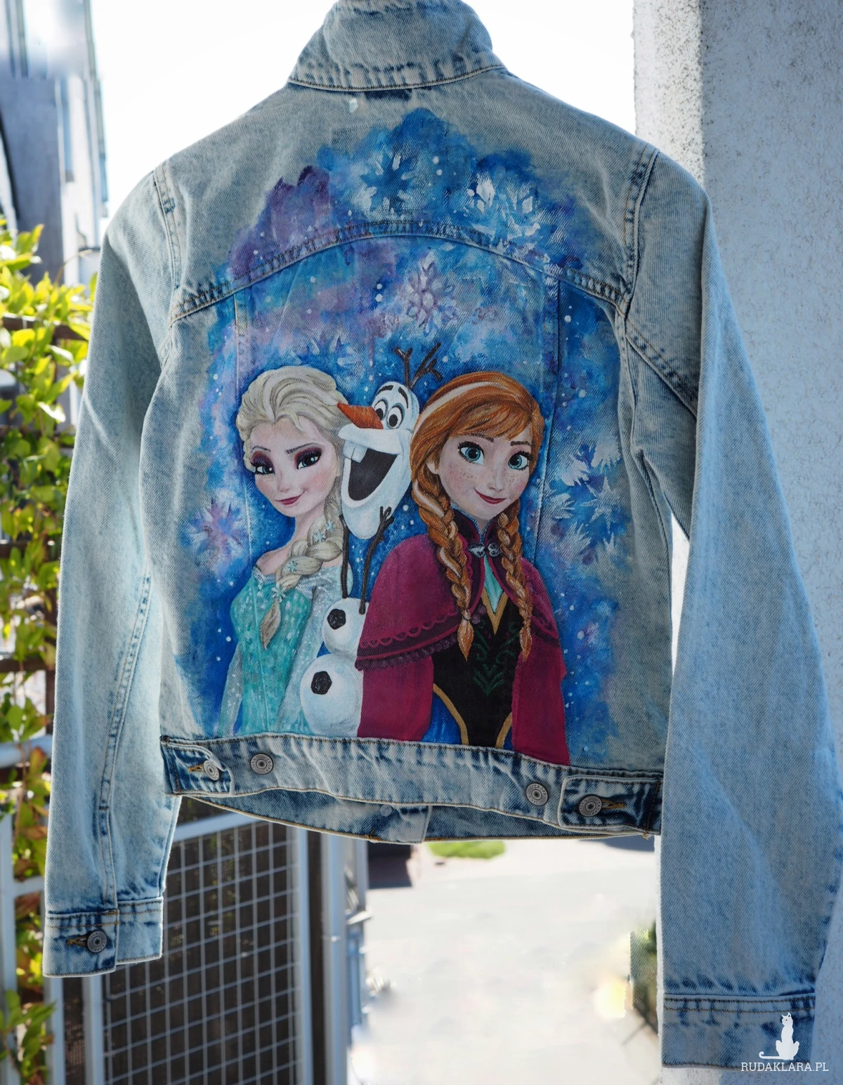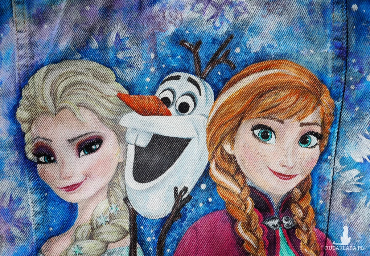 Ręcznie malowana jeansowa kurtka damska, idealna dla wielbicielki bajek, zimy, a szczególnie „Krainy Lodu”. Rozmiar odpowiedni zarówno dla drobnej dorosłej osoby, jak i dla dziecka.