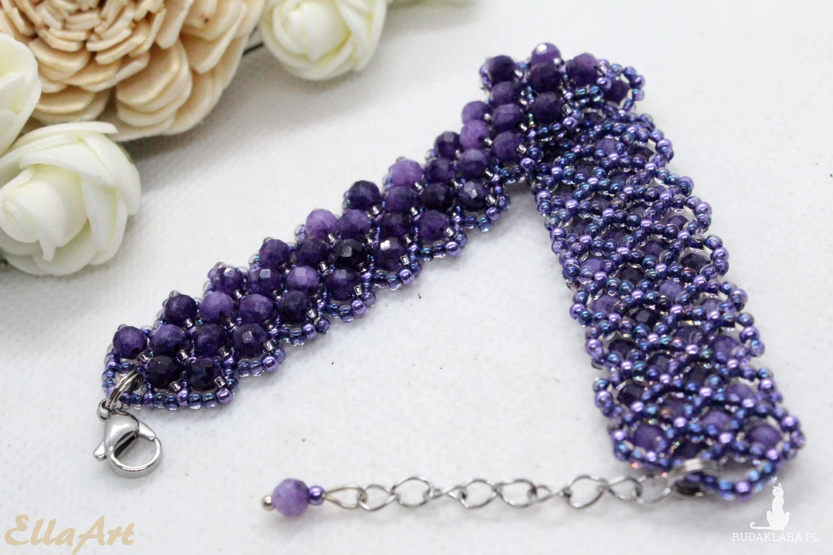 Kamienie zostały przyszyte do siatki z koralików japońskiej firmy Toho. Są to koraliki najwyższej jakości na świecie. Nie ścierają się i nie odbarwiają
