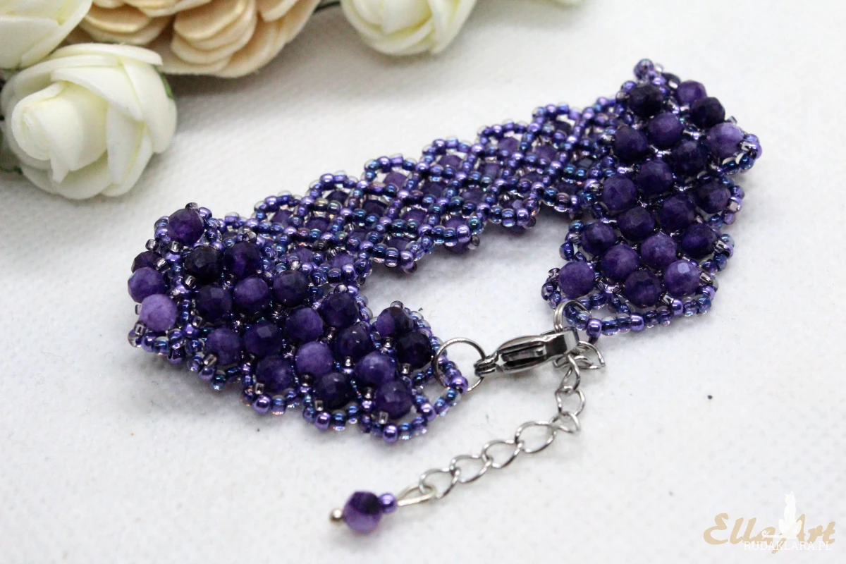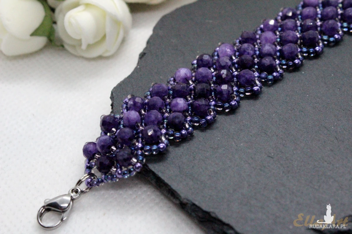 Bransoletka uszyta z naturalnych kamieni ametystu o wielkości 4mm.