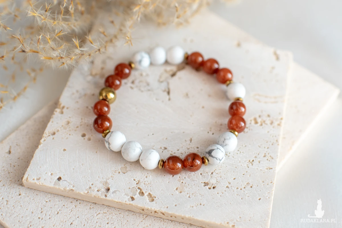 Bransoletka z agatu karneolowego i howlitu białego dla ceniących naturalne materiały, subtelną elegancję i pozytywną energię w biżuterii.