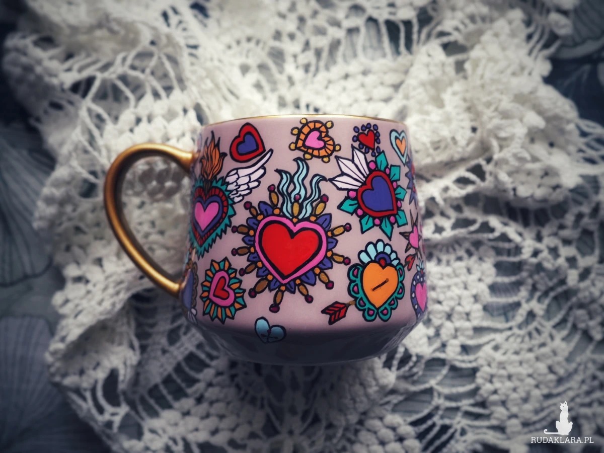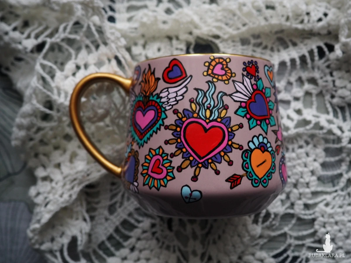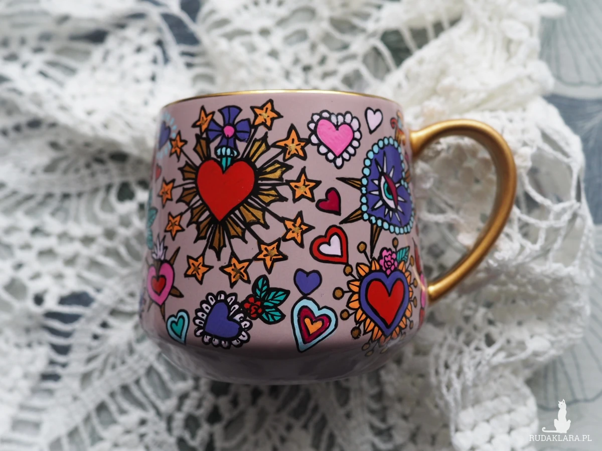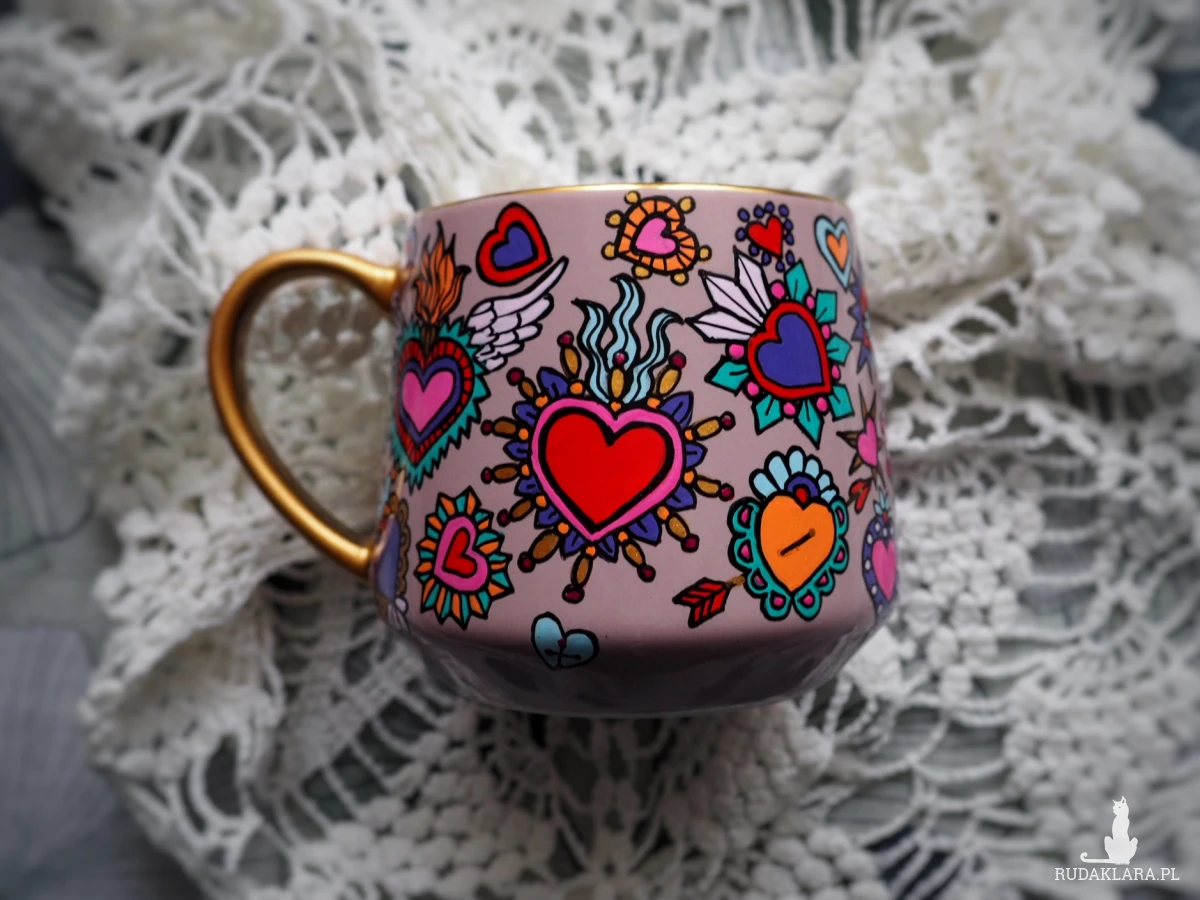 Ręcznie malowany kubek w żywych kolorach, z oryginalnym wzorem będzie doskonałym podarunkiem dla osoby kochającej oryginalne przedmioty.