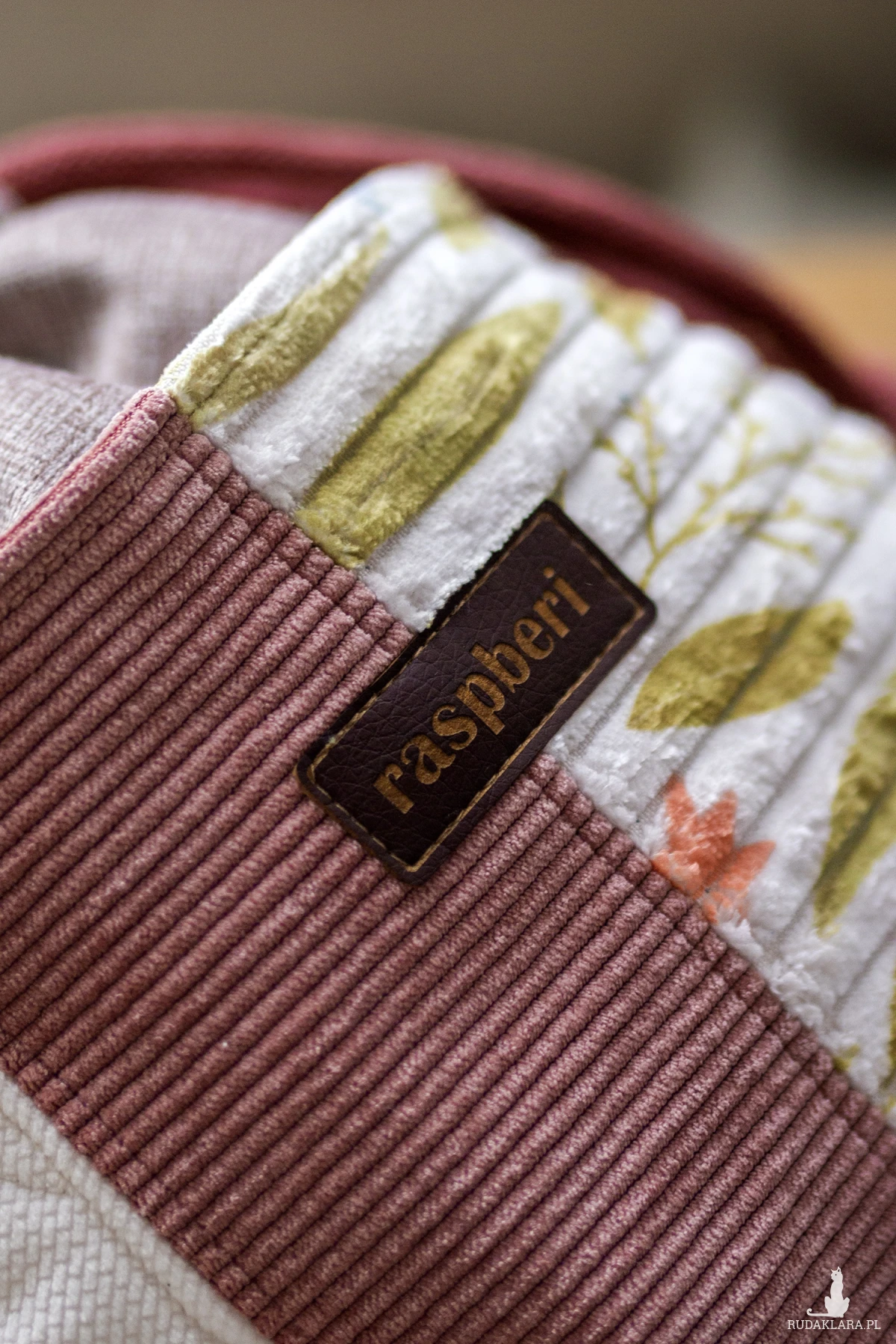 Wykonana z beżowego weluru. Z przodu oraz z na tyle torebki kieszenie (np. na telefon czy chusteczki) w stylu patchworkowym. W środku kieszonka zapinana na suwak.