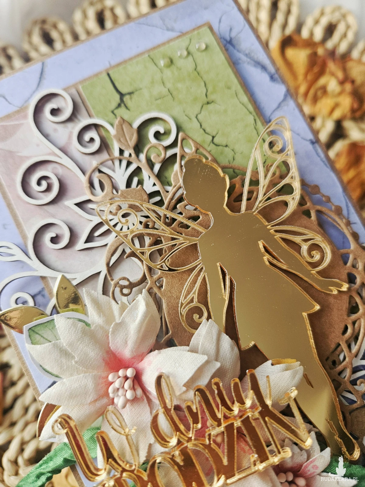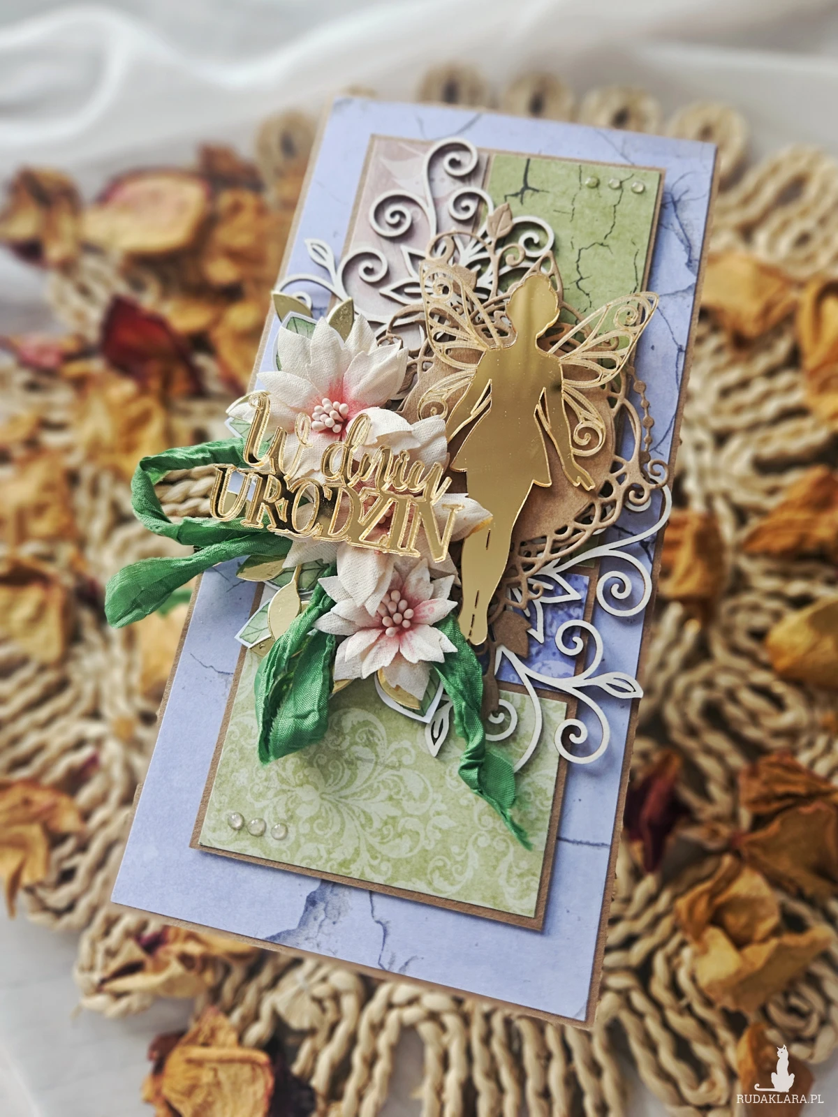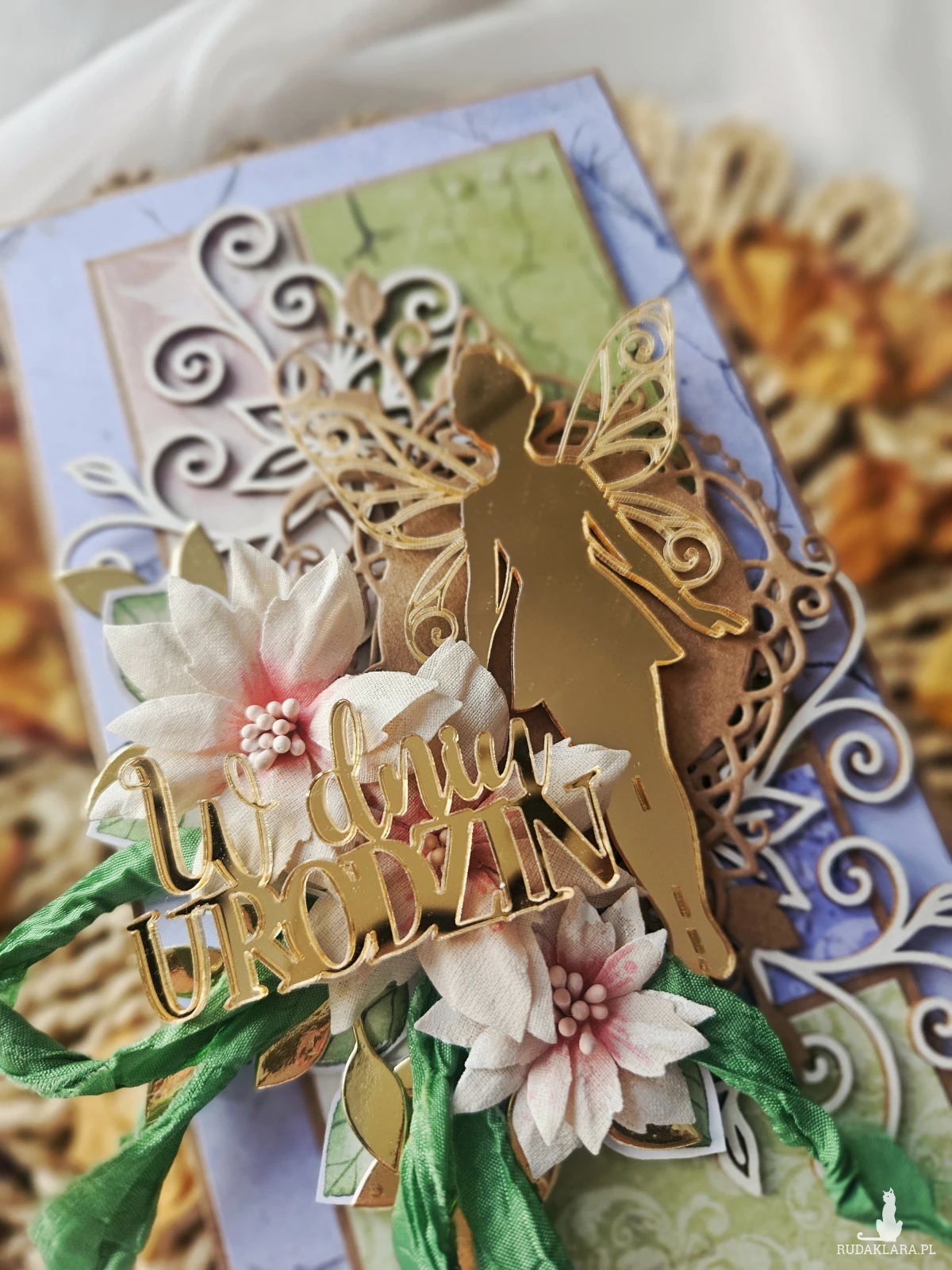 Elegancka kartka z okazji urodzin. Wykonana z papieru z nadrukiem i ozdobiona kwiatami z materiału oraz dodatkami z pleksi.