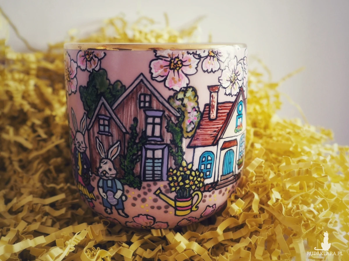 Ręcznie malowany kubek ze świątecznymi królikami będzie doskonałym upominkiem "na zajączka", wyrazi sympatię przy okazji wiosennych spotkań, rozweseli wielkanocny stół.