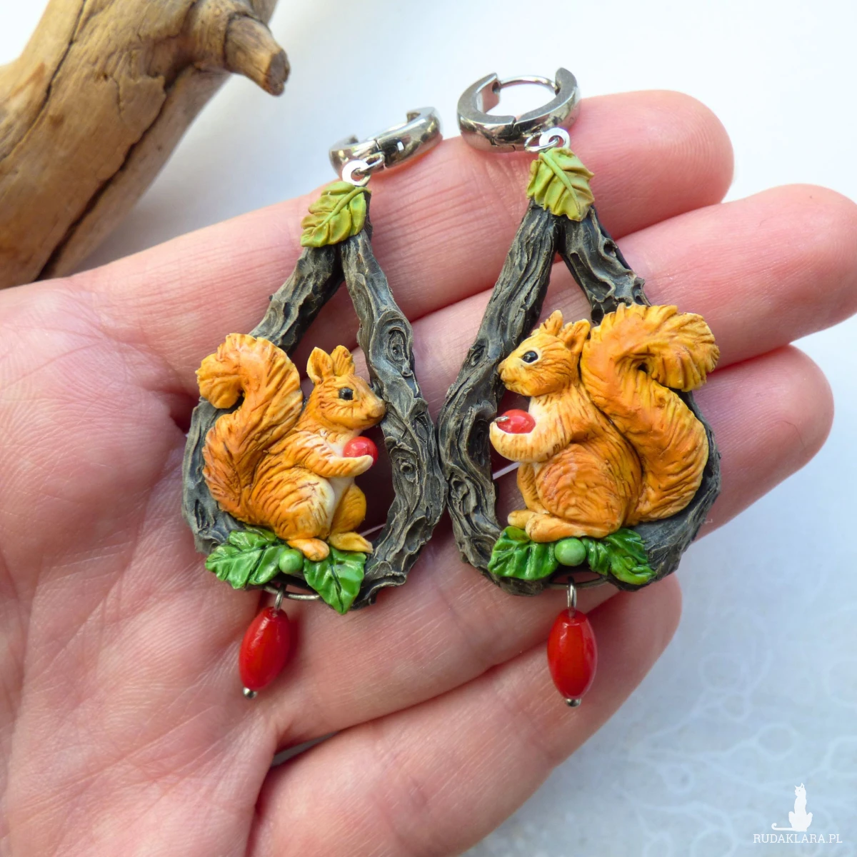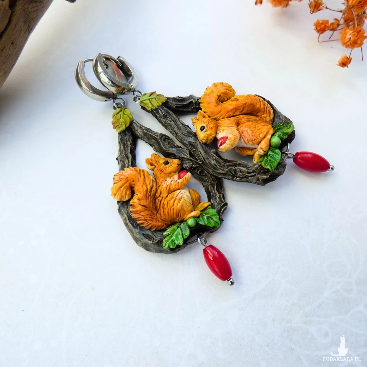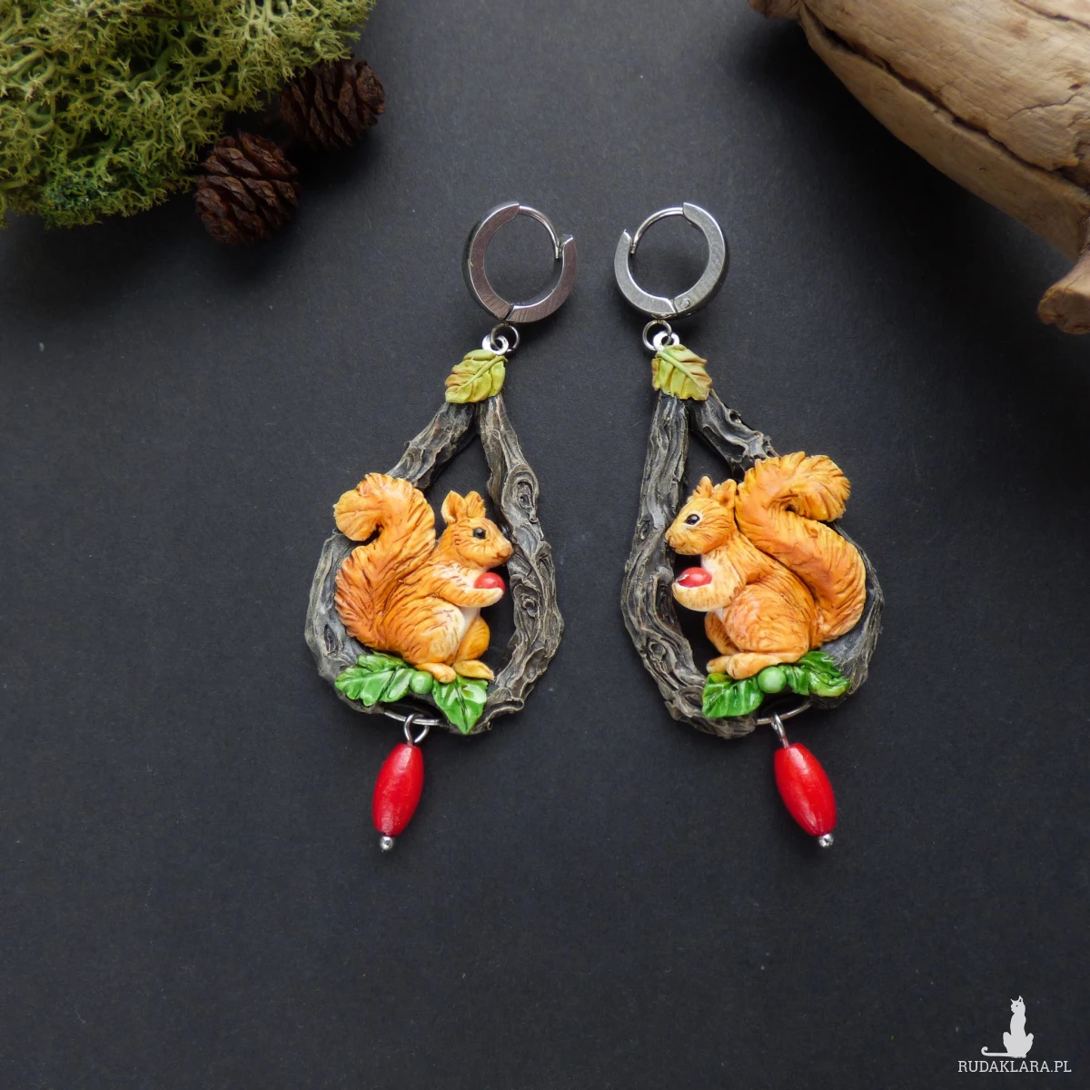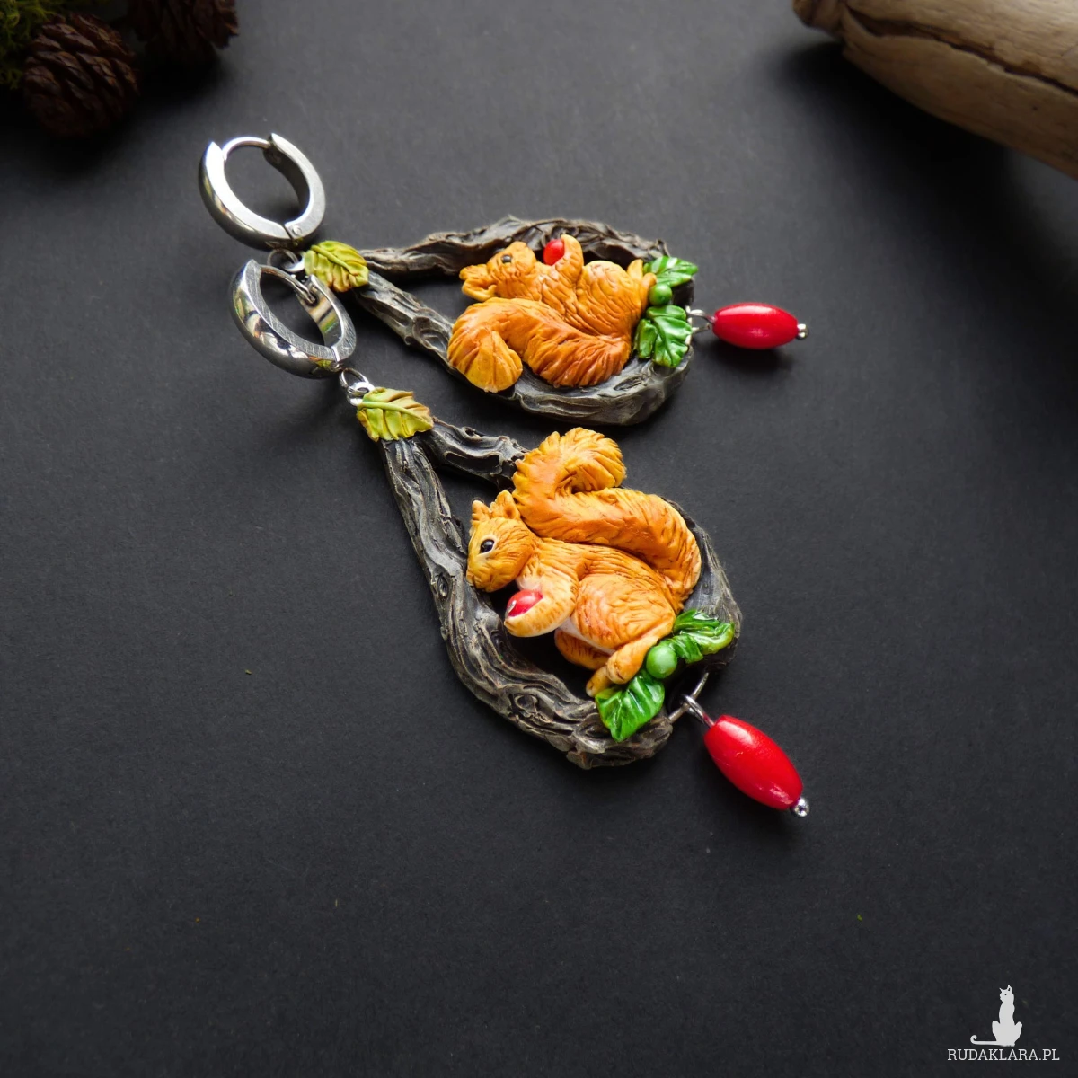Kolczyki zaprojektowałam i wykonałam w pojedynczym egzemplarzu. Jest to w 100% rękodzieło, każdy element - wiewiórka, jej puszysty ogonek, listek, pień drzewa - jest modelowany i wykańczany ręcznie bez form i odlewów (drobne różnice są naturalne i dodają uroku).