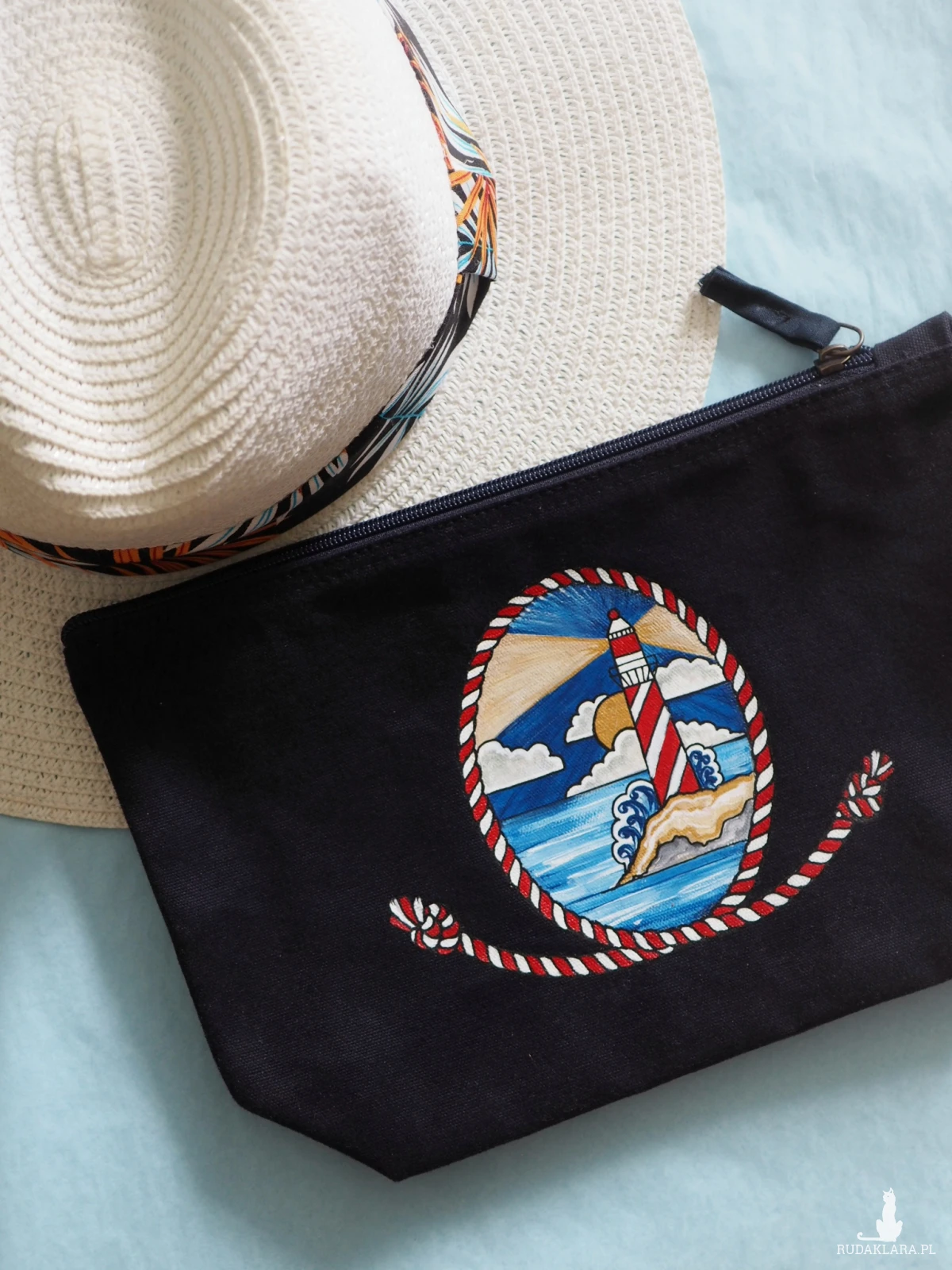 Doskonały prezent dla pasjonata żeglarstwa i każdej osoby kochającej morskie klimaty. Na życzenie na kosmetyczce mogę domalować imię obdarowywanej osoby. Namalowany wzór jest wodoodporny i trwały.