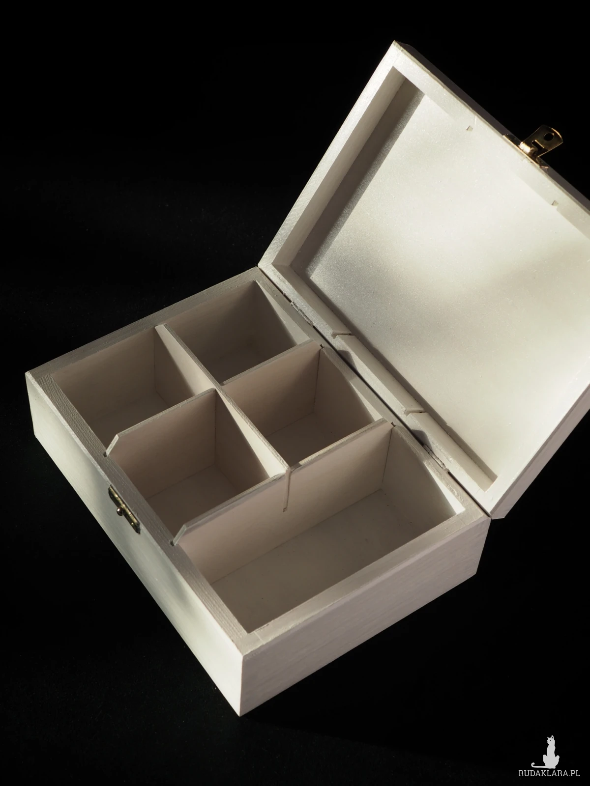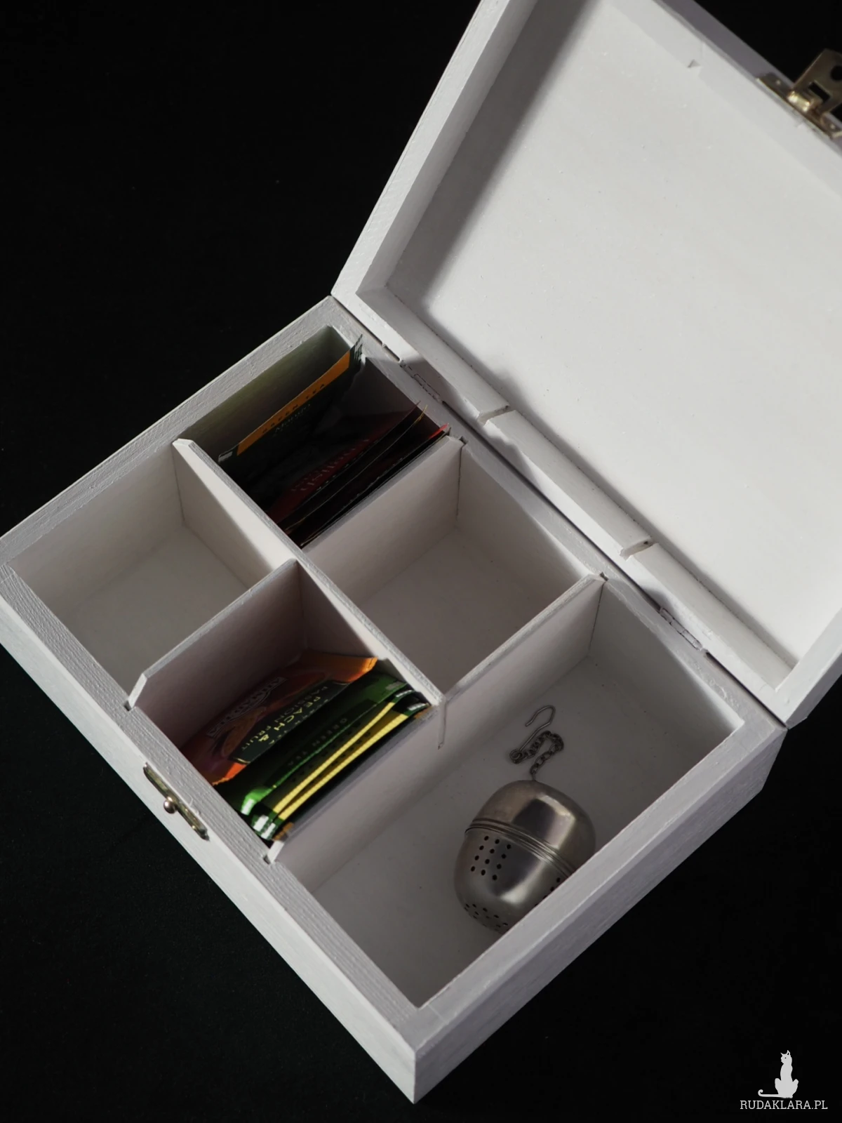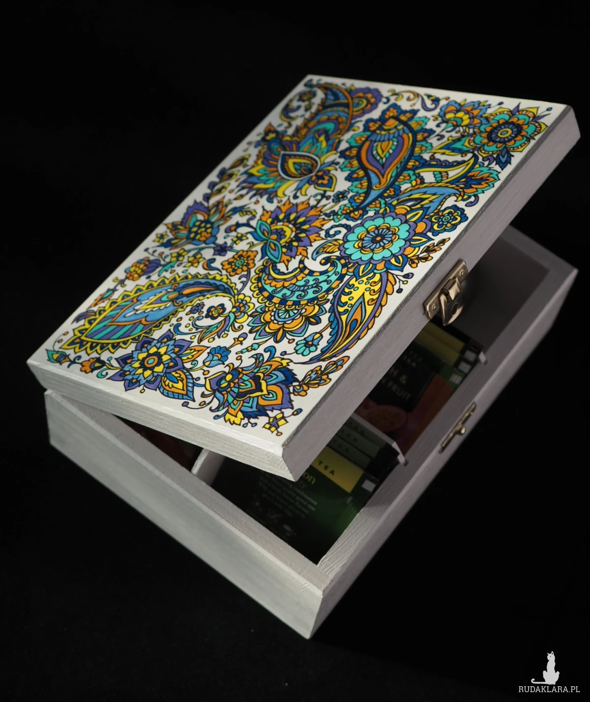 Korpus skrzyneczki wykonany jest z drewna sosnowego, pomalowany nietoksycznymi farbami akrylowymi i pokryty satynowym lakierem. Wnętrze pomalowane na biało. Metalowy zamek w kolorze złotym. 5 przegródek tego pudełka doskonale sprawdzi się do przechowywania torebek z herbatą, biżuterii lub do uporządkowania drobnych przedmiotów używanych w domu. Ręcznie wykonana, o niepowtarzalnym wzorze, herbaciarka będzie świetnym prezentem dla rodziny i przyjaciół lub miłym niezobowiązującym upominkiem dla każdej osoby, której chcesz podziękować, wyrazić wdzięczność lub ciepłe uczucia.