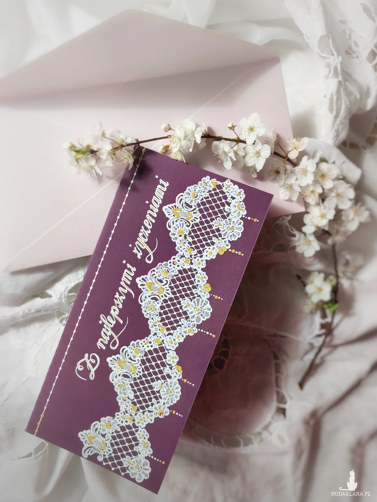 Do kartki z ręcznie wykonanym motywem dopasowana perłoworóżowa koperta. W miarę dostępności możliwość dobrania innego koloru koperty.