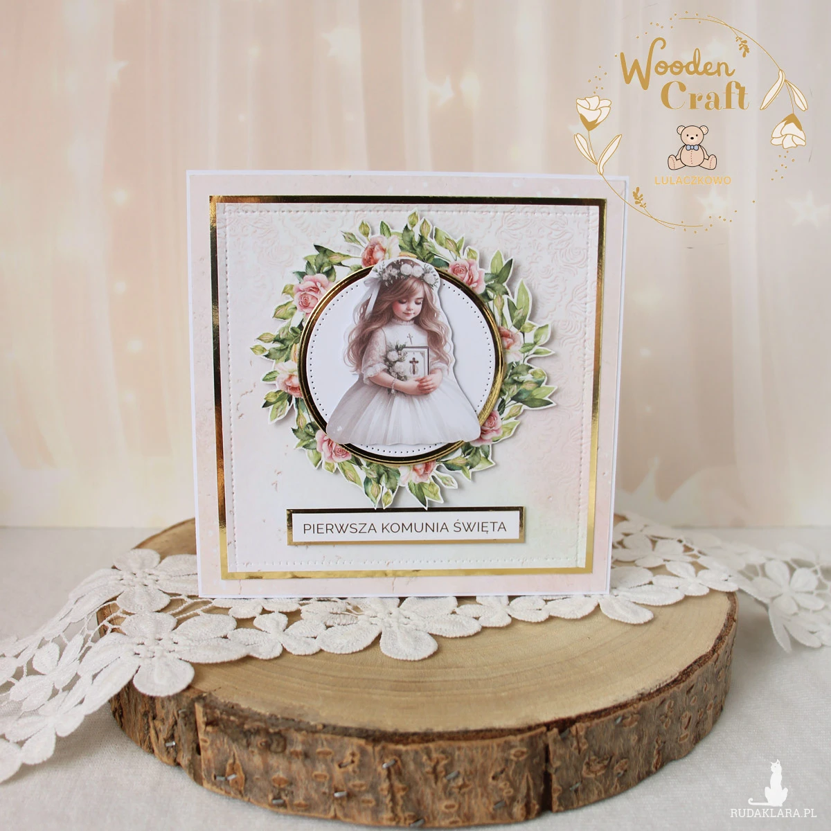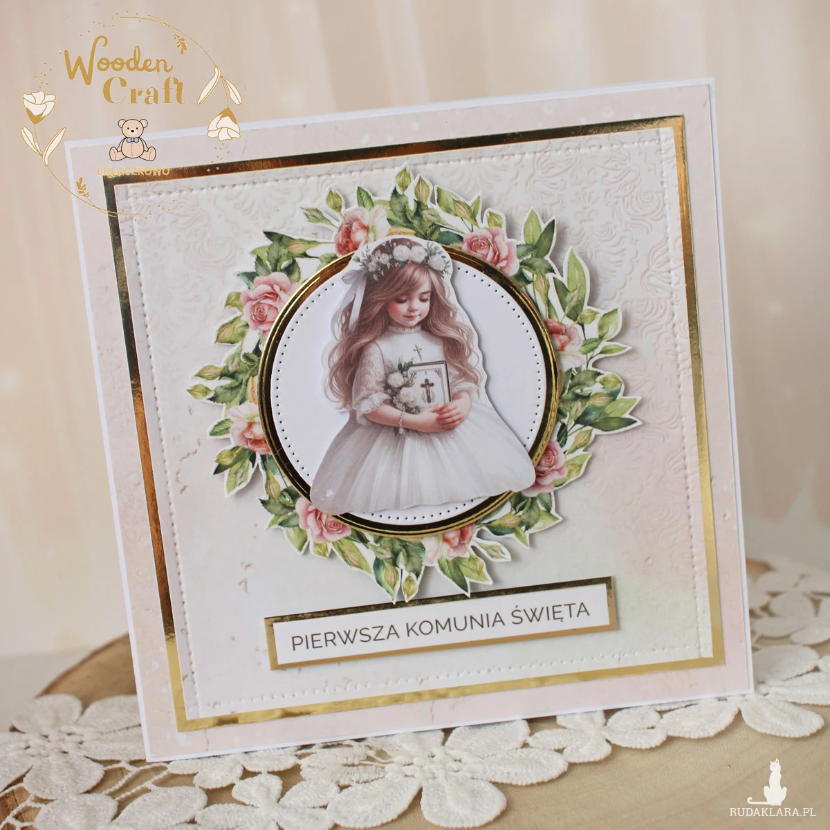 Piękna, elegancka kartka komunijna, pamiątka Pierwszej Komunii Świętej mieszcząca się do koperty, wykonana ręcznie z najwyższą starannością, z cudownej kolekcji papierów "Rose Wine", utrzymana w pastelowych odcieniach malinowego różu, kremu i bieli, z dodatkiem złotych, błyszczących akcentów. Na środku kartki umieszona została grafika dziewczynki komunijnej otoczona kwiatowym wianuszkiem, dodatkowo napis "Pierwsza Komunia Święta"- do napisu mogę również dodać imię dziecka lub całkowicie zmienić go na inny.