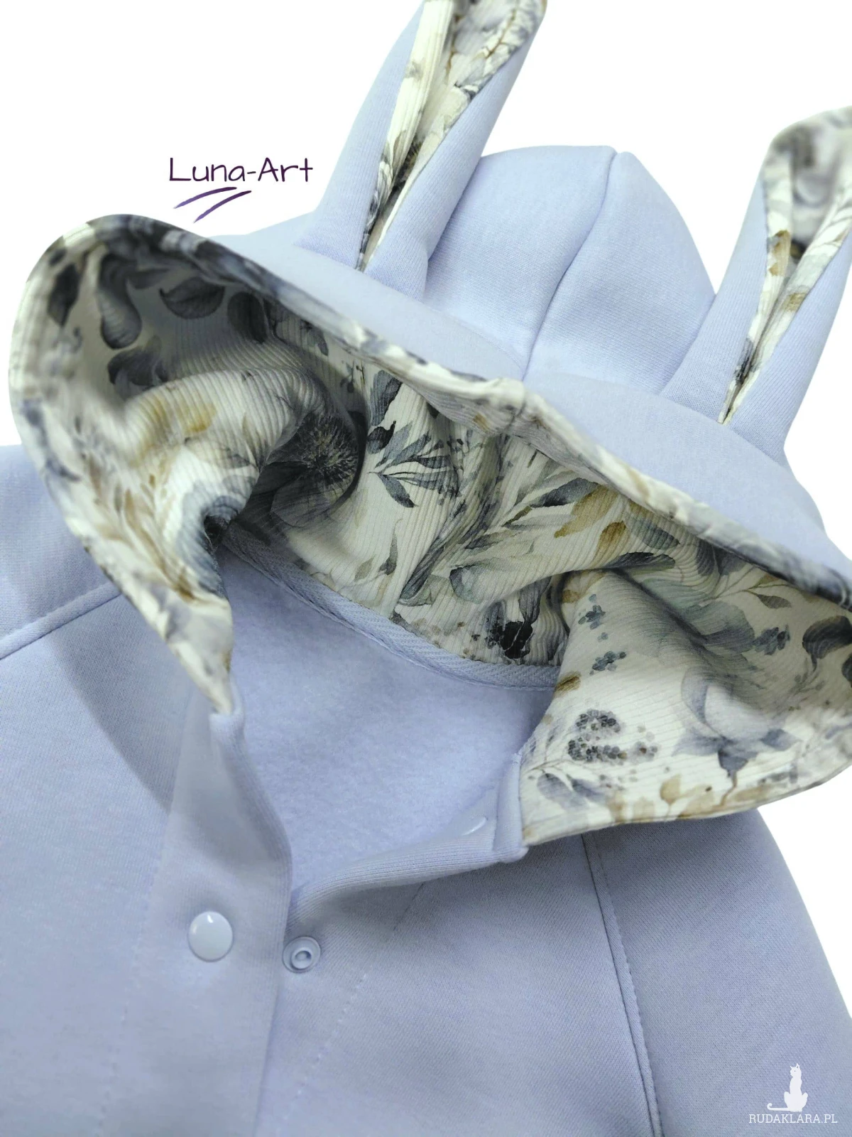 W kapturze, uszach, na końcówkach rękawów oraz ozdobne kokardki to dzianina prążkowana w kwiatki wzór cyfrowy. Z tyłu ozdobny, bawełniany sznurek.