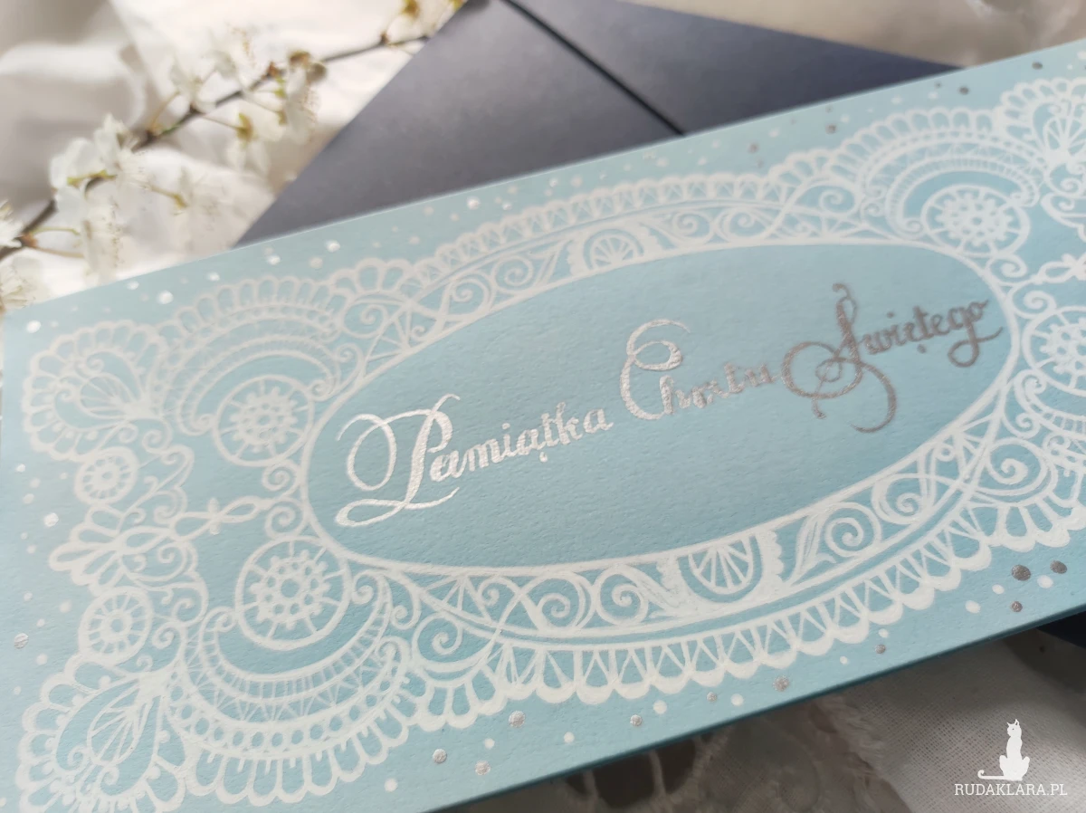 Pamiątka Chrztu Świętego z granatową kopertą.