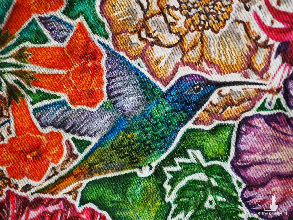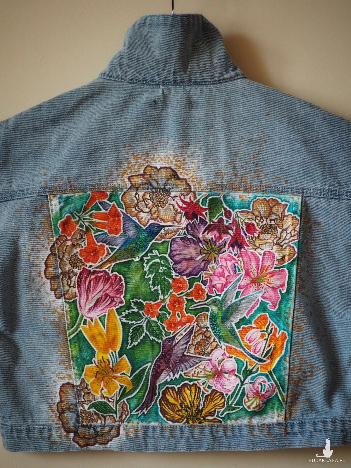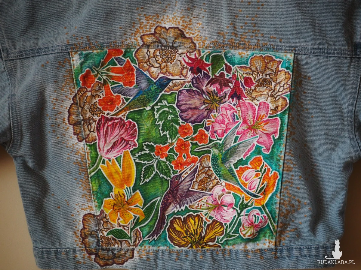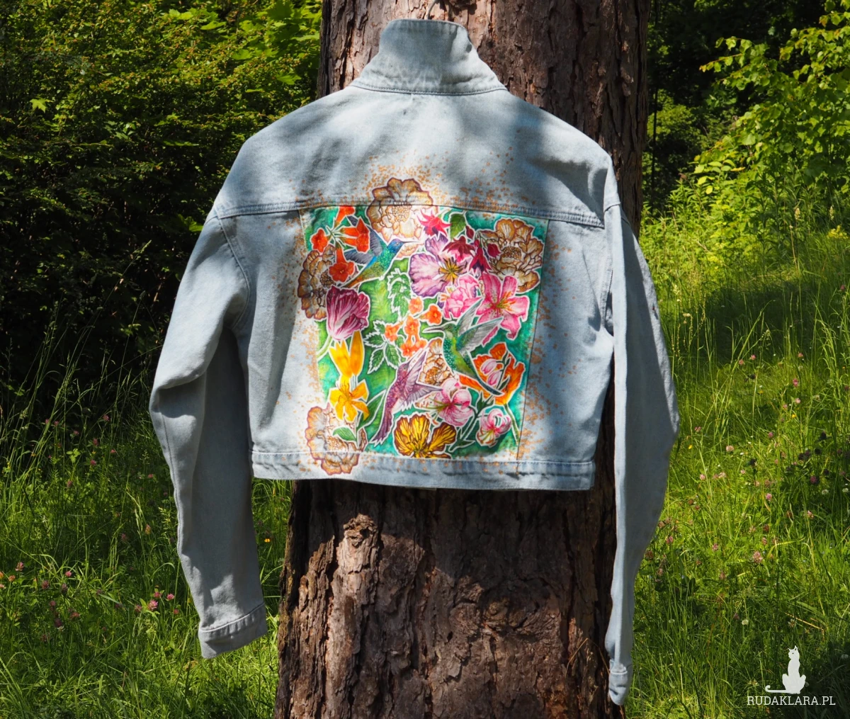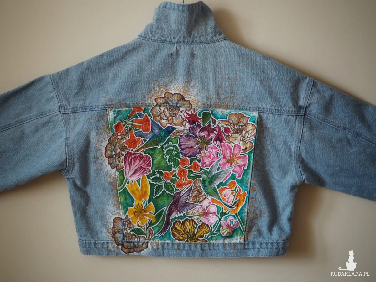 Wzór wykonany został przy użyciu najwyższej jakości akrylowych farb do tkanin, dzięki czemu jest trwały i wodoodporny. Kurtkę można prać w temp. do 30 stopni.