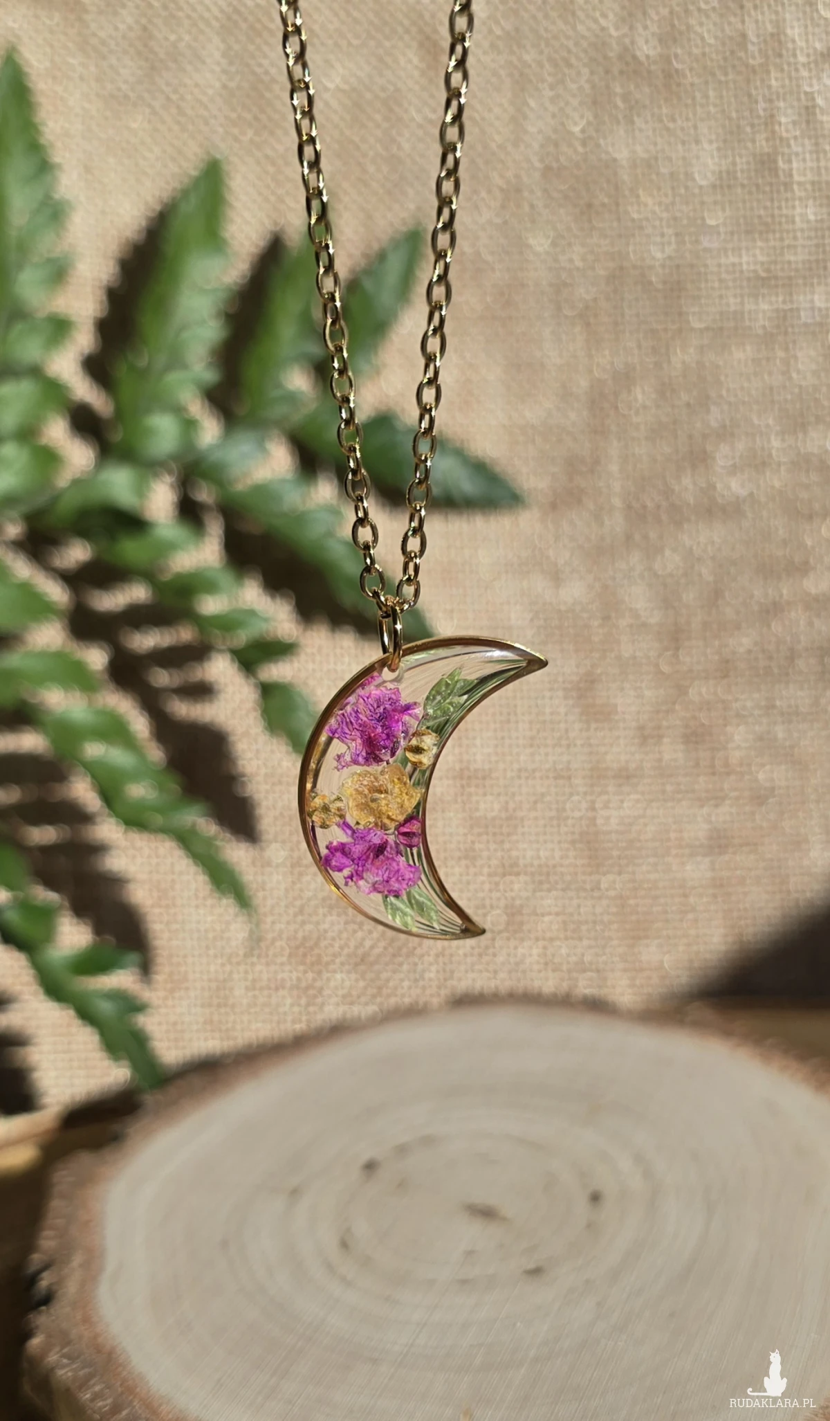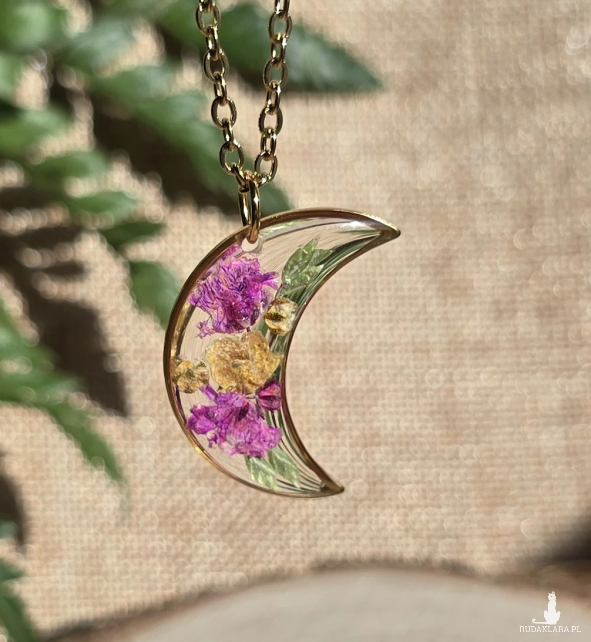 złota zawieszka złoty wisiorek naszyjnik żywica z żywicy kwiaty z kwiatami księżyc kwiaty żywica biżuteria gipsówka