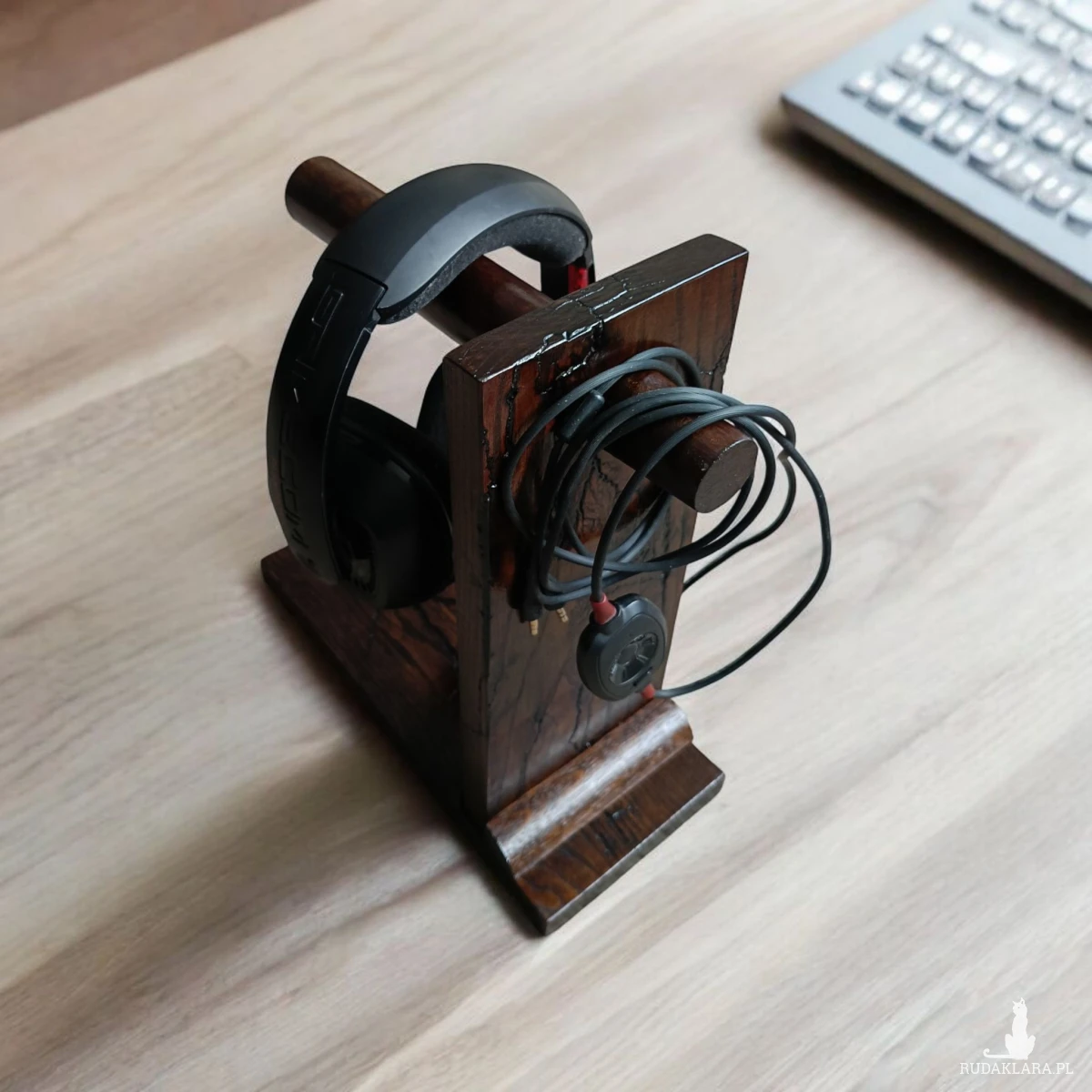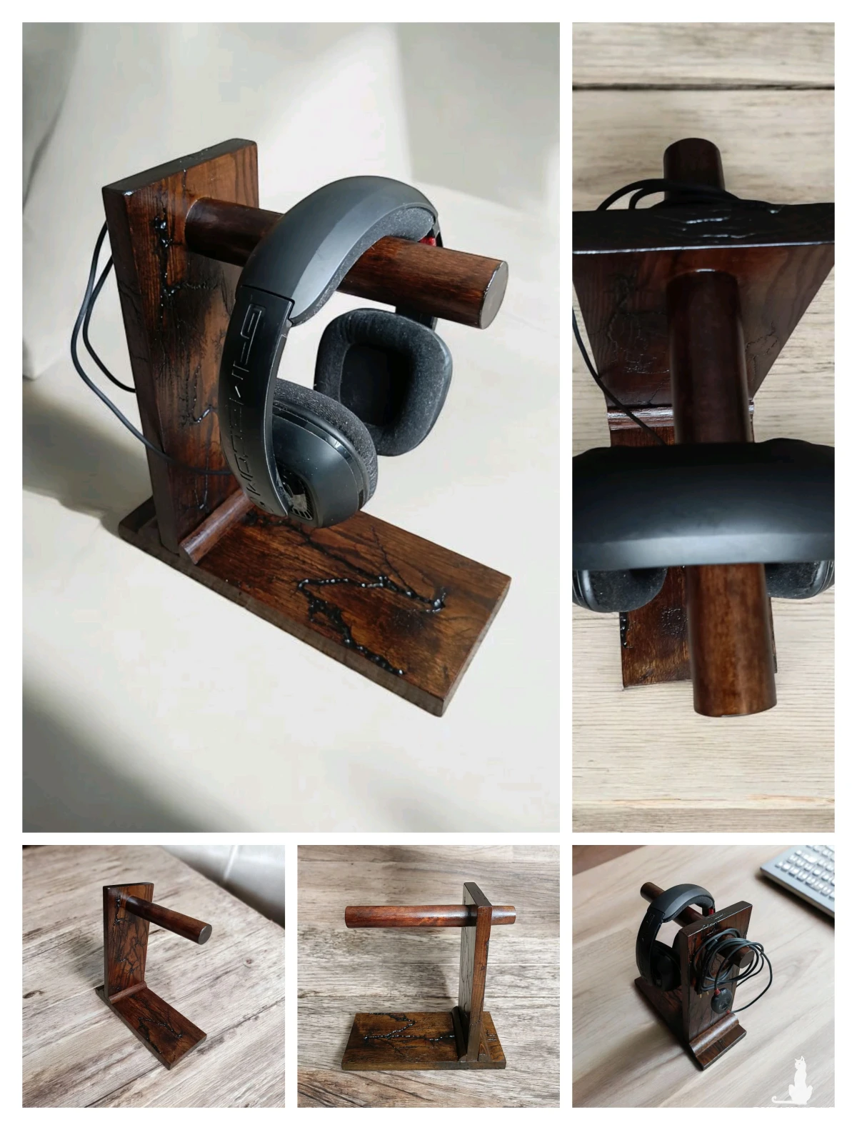Drewniany stojak na słuchawki wykonany z litego dębu w technice Lichtenberga to połączenie rzemiosła stolarskiego z kontrolowanym efektem wyładowań elektrycznych. Forma jest prosta i ergonomiczna – stabilna podstawa przechodzi w smukły, wyprofilowany wspornik, który bezpiecznie podtrzymuje walec który tworzy ramię które nie deformując konstrukcji słuchawek.