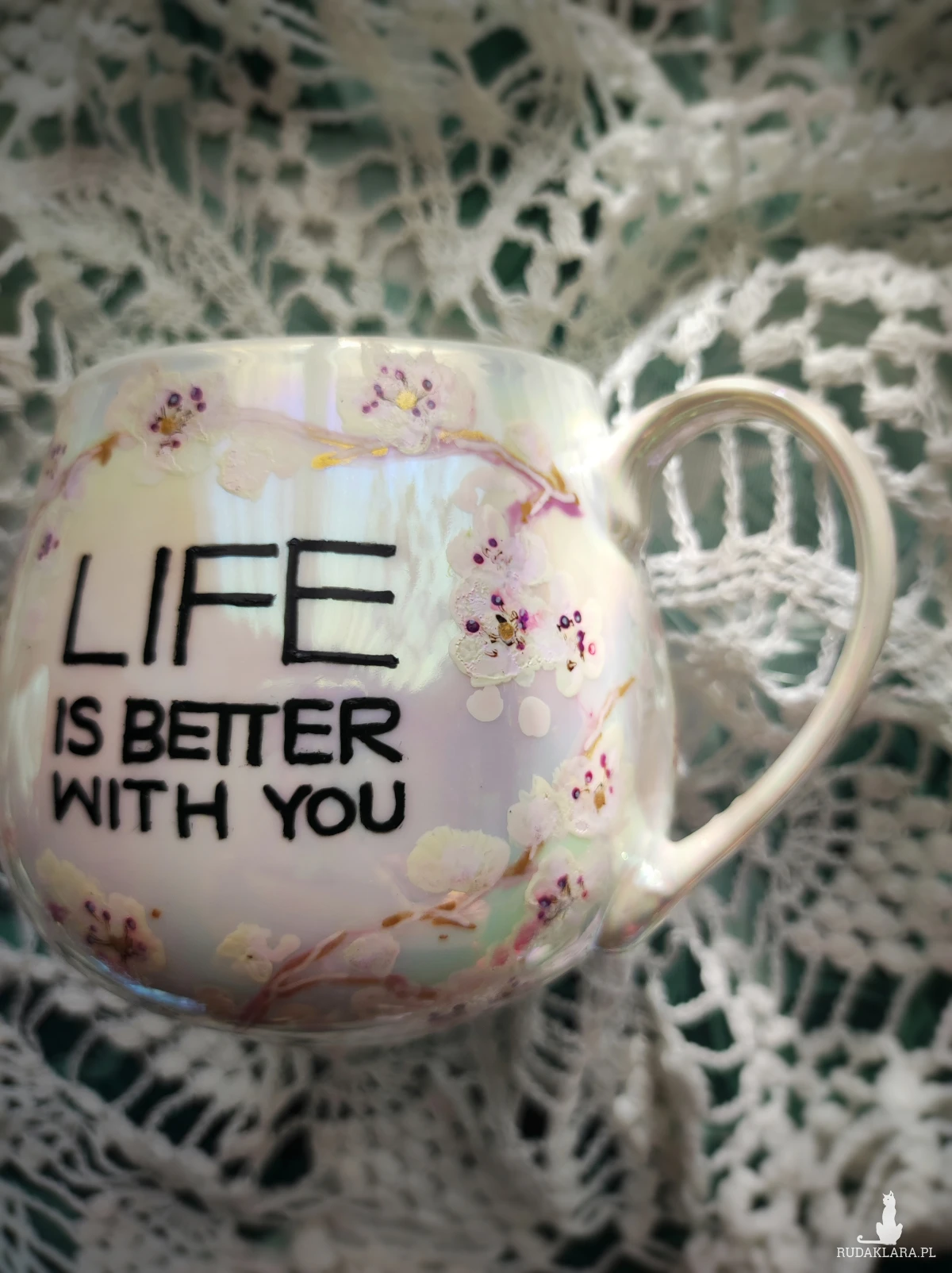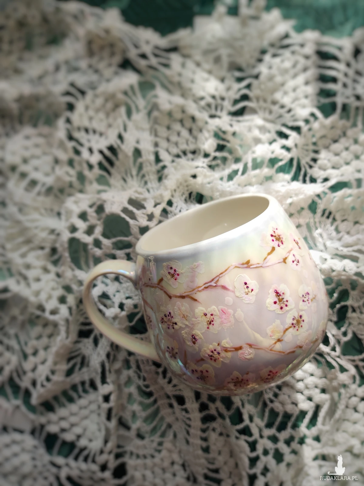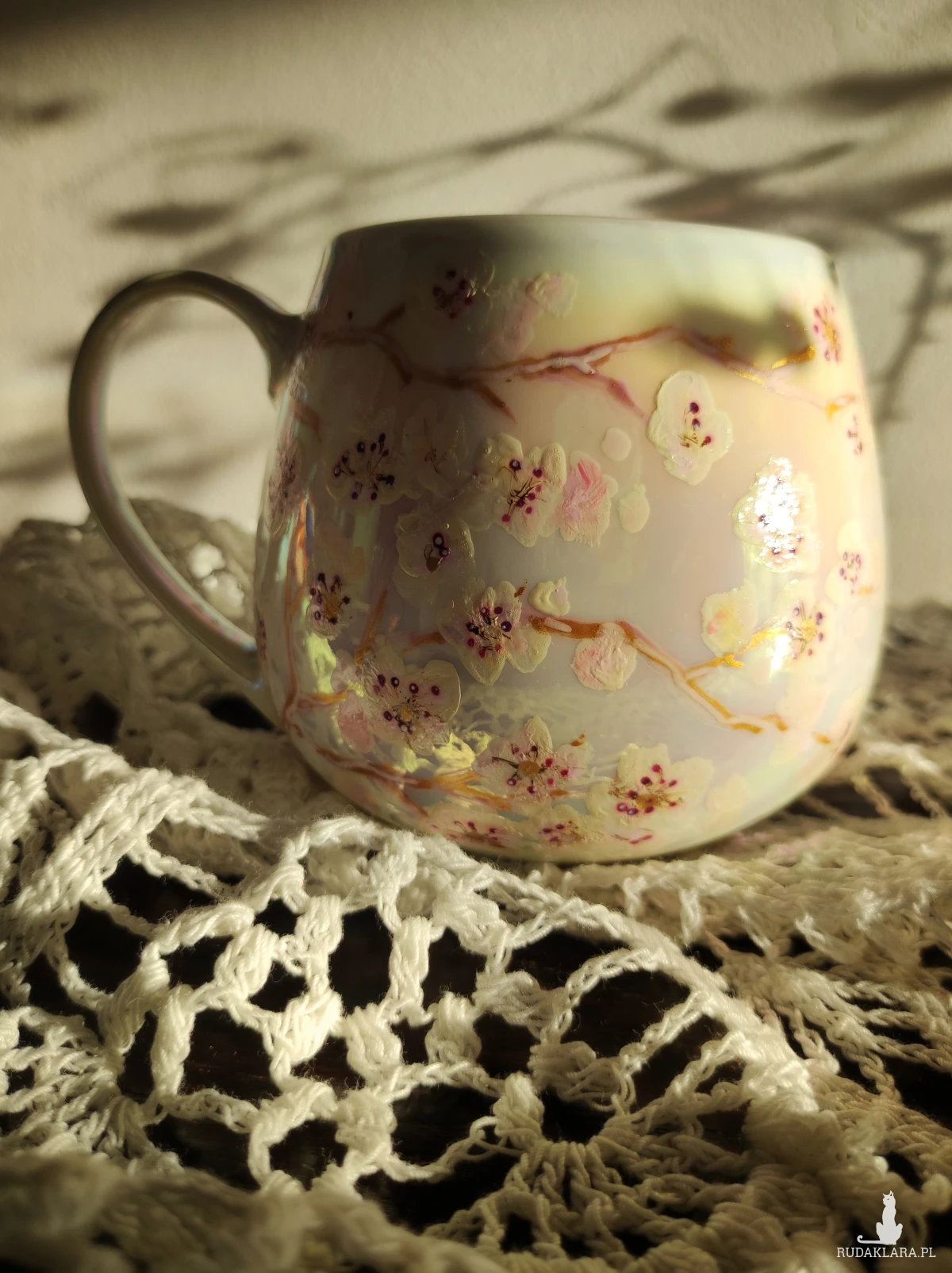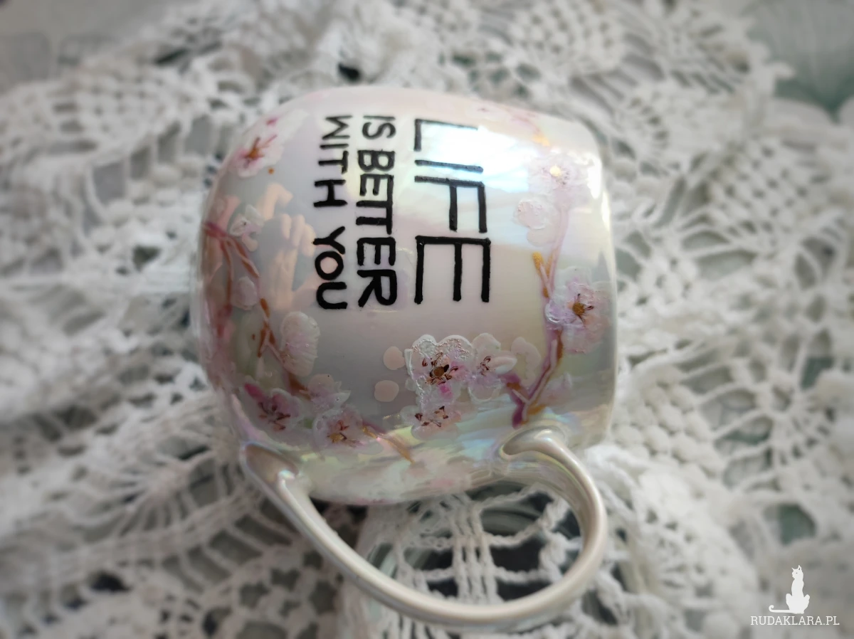Ręcznie malowany kubek w pastelowych kolorach, z kwiatowym wzorem będzie doskonałym podarunkiem dla osoby kochającej wyjątkowe przedmioty. Możesz go wręczyć osobie, której obecność w swoim życiu szczególnie doceniasz, jako wyraz przyjaźni czy miłości. Wzór wykonany został przy użyciu nietoksycznych farb do porcelany, jest wodoodporny - naczynie może być myte ręcznie, bez użycia ostrych narzędzi. Powierzchnia kubka delikatnie perłowo opalizuje.