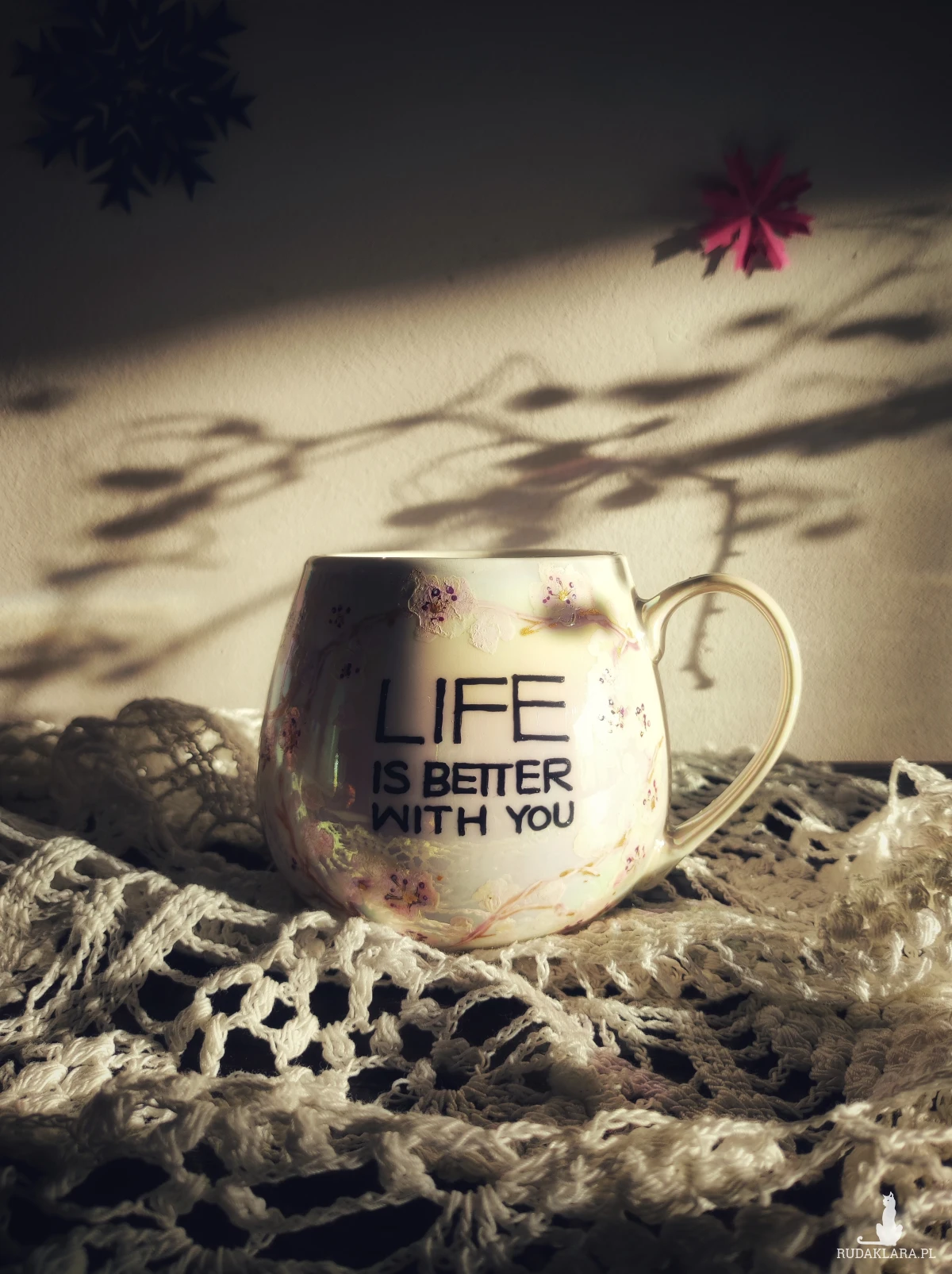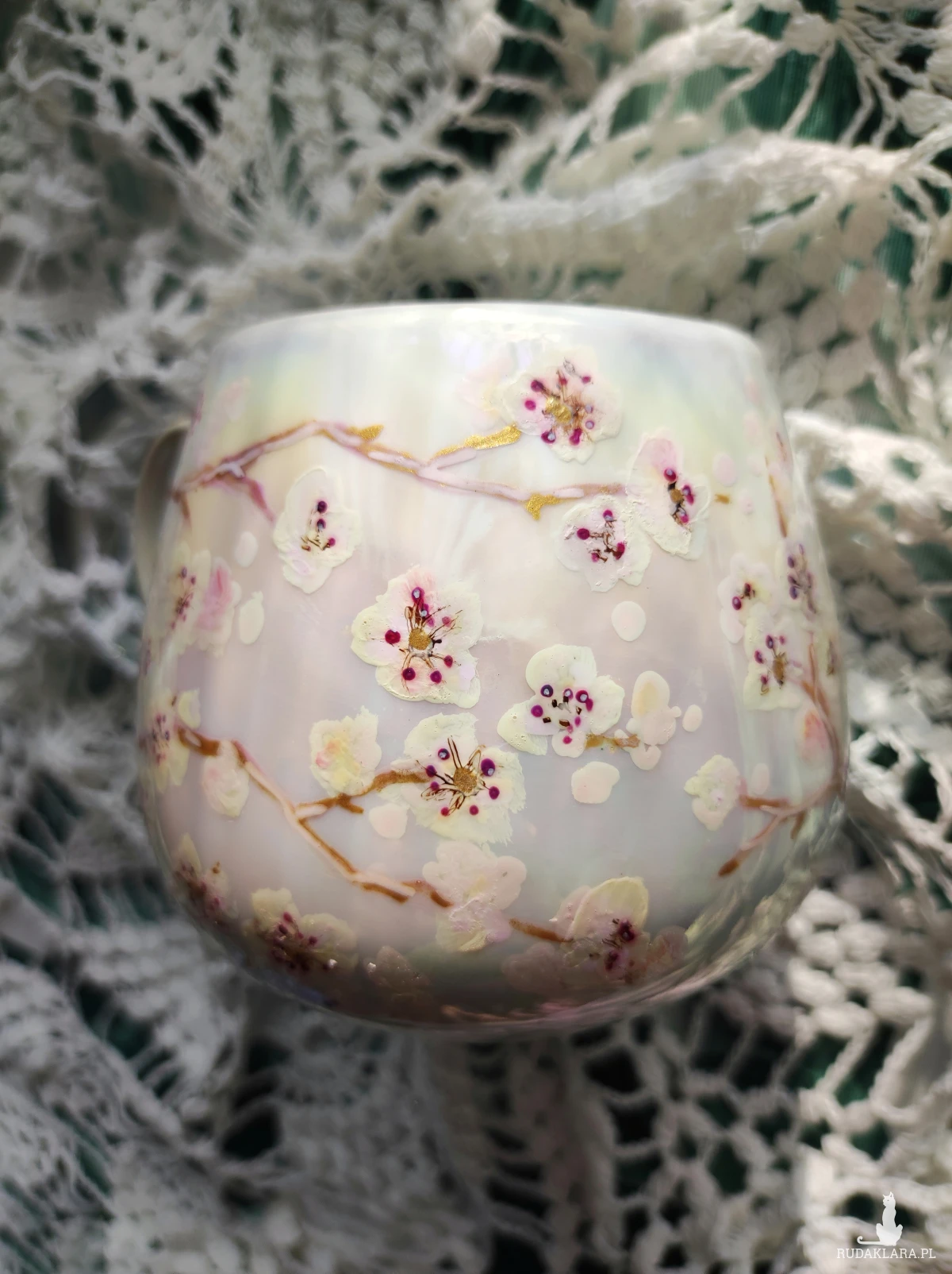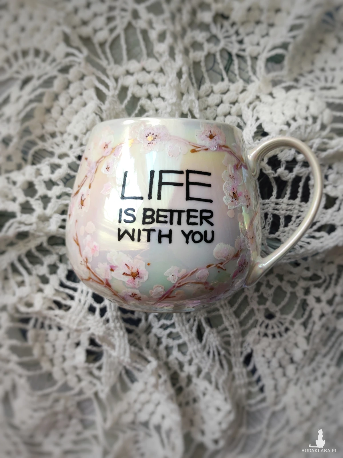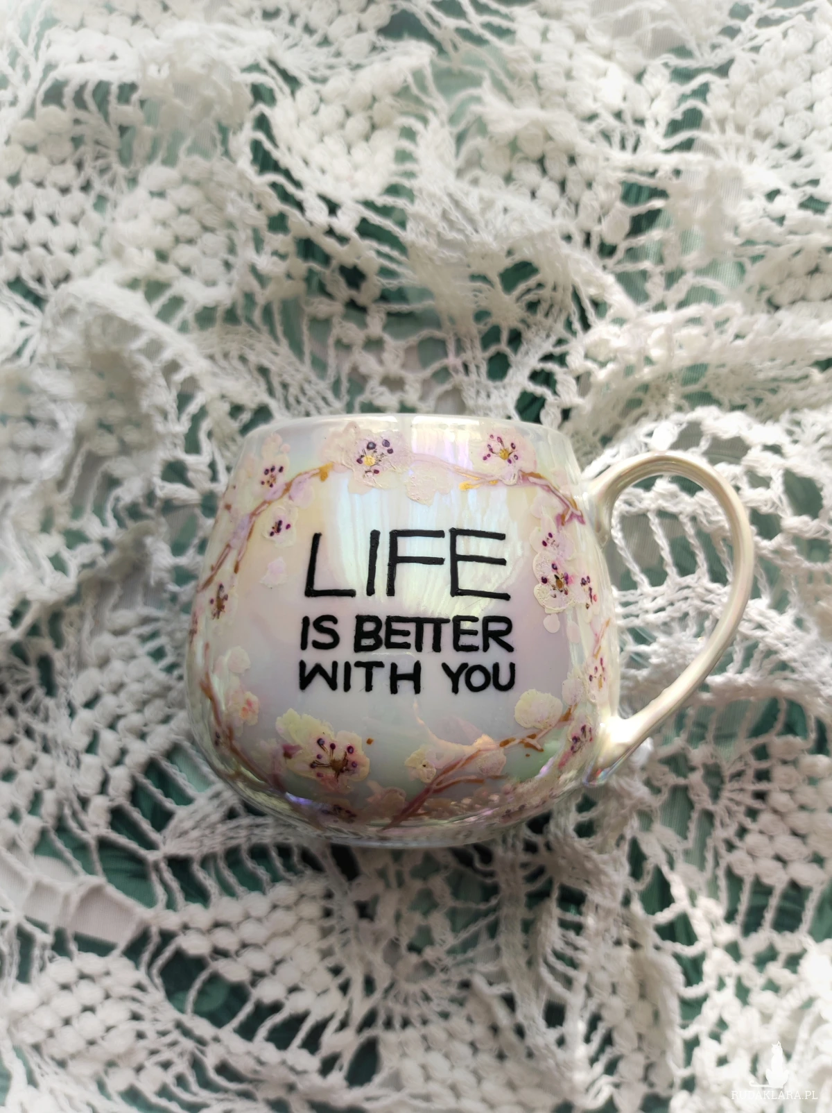 Ręcznie malowany kubek w pastelowych kolorach, z kwiatowym wzorem będzie doskonałym podarunkiem dla osoby kochającej wyjątkowe przedmioty. Możesz go wręczyć osobie, której obecność w swoim życiu szczególnie doceniasz, jako wyraz przyjaźni czy miłości. Wzór wykonany został przy użyciu nietoksycznych farb do porcelany, jest wodoodporny - naczynie może być myte ręcznie, bez użycia ostrych narzędzi. Powierzchnia kubka delikatnie perłowo opalizuje.