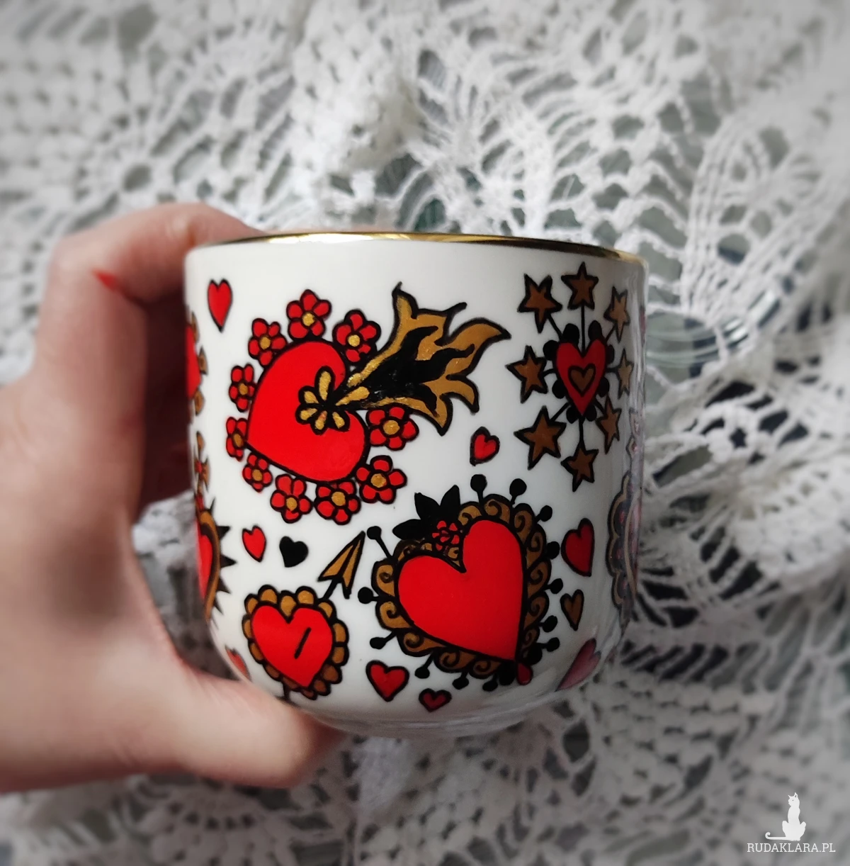 Ręcznie malowany kubek w żywych kolorach, z oryginalnym wzorem będzie doskonałym podarunkiem dla osoby kochającej oryginalne przedmioty. Wzór wykonany został przy użyciu nietoksycznych farb do porcelany, jest wodoodporny - naczynie może być myte ręcznie, bez użycia ostrych narzędzi.